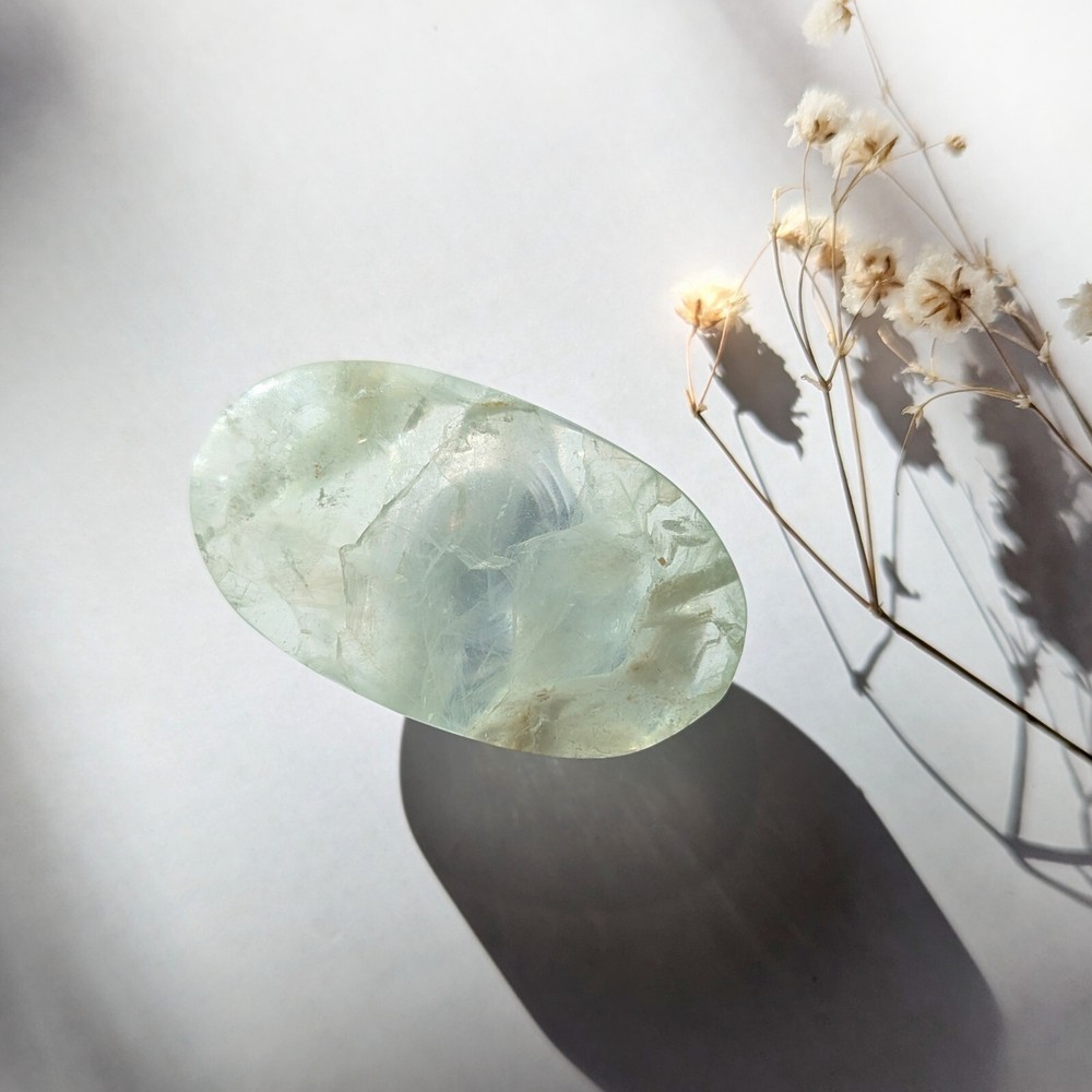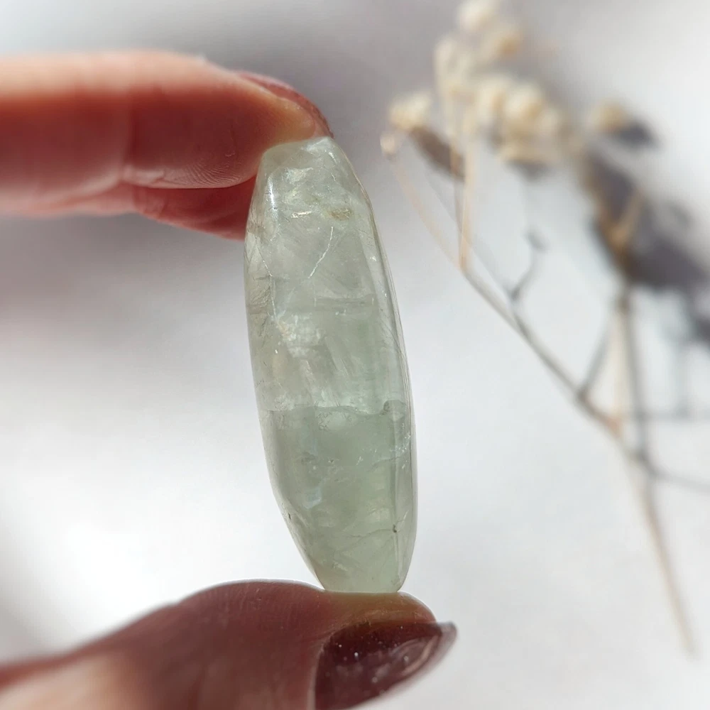 please read entire description! very stunning piece of translucent minty green fluorite. has some white inclusions, perhaps calcite? fluoresces bright blue under UV light. has lots of little shimmers and some interior rainbows. a really pretty one. 2" long, please see last photo for size reference. crystals are from mother nature and polished by humans, so minor imperfections exist that make them all the more charming! photos are taken in natural lighting and edited to look true to life, while videos are unedited. please note that colours may appear different on various screens. item will dispatch for shipping between 1-3 business days. please ensure that your address is correct, i am not responsible for mail mishaps. all sales are final. thanks for looking ~