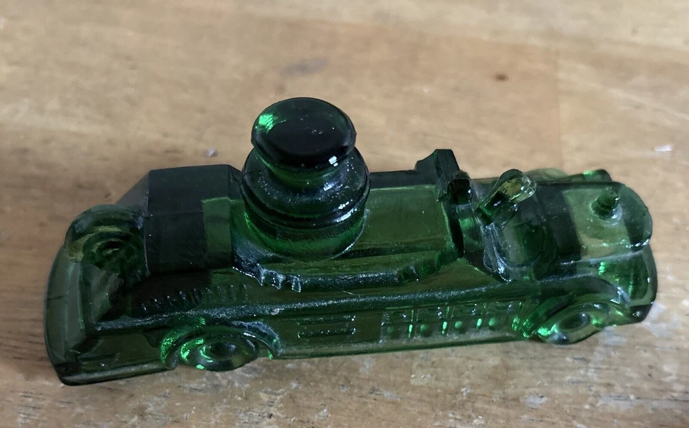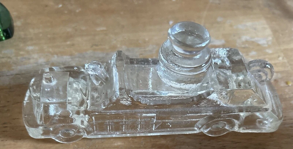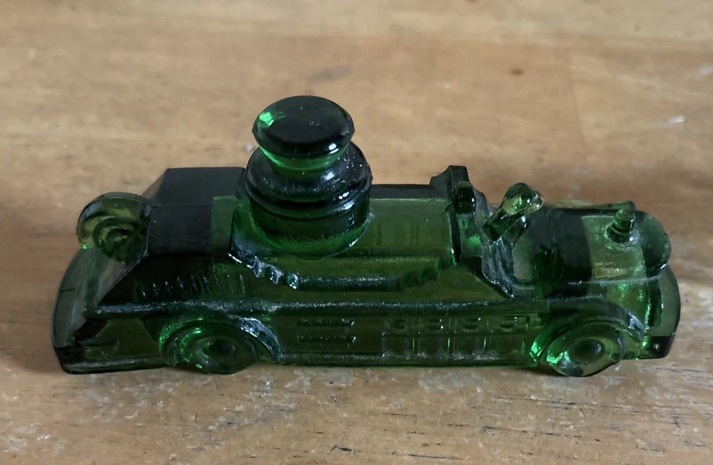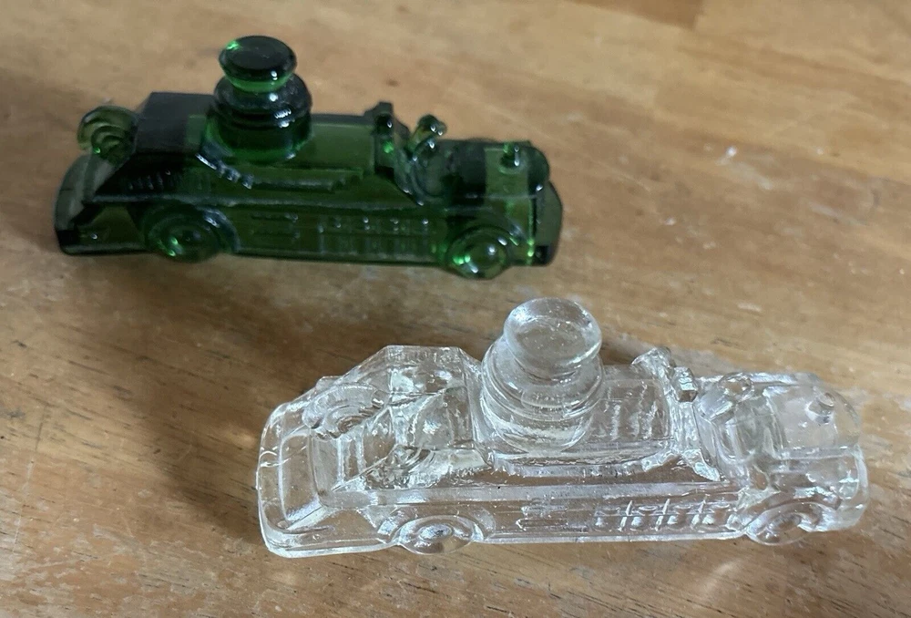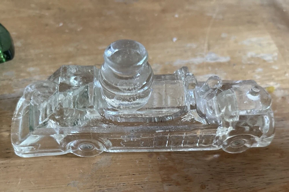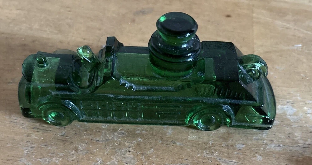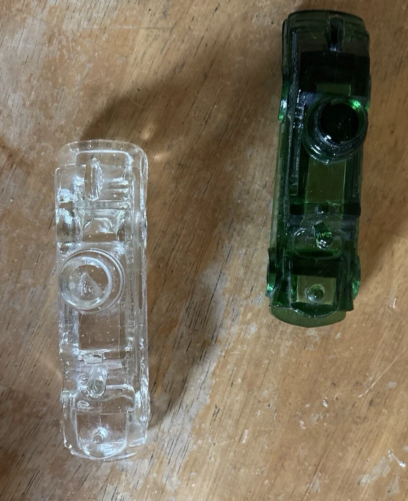 2 Fire Engine Truck Glass Toy Candy Container Emerald Green Clear Vintage Toy glass candy containers in the form of fire engine trucks. One is green and the other is clear. The clear one has "Taiwan" in the mold mark, the green one has no marks. Measure about 4 7/8" x 1 1/4" x 2". Have been pre-enjoyed and the clear is rough to the touch on the edge seam marks, whereas the green one is super smooth on the edges. I think the clear one is a reproduction and the green one is vintage. Please feel free to email your questions and take a look at my other items to combine shipments and save on postage cost. Shipping in US only.