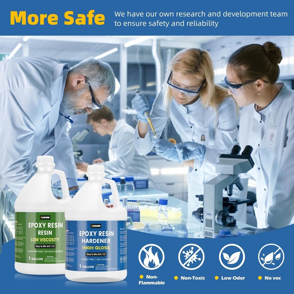 2 Gallon Crystal Clear Resin Kit,No Bubble & Not Yellowing Epoxy for Coating, Casting, Table Top,DIY, Bar Top, River Tables, Resin Art, Wood with High Gloss Finish Product Details Size: 2 Gallon Kit Brand: TAKIMO MPN: C-1G UPC: Does not apply EAN: Does not apply Brand: TAKIMO Specific Uses For Product: Fabric, Art, Craft, Table Top Coating, Countertop, Painting, Wall Art, Jewelry, Woodworking, Carpentry, Furniture, Wood See more Material: Epoxy Resin Compatible Material: [Multiple Materials] Item Form: Liquid Brand: TAKIMO Specific Uses For Product: Fabric, Art, Craft, Table Top Coating, Countertop, Painting, Wall Art, Jewelry, Woodworking, Carpentry, Furniture, Wood Material: Epoxy Resin Compatible Material: [Multiple Materials] Item Form: Liquid Special Feature: Dries Clear, Fast Drying, Non Toxic, Self Leveling, Strong Color: Clear Item Package Quantity: 1 Package Information: Bottle Item Volume: 1 Gallons Viscosity: Moderate Full Cure Time: 24 Hours Water Resistance Level: Water Resistant Unit Count: 256.0 Fluid Ounces Manufacturer: TAKIMO Package Dimensions: 13.35 x 12.13 x 6.85 inches Item model number: C-1G Item Weight: 18.24 pounds Date First Available: September 5, 2023 EASY TO USE & FASTER CURE Our kit include 1 gallon clear resin and 1 gallon clear hardener.As long as mixing 1:1 ratio by volume of the resin and hardener,it cures quickly within 8-24 hours.Requires no experience, even if you are new to resin.To make a perfect finish in cold weather:Prewarm resin and hardener before using. NO BUBBLES AT All - Our brand cares a lot about user experience, so we have changed the formula to add defoamer for this purpose,which can prevent air bubbles as well as stronger defoaming ability, recommended each layer no more than 1/4 inch,can be completely eliminated within one hour.Also,our epoxy kit is non-toxic,odorless and non-flammable,more safe than others. SUITABLE FOR BEGINNERS & PROS - 40 minutes working time allows you to create what you want,after this time it becomes scratch resistant, advanced additive resistant to heat up to 203F (95C). Our casting and coasting resin are suitable for All kinds of DIY craft projects such as making jewelry, coasters, tumbles, table tops, countertop, painting, etc. And it fits perfectly with silicone molds, not causing molds tearing. WHY CHOOSE US We are an experienced manufacturer specializing in resin development and production. To ensure optimal results, always follow the instructions carefully and conduct a small test before full application. This helps avoid common resin issues, such as curing problems.