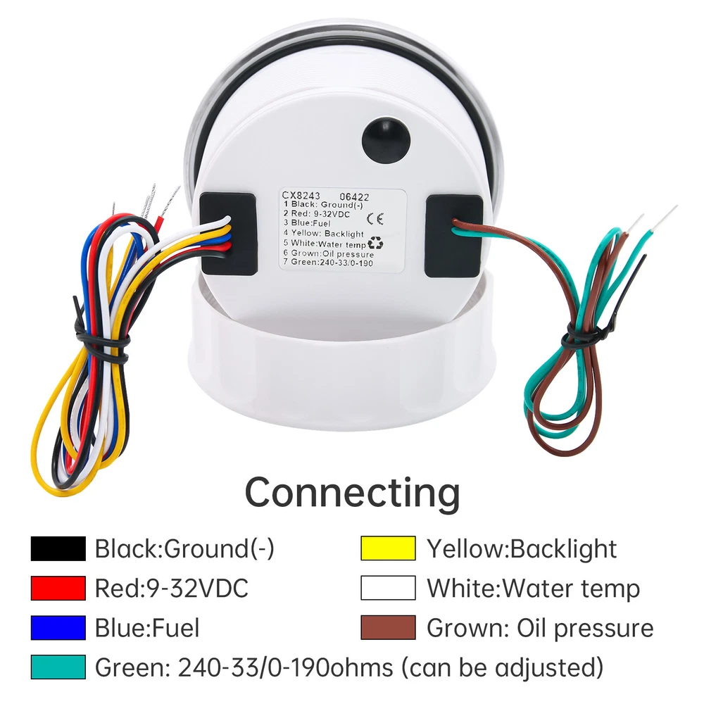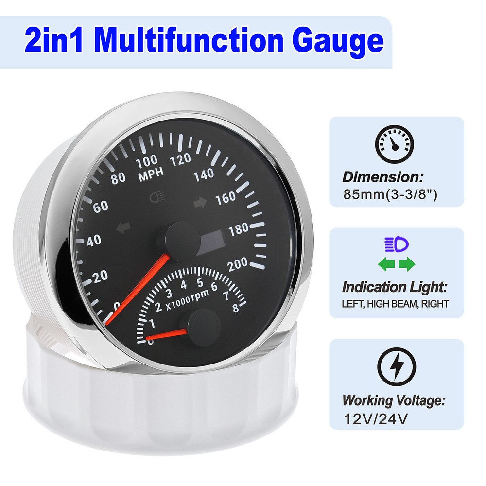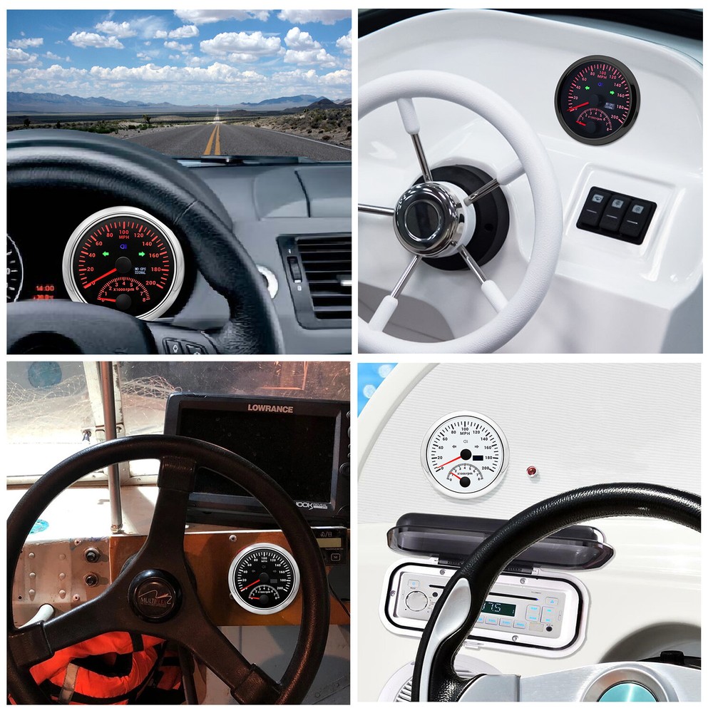 2 Gauge Set 85mm GPS Speedometer 0-200MPH & 4IN 1 Fuel/Water Temp/Oil Press/Volt 2 Gauge Set with Senders 85mm GPS Speedometer 0-200MPH with 85mm Fuel Level Water Temp Oil Pressure Volt For Car Boat Features: Suitable for all vehicles and off-road vehicles The signal comes directly from the satellite signal receiver(GPS Antenna), don't need other speed sensor. The gauge has the advantages of high precision, quick location confirmation and short start up time. IP67 waterproof and dustproof grade Reverse polarity protection and anti-fogging performance Stepper motors used for full range of stepping gauges, great feature with its less power consumption, longer life, higher precision, etc. Most importantly, the gauge is easy to setup, and can be used in all vehicles, boats and off-road vehicles. Speedometer Specifications: Application: Universal fit for Motorcycle/ Boat/Truck/Bus/Car Electronic Speedometer (stepper motor) No Mechanic Sensor, get speed signal from GPS Speed ≠0 and show accurate speed in tunnel with the help of accelerometer Total Mileage Adjustable GPS Blind Area Odometer Compensation OverSpeed Buzzer Alarm (Value Adjustable) Indication Light (Left, Right and High Beam Installation Diameter: 85mm (3 3/8") Speed Range: 0~200MPH RPM Range : 0~8000RPM Mileage Range: 0-99999.9miles Working Voltage: 12V/24V Working temperatures: - 40 to 85°C Protection rank: IP67 Waterproof Reverse polarity protection and anti-fogging performance 4 IN 1 Gauge Technical Data: Fixing dimension: 85mm Indicating Range: Oil press. meter: 0-150PSI Water temp. meter: 100-250℉ Fuel level meter: 0-190ohms/240-33ohms, empty-full; The signal can be adjusted Voltmeter: 8-16V Working Voltage: 12V Input Signal: 10-184ohms for 0-150PSIoil pressure meter; 0-190ohms for fuel level meter;(Default 0-190ohms, can adjust to 240-33ohms) 8-16V voltage meter; Input Signal 320-22ohms for water temperature meter Red backlight Protection grade is IP67, the whole body is completely waterproof; Excellent antifogging function; 316 Stainless steel bezel with curved glass; Convenient Installation by multi-plug socket connecting way; Accessories: matched with connectors, Installation Instruction Package Included: 1 x 85mm 4 in 1 Multifunctional Gauge 1 x 85mm GPS Speedometer Gauge 1 x GPS Antenna 1 x M16*1.5 Tacho Sensor 1 x 1/8NPT Oil pressure Sensor 1 x 1/8NPT Water Temp Sensor 2 x Cable 2 x Installation Instruction