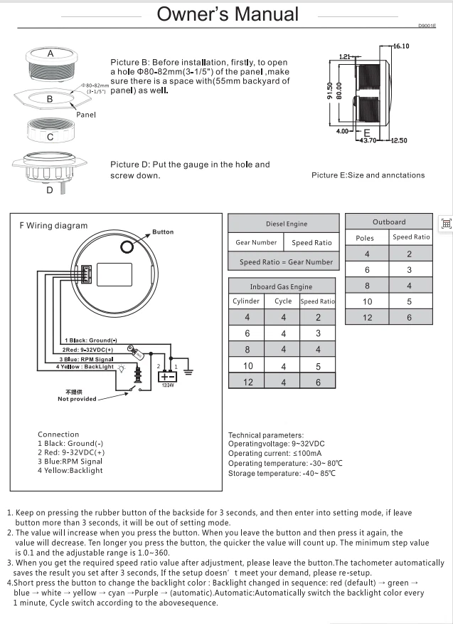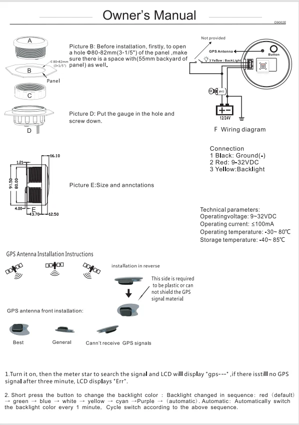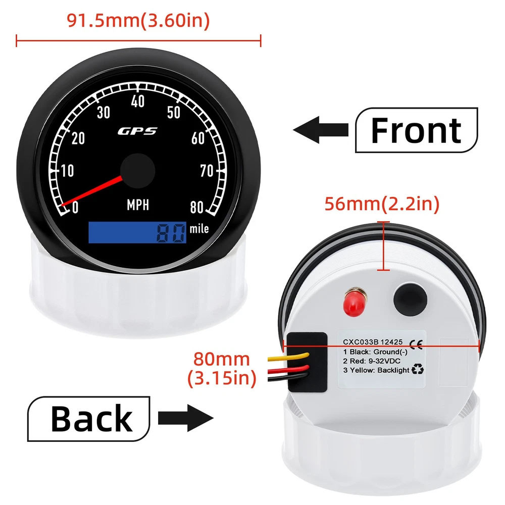 2 Gauge Set Waterproof 80mm GPS Speedometer 80MPH&Tachometer 80000RPM Gauge 2 Gauge Set Waterproof 80mm GPS Speedometer 80MPH & 80mm Tachometer 80000RPM Gauge For Car Boat Feature: High-brightness LED backlight. 316 stainless steel for long-term use even in acid-base,humid environment. IP67 waterproof and dust-proof grade. With curved glass( with anti-fog function). Suitable for all kinds of vehicle modification. Using stepper motor drive pointer, accurate display of the engine speed, and with the LCD display clear display mileage. Gauges have many kinds backlight color (red,yellow,orange,green,blue,purple,white),customers can adjust any color that you like GPS Speedometer Gauge Install Diameter:Φ80mm or 3.15" Signal:GPS Working Voltage: 9~32V DC Size:12x8x12cm/4.72x3.1x4.75 inch Indication Range:0-80MPH Backlight:7 Colors Backlight Colors:Black Tachometer Install Diameter: Φ80mm or 3.15" Engine hours: 0.0-99999.9H Backlight :7 Color backlight Indicating Range: 0~8000RPM Signal:Pulse For Tachometer,you can substitute for different unit, please contact us before / after purchase or note on the order. Package Includes: 1X 80MM GPS Speedometer Gauge 1X GPS Antenna 1X 80mm Tachometer 2X Installation Instruction