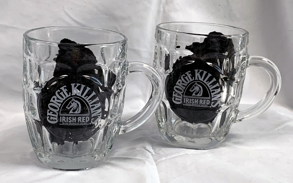 2 pre owned George Killians Irish Red beer mugs They measure 4.75" tall and hold 18 oz Front is etched with the logo Bottom marked France They have a few light scuffs Look hardly used