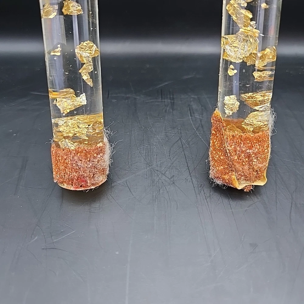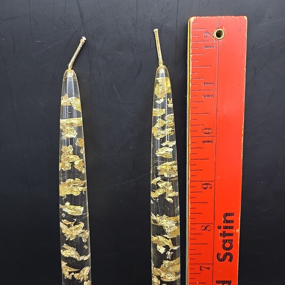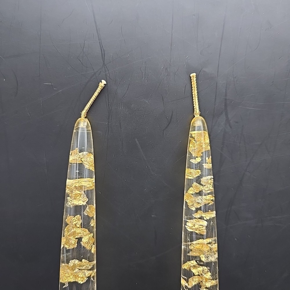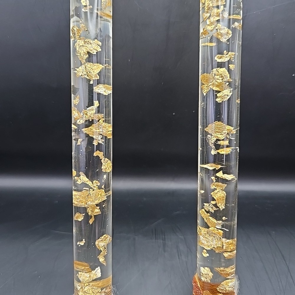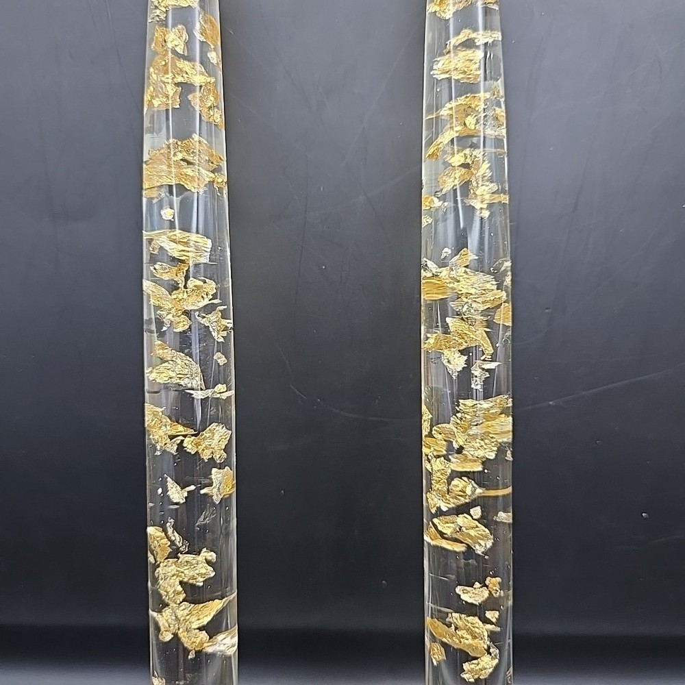 Pair (2) 12" Clear Resin With Gold-Leaf Flakes Decorative Candles, not meant to be burned