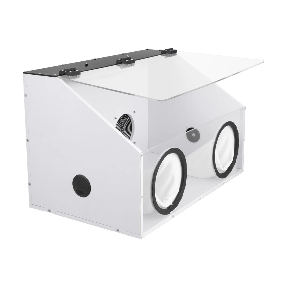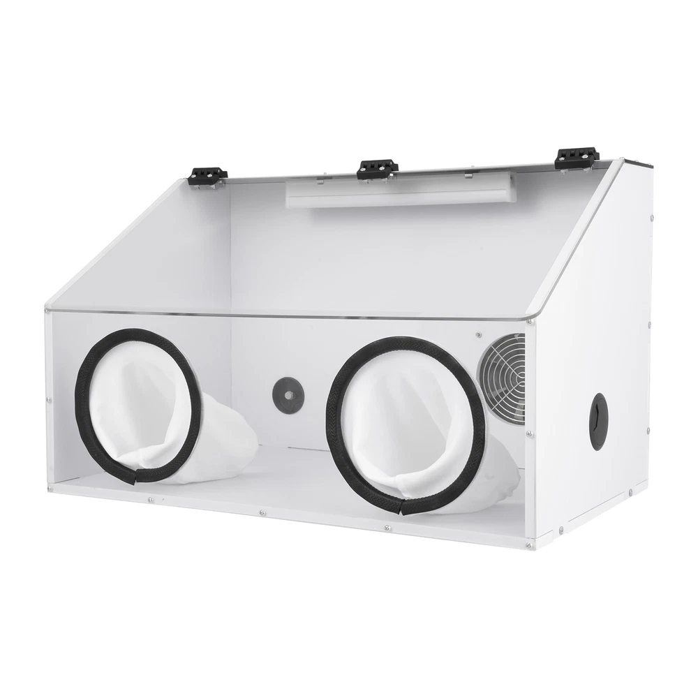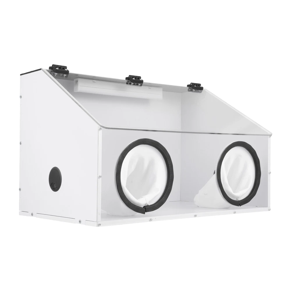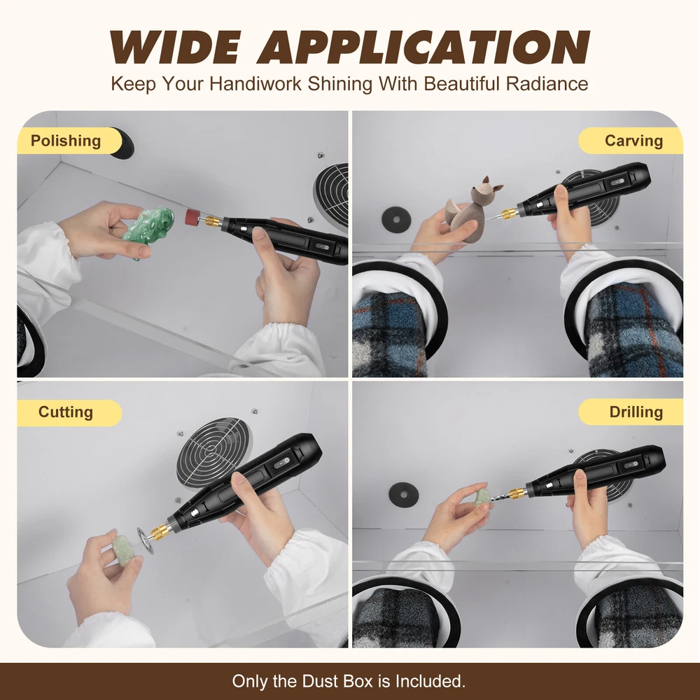 Description Uses: for Text to Play the Polishing Engraving Operation, Help to Reduce Noise and Prevent Dust Flying, Reducing the Ambient Air to Small Particles of Dust, Thereby Reducing Damage to the Respiratory System. Man Playing Can Also Reduce Dust Particles in Your Eyes, Face, Protect Their Own Safety. Using Injection Molding Hot Pressing Process,More Smooth and Durable.due to the Material of Acrylic Itself,Moulding Plate Generally Have About 0.3mm Tolerance. Parameter: Name: Dust Box Size:580x 350x 350mm Material: 10mm Thick Pvc Board, 4mm Plexiglass Board Voltage:110v Package Include: 1 Set of Dust Box 1 Blower 2 Holes Electric Fully Enclosed Grinding Polisher Acrylic Dust Box Cover W/LED Description If you are engaged in polishing and carving operations, the 2-hole table polisher dust box will help you a lot. It has excellent closed design and dust absorption , which can prevent dust from entering your eyes, nose and mouth, and protect your health and safety. In addition, the dust box also has high visibility, making it convenient for you to observe the situation of internal situation and better grasp the operation progress. Choose this dust box to keep your antiques shining with beautiful radiance! Key Features Sturdy & Durable: Reinforced with 0.41inc h PVC board and 0.15inch plexiglas board, it is very light ( 11lbs ), sturdy, smooth, and durable, allowing for long periods of use . User-friendly Design: To ensure your safety and health, the box is adopted a closed design that effectively blocks particles such as dust from entering your eyes, mouth or nose, ensuring your comfortable experience. High Visibility: Its transparent lid allows you to clearly observe all details during use. The product is equipped with energy-saving, eye-friendly LED light, which can operate normally even in low light environments . Convenient Design: The package includes all parts, and the overall structure is fixed with precise screws. Therefore, the box can be repeatedly installed and disassembled, making it more convenient to use or store. Clean Maker: Its small internal fan ( 5500r/min ) can effectively suck dust into the dust bag (3.5ft), which can easily collect these small particles and save you time cleaning dust. Low Noise: Due to its closed design, it can effectively isolate operating sounds and reduce noise during the use. It can create a quiet environment, so you can operate with peace of mind no matter when or where you are. Easy to Operate: The box provides ample operating space ( 22.8*14.37*14.37in ) and ideal cuff diameter( 6.7in ), making it easy for you to operate inside the box. Satisfaction Guarantee: No matter what problem you encounter or have any questions, please contact us. We will reply and solve the problem for you as soon as possible. Details Hinge Connection: The hinge connection makes the opening and closing more stable and firm. Its installation does not require glue, which is convenient and effortless . Threading Hole: The hole ( 1.96in ) facilitates the power lines to be threaded into the box, preventing line entanglement . Cotton Cuffs: The cotton cuffs are more skin friendly, providing a comfortable operating experience. Application It can be used for carving, cutting, drilling, polishing, milling, grinding, brushing and descaling of dentures, jewelry, jade, stone carving, wood carving and handicrafts . Specification Material: PVC, Plexiglas Board Color: White, Clear Shape: Rectangular Process: Injection Molding Hot Pressing Type: Toolbox Number of Holes: 2 Input: AC100-240V, 50-60Hz Output: 12V, 2A Plug: US Standard Fan Power: 5W Fan Speed: 5500r/min Fan Diameter: 12cm/4.72in PVC Board Thickness: 1.05cm/0.41in Plexiglas Board Thickness: 0.37cm/0.15in Cuff Diameter: 17cm/6.7in Threading Hole Diameter: 4.97cm/1.96in Dust Bag Length: 106.5cm/3.5ft Top Width: 10.8cm/4.25in Front Board Height : 21.3cm/8.39in Package Size: 72.3*45*11cm/28.5*17.7*4.3in (Large); 26*17*20cm/10.2**6.7*7.87in (Small) Product Size: 58*36.5*36.5cm/22.8*14.37*14.37in Net Weight: 4.45kg/9.81lbs (Large); 0.6kg/1.32lbs (Small) Gross Weight: 5.35 kg/11.8lbs (Large); 0.75kg/1.65lbs (Small) Package Included 1* 2-hole Table Polisher Dust Box 1* Fan 1* LED Light 2* Power Cords Other Accessories for Installation Notes Please note that the commodities with fan models are shipped in two packages, a large (dust box, screws, LED light), and a small (inside fan, dust bag), so that the packaging is to prevent the collisions of accessories and plates during transportation. Please be ware of electrical safety hazards. Please use such tools by the product instructions and take the necessary personal protective measures, and place them out of the reach of children daily. Please allow the slight color difference caused by the shooting light and 1-3cm error due to manual measurement, and make sure you do not mind before ordering. Payment Delivery details Terms of sales About us Contact us Payment We accept ebay payment 。 Fees such as import duties, taxes are not included in the item price or shipping costs. These charges are the buyer's responsibility. Delivery details Shipping: 2-9 working days to: USA Terms of sales We maintain high standards of excellence and strive for hundred percent customer satisfaction. Feedback is very important to us. We hope that you contact us immediately before you give neutral or negative feedback, so that we can address your concerns. It is impossible to address issues if we do not know about them! About us Your satis faction is our ultimate goal. We work hard to earn your trust and future business. Our certified technicians have tested each item before shipping. The unit comes with 1 year limited warranty on all manufacturing defects. a) If you receive a defective item, you may return it or ask for a discount. Please contact us within 14 days after you receive the package. b) What you returned must be intact and in its original packaging as re? u. Customer is responsible for shippi