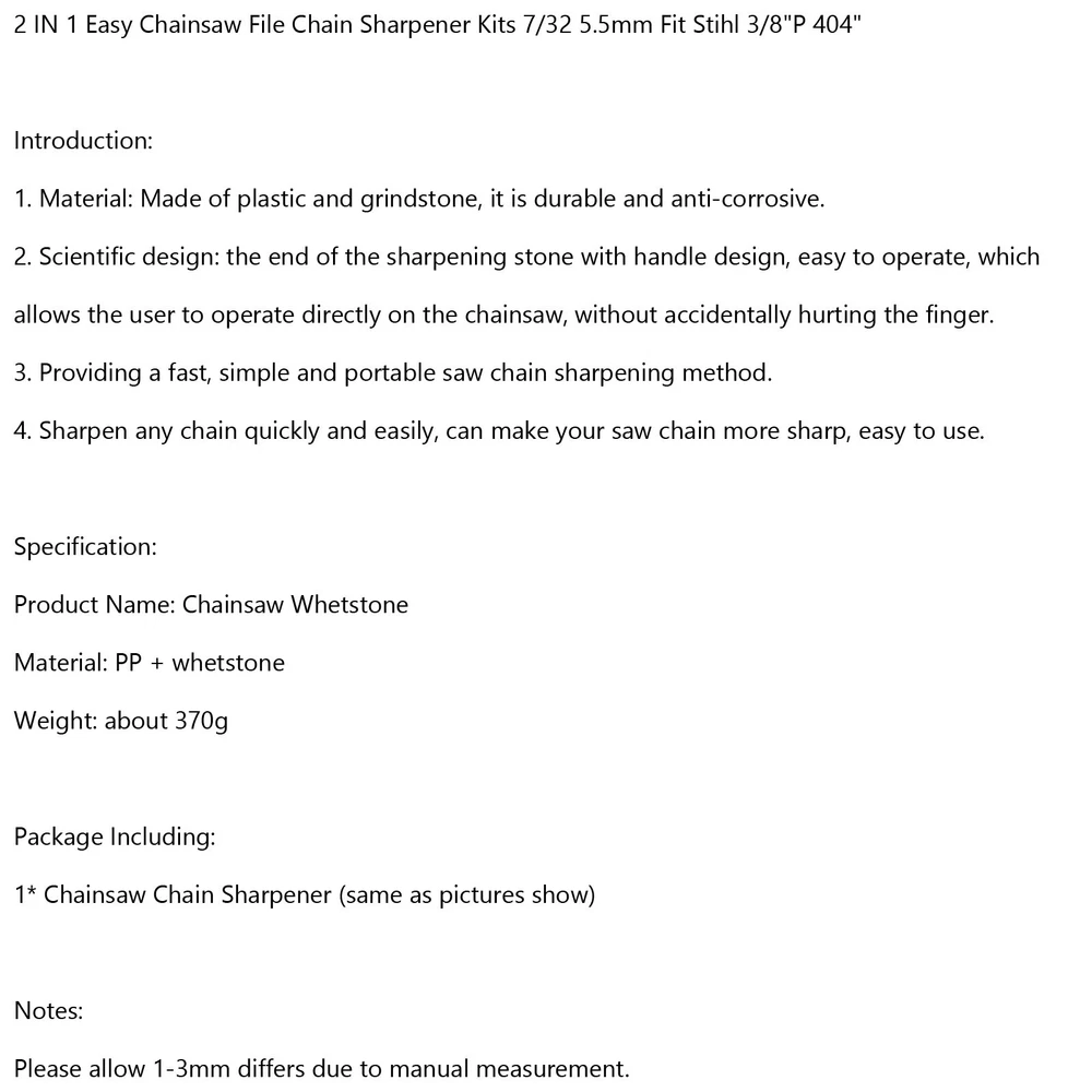 22" Chainsaw Saw Chain 325 pitch .058 gauge 86DL Drive Links Spare Replacement 22.68 USD 23.87 USD Free shipping 5% off 2 IN 1 Easy Chainsaw File Chain Sharpener Kits 7/32 5.5mm For Stihl 3/8"P 404" 21.87 USD Free shipping 16" Chainsaw Guide Bar Chain 3/8" .050" Gauge 56DL Fit Craftsman Echo Poulan 35.87 USD Free shipping 2 In 1 Easy File Chainsaw Chain Sharpening Tool Fit STIHL 13/64" 5.2mm Replace 28.38 USD 29.87 USD Free shipping 5% off 2 IN 1 Chainsaw Teeth Quick Sharpener File Fit STIHL .325" 4.8mm Chain 29.87 USD Free shipping 2 In 1 Easy File Chainsaw Chain Sharpening Tool Fit STIHL 4mm 3/8LP Picco 91 90 29.87 USD Free shipping 4-5.5mm 2 IN 1 Easy Chainsaw File Chain Sharpener Kits Fit Stihl 28.38 USD 29.87 USD Free shipping 5% off 14" Chainsaw Guide Bar 501959252 3/8" .050 gauge 52 Drive Links Fit Husqvarna 35.87 USD Free shipping 24" Chainsaw Saw Chain 325 pitch .058 gauge 94DL Drive Links Spare Replacement 35.03 USD 36.87 USD Free shipping 5% off 14-20" Chainsaw Teeth Sharpener Saw Chain Blade Fast Sharpening Stone System US 21.73 USD 22.87 USD Free shipping 5% off Carburetor Fit Zama Husqvarna 240 240E 235 E 586936202 C1T-W33 21.87 USD Free shipping 2 IN 1 Chainsaw Teeth Quick Sharpener File For STIHL .325" 4.8mm Chain 28.38 USD 29.87 USD Free shipping 5% off 4-5.5mm 2 IN 1 Easy Chainsaw File Chain Sharpener Kits For Stihl 21.87 USD Free shipping 20" Chainsaw Carrying Bag Holdall Box Chain Saw Portable Green 19.87 USD Free shipping 20" Chainsaw Saw Chain 325 pitch .058 gauge 76DL Drive Links Spare Replacement 18.88 USD 19.87 USD Free shipping 5% off SAFE & SECURE SHOPPING 100% SATISFACTION GUARANTEED FAST SHIPPING 2 IN 1 Easy Chainsaw File Chain Sharpener Kits 7/32 5.5mm Fit Stihl 3/8"P 404" Product Description 2 IN 1 Easy Chainsaw File Chain Sharpener Kits 7/32 5.5mm For Stihl 3/8"P 404" Introduction: 1. Material: Made of plastic and grindstone, it is durable and anti-corrosive. 2. Scientific design: the end of the sharpening stone with handle design, easy to operate, which allows the user to operate directly on the chainsaw, without accidentally hurting the finger. 3. Providing a fast, simple and portable saw chain sharpening method. 4. Sharpen any chain quickly and easily, can make your saw chain more sharp, easy to use. Specification: Product Name: Chainsaw Whetstone Material: PP + whetstone Weight: about 370g Package Including: 1* Chainsaw Chain Sharpener (same as pictures show) Notes: Please allow 1-3mm differs due to manual measurement. SHIPPING RETURNS WARRANTY ABOUT US SHIPPING ♦Every item will be inspected and packed carefully before shipping. ♦The estimated delivery time is 7-10 working days . Please note that we do not handle any orders in weekend nor holidays, all orders come during weekends or holidays will be processed in next working day. ♦Please understand that once the order is accepted by courier, it's out of our control. Shipping could be delayed by various reasons such like the weather, strike, or anything unexpected, we don't take responsibility for delay due to "severe weather". ♦If you have not received it after 10 days , please contact us first, and then we will arrange to resend or refund to you asap. ♦Buyer is responsibility to the accuracy of eBay delivery address, and pay attention to the delivery updating(we guarantee all orders can be tracked online). Once the package forced to return to us due to wrong address or attempt delivery but failed over two times, we have no choice but ask buyer to pay second shipping charge, not to mention the terrible delay it caused. ♦Please be aware that your order could be putted on porch or at the front of door when nobody at home, in very rare instances, package could be stolen, we are sorry that the courier and us do not take any responsibility, as long as it's showing "delivered" in system, the only help we can offer is provide prooves when police need it. RETURNS ♦We offer 60 days return window , it means you could return the order freely in 60 days of purchase. Please note that it requires that item is unused/uninstalled/unmodified, as the same condition as it's delivered. Though, we hope every buyer could inspect the part as quick as you can, to confirm if the part is the right one you need and make an early decision. In case the item arrive directly to workshop, please tell merchanic to inspect it clearly before set it up so hurry. ♦If you have a defective item which you want to return or exchange, please contact us after you receive the package. We will refund or make a replacement depends on your requirement. ♦Generally, every refund request should have the purchased item returned to us. We strong recommend the return procedure inside ebay, it helps both seller and buyer process return smoothly. In cases buyer can provide photos/pictures as proof, showing the item is dead/malfunctioning, we fully trust our customers and will refund directly without ask for the item back. ♦All refunds will be issued once the item arrives at our warehouse. The refund will then be credited back using the same method as when your initial order was made. The processing time typical takes 3-5 working days. However, this can depend on your financial institution. ♦We do not accept returns if the item(s) has been used/installed, working properly but buyer decided to return, or has been modified for some reason after buyer have received the item(s). WARRANTY ♦ 60 Day Money Back Guarantee ♦The warranty does not extend to normal wear and tear of products; products damaged due to environmental conditions including rain, snow, hail, salt, or natural disasters; products damaged due to accident or collision; or product damage caused by other faulty parts. ♦All items must be in their original condition and must not be damaged due to incorrect installation upon return. Products damaged as a result of abuse, misuse, improper repairs or maintenance, improper installation, alteration, or modification will not be co