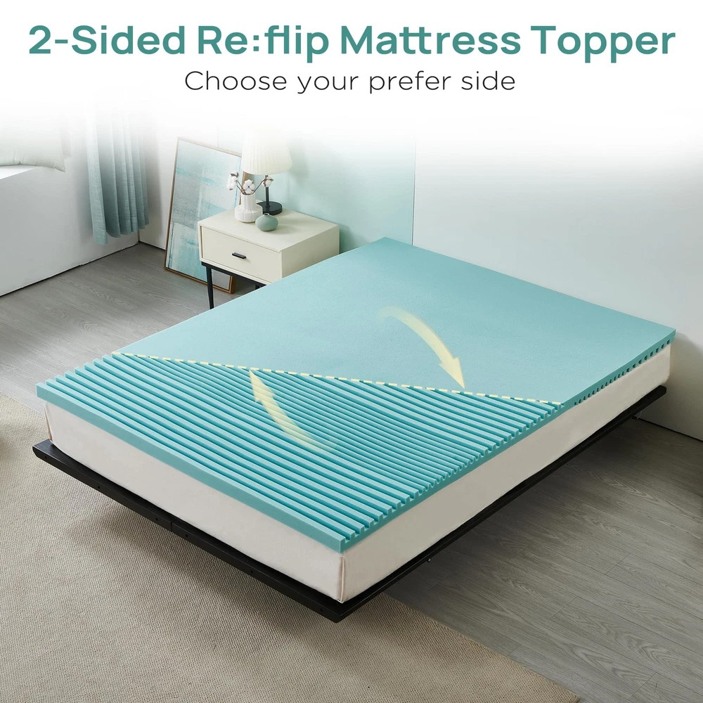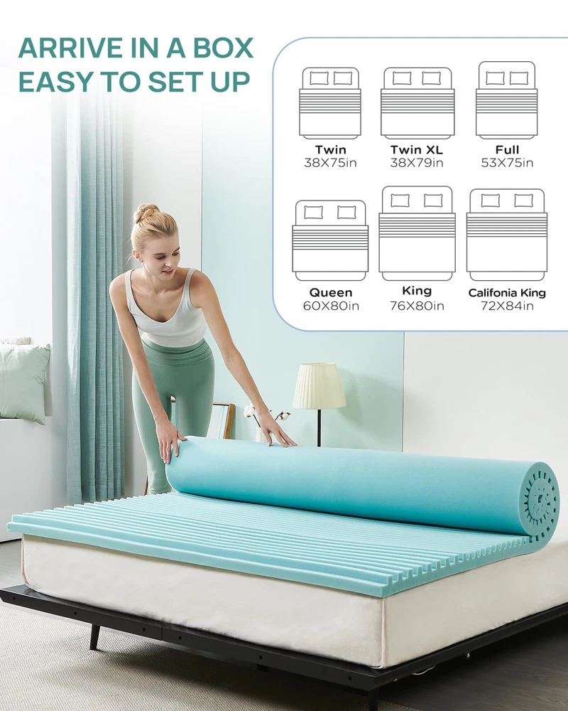 Upgrade your sleep with the Cooling Gel Memory Foam Topper, designed for ultimate comfort, support, and versatility. Featuring a unique 5-zone WAVE and CUBE Dynamic design, it provides targeted support for your head, shoulders, back, hips, knees, and feet, relieving pressure and promoting proper spinal alignment to ease back pain. Advanced cooling gel technology and innovative airflow channels ensure efficient heat dissipation, enhanced breathability, and temperature regulation, making it perfect for hot sleepers. Crafted from CertiPUR-US and OEKO-TEX certified materials, this skin-friendly topper offers a safe, healthy sleep environment for you and your family. Its dual-sided design lets you choose your preferred firmness, eliminating restless nights on an uncomfortable surface. Versatile and adaptable, it’s perfect for sofa beds, air mattresses, dorm rooms, RVs, or any space, with the option to trim for a custom fit. Delivered compressed in a box for convenience, it fully expands in 24–48 hours. Experience unparalleled comfort, support, and cooling with the mattress topper—your solution for a better night's sleep anywhere. 【Elevated Pressure Relief 5-Zone Design】- unique WAVE and CUBE Dynamic design divides the king size mattress topper into 5 zones, delivering targeted support for your head, shoulders, back, hips, knees, and feet. This innovative design helps easing body pressure and promotes proper spinal alignment, making it perfect for relieving back pain. No more pain sleep with cooling bed topper 【Next-Gen Cooling Gel Tech】- Our king mattress topper features advanced cooling gel technology, designed to efficiently dissipate heat for a cooler night's sleep. The innovative airflow channels enhance breathability and improve air circulation, keeping you refreshed throughout the night. Perfect for hot sleepers, this cooling mattress topper helps regulate temperature, reduce night sweats, and deliver a truly comfortable cooling sleep experience 【Ideal Support for Comfort】- The king memory foam mattress offers contouring support that adapts to your body’s curves, easing pressure and promoting deep sleep. Designed for all sleep positions—side, stomach, or back—it ensures lasting comfort throughout the night. With its dual-sided design, you can pick the side that best matches your comfort preferences, putting an end to restless nights on a mattress that’s too soft or too firm 【Certified Quality Materials】– Crafted from CertiPUR-US and OEKO-TEX certified materials, our king mattress topper is free from harmful chemicals and skin-friendly. Designed to provide a safe and healthy sleep environment, it’s perfect for you and your family. Experience the comfort and durability of cooling topper for a truly refreshing night 【Easy Set up & Multi-scene Use】- Enjoy enhanced sleep comfort anywhere with this versatile foam mattress topper. Ideal for sofa beds, air mattresses, floors, dorm room twin XL mattresses, queen-sized beds, or RVs, its adaptable design can easily be trimmed to fit your space. Conveniently delivered compressed in a box, it expands fully within 24–48 hours. Upgrade your sleep setup with this cooling gel memory foam topper, crafted to deliver superior comfort and support wherever you relax