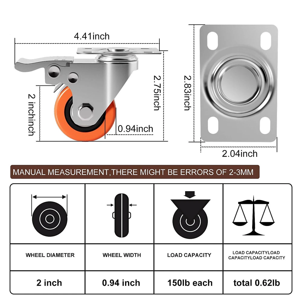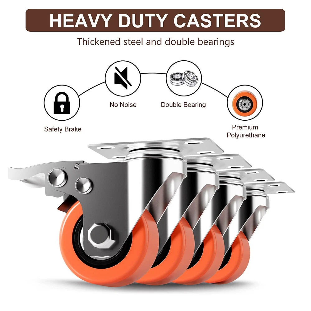 Double Ball Bearings & Heavy Duty - Our 2 inch heavy duty top plate swivel caster wheels can carry 150 Lbs.All the heavy-duty plate casters set of 4 are double steel ball-bearing designed, can support a load capacity of up to 600 Lbs. Double Safety Brake - Our top plate swivel caster wheels have double brake, it can brake the rotation direction of the bottom plate and the direction of the wheel forward, which is easy to operate.and also can effectively stop and prevent the device from moving and hurting others. Silent & Floor Protection - The high-quality polyurethane covering the steel wheels achieve smooth,quiet, and non-marking gliding experience on various flooring types.Wheels roll smoothly from indoor flat surface to outdoor rugged place.which will protect the floor. Smooth Rotation 360° Casters - Highly maneuverable casters let you turn easily.Swivel casters with ball bearings have smooth swiveling and protection from dust and debris, Enabling smoother swiveling and extending service life. Wide Application - they save mounting space and are suitable for baby beds, furniture,dressers,toolboxes, carts, speakers, cabinets, brackets,wooden boxes, desks,frames,BBQ desk,kitchen island,flight cases,instrument cases,various dollies,different equipment stands,light machinery,etc.