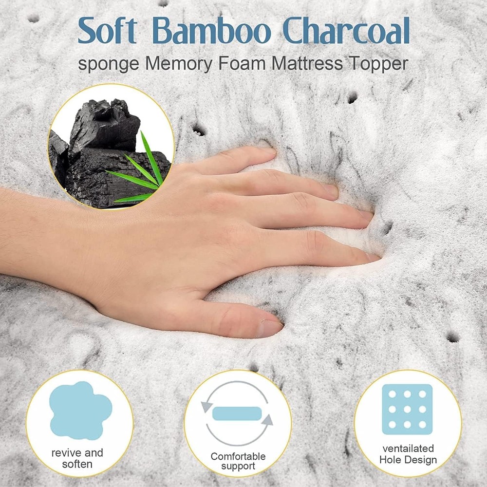 ✅Ventilated and Moisture Control - The negative ion integrated ensures a healthier sleep environment. Filled with charcoal microscopic porous attraction structure ventilation, naturally hypoallergenic memory foam is optimized for airflow and moisture control, reducing body heat retention and preventing odors. ✅Ultimate Comfort - Moderately soft and flexible polyurethane material is suitable for all body types, evenly distributing weight and reducing spinal pain and pressure points. Whether you sleep on your back or side, the bed topper fits your body's curve and increases the hours of deep sleep. ✅Extraordinary Mattress Toppers - Lounging on the couch, camping in the great outdoors, or hitting the road in your RV, this topper eliminates motion transfer allowing your family to enjoy a sound night. Sunk right in a layer of sumptuous and soft-to-the-touch memory foam. ✅Ideal Addition - Whether you're looking to rejuvenate an old mattress, enhance the comfort of a too firm bed, or add a touch of decorative flair, a foam mattress pad is the ultimate cost-effective solution. It turns your ordinary bed into a heavenly oasis enveloped in luxurious clouds! ✅Unpacking and Care Instructions - Memory foam topper comes smartly compressed. Upon receiving it, we recommend placing it in a well-ventilated area to regain its original shape. Moreover, please avoid exposing the topper to direct sunlight, as this could cause discoloration, turning it yellow.
