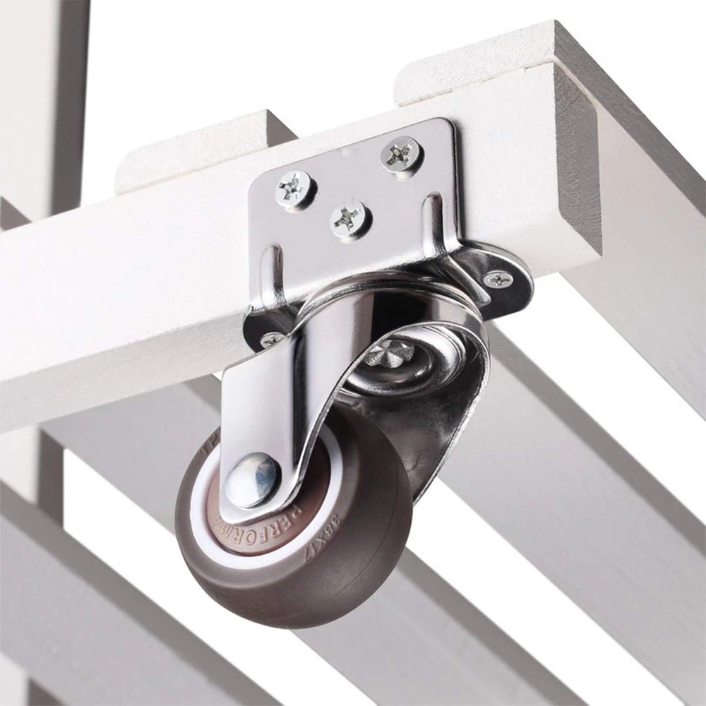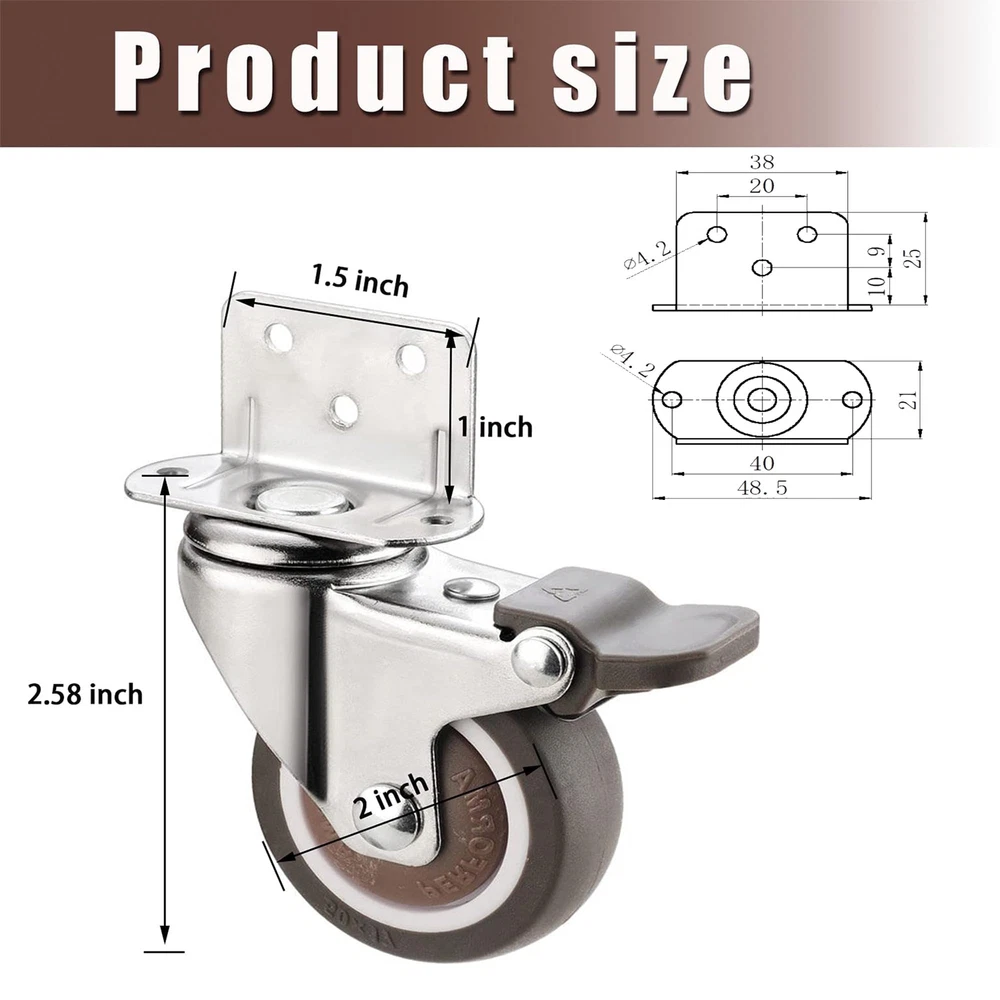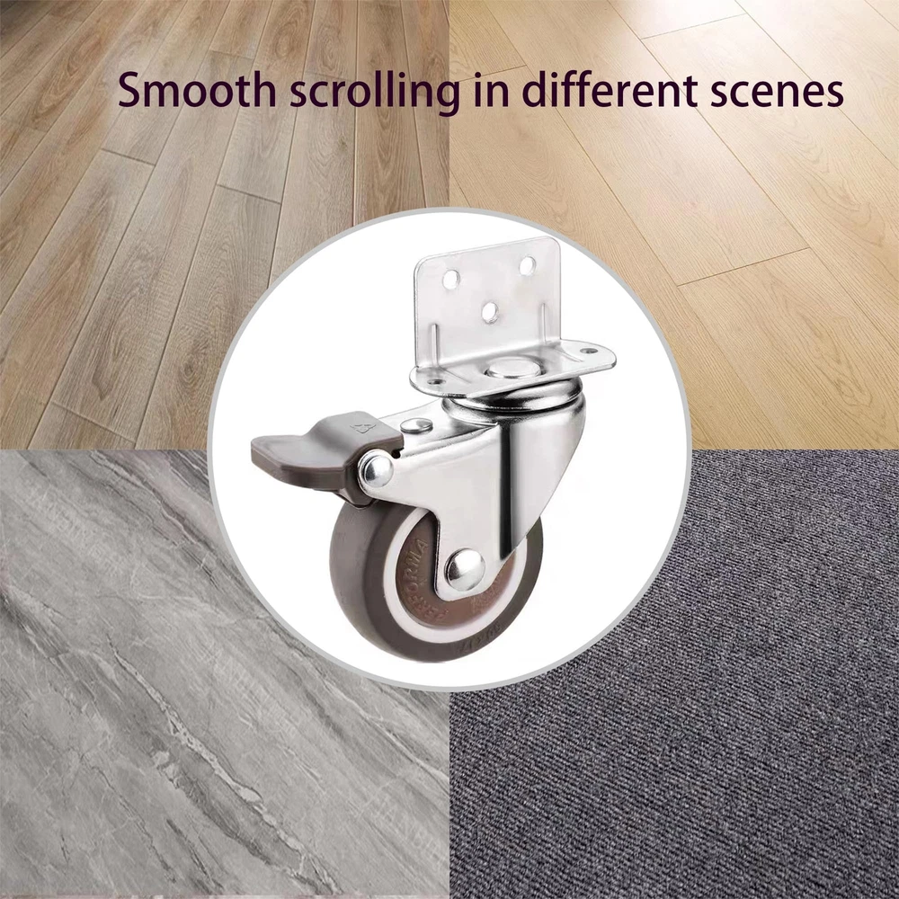 The casters are made of rubber, which can easily slide safely on your expensive hardwood floors, tiles, vinyl, marble, carpets and any type of floor. Not suitable for outdoor use on rough roads Suitable for replacing movable furniture such as cribs, trolleys, kitchen cabinets, storage racks, coffee tables, work tables, etc. Rotate 360 degrees. Rotating, smooth, quiet and robust Capacity: 50 Lbs each-200 Lbs total Wheel diameter: 2 inches Wheel material: rubber Total height: 2.58 inches Including: 4 X 2 inch casters with brake and 20 screws HIGH-QUALITY MATERIALS: thermoplastic elastomer , built-in bearing, does not hurt the floor, the movement is silent. SIZE: L-shaped bracket About 1.5"×1"/ 38×25mm(L×W), mounting height is about 2.58"/65mm, the diameter of wheel is 2"/50mm. CARRYING CAPACITY:Heavy Duty Ball Bearings, 50 lbs per wheel bearing, 200 lbs (pack of 4). UNIVERSAL ROTATION:360 degree swivel casters with brake lock ,Glides on easily without scratches or noise. EASY TO INSTALL L- SIDE MOUNT CASTERS:Wide range of applications, Brake casters for small equipment and small space furniture, including coffee tables, plant racks, bookshelves, shoe boxes, toy boxes, shopping carts.