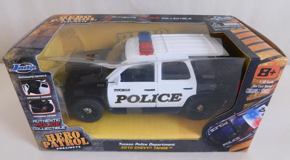 Color: Black Recommended Age Range: 12+ Vehicle Year: 2010 Theme: Police Custom Bundle: No Material: Diecast gtin13: does not apply Gender: Boys & Girls Modified Item: No Vehicle Type: Car Country/Region of Manufacture: China Scale: 1:32 Series: Hero Patrol Brand: Jada Toys UPC: does not apply Vehicle Make: Chevrolet
