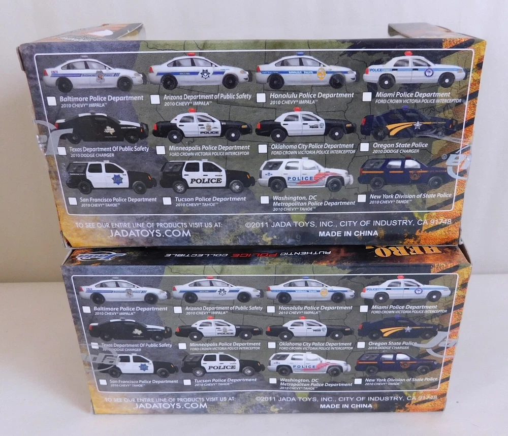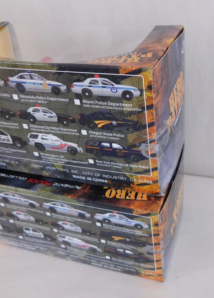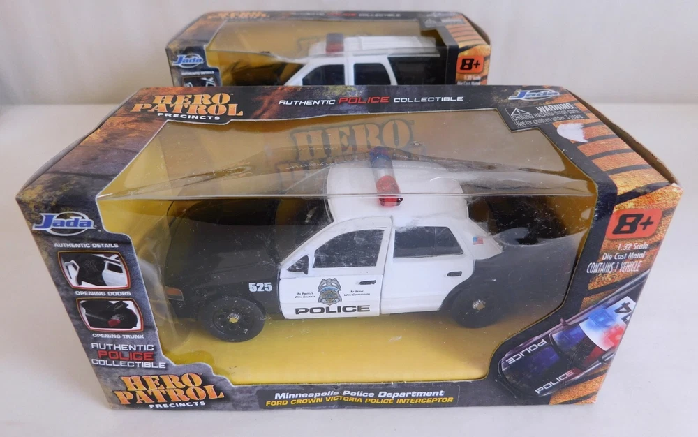 Pair of diecast vehicles JADA Hero Patrol Precincts series 1/32 scale 2010 Chevy Tahoe Tucson Police dept. Ford Crown Victoria police interceptor Minneapolis Police Both vehicle are in unused condition boxes show some wear please see pics