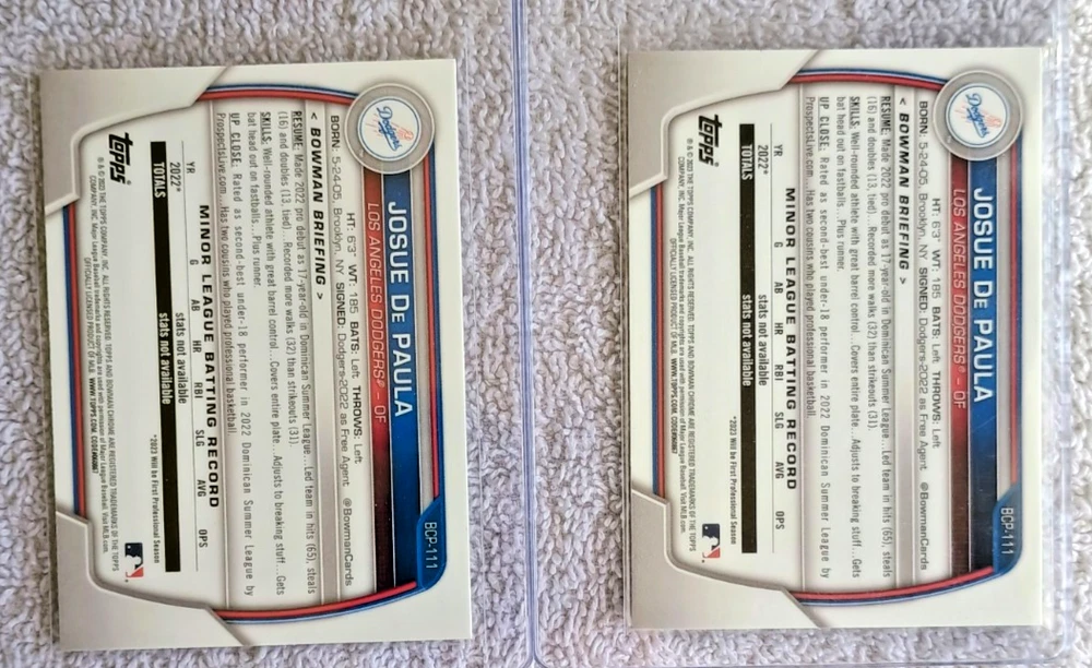 2 JOSUE DE PAULA 2023 BOWMAN CHROME MEGA MOJO REFRACTOR RC LOT # BCP111 DODGERS 2 SHIPPING WILL BE $4.99. I DO COMBINE SHIPPING FOR ADDITIONAL ITEMS PURCHASED. PLEASE CONTACT ME FOR DISCOUNTED RATES. USPS FIRST CLASS SHIPPING UNLESS OTHERWISE LISTED. I ONLY SHIP TO THE U.S. EBAY SELLER WITH 100% FEEDBACK. PLEASE VIEW MY OTHER LISTING. MONEY BACK IS GURANTED IF YOU NOT SATISFIED WITH THE RETURN OF THE ITEM OR ITEMS.