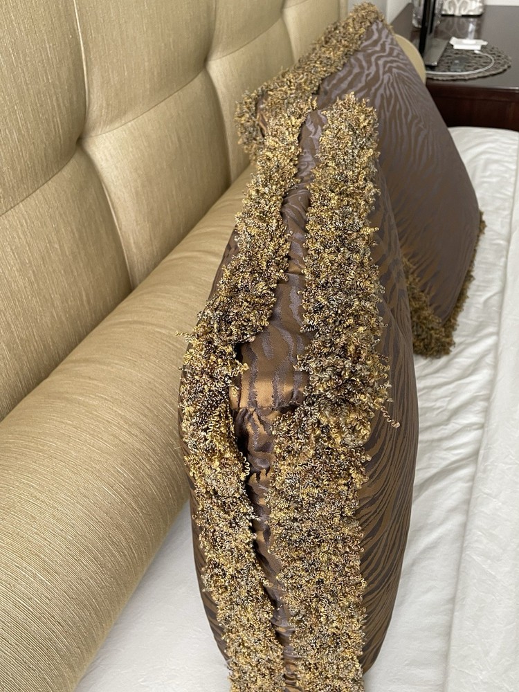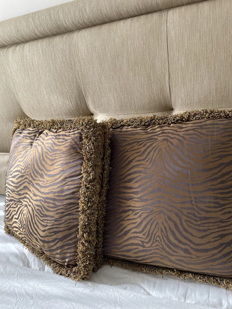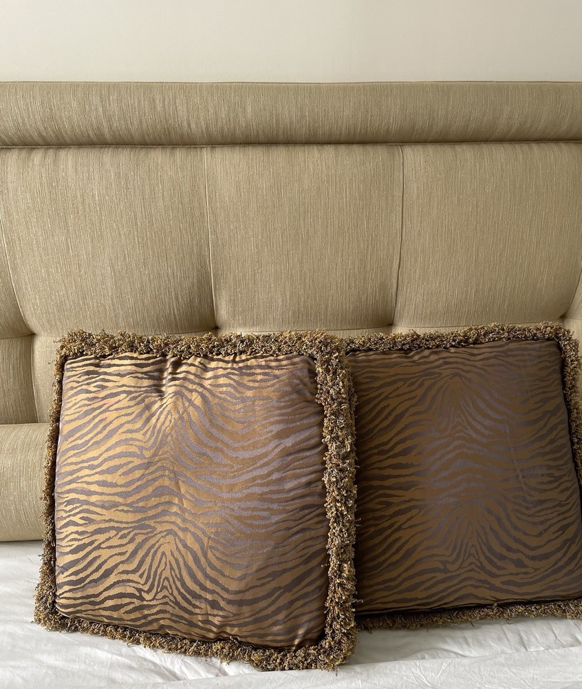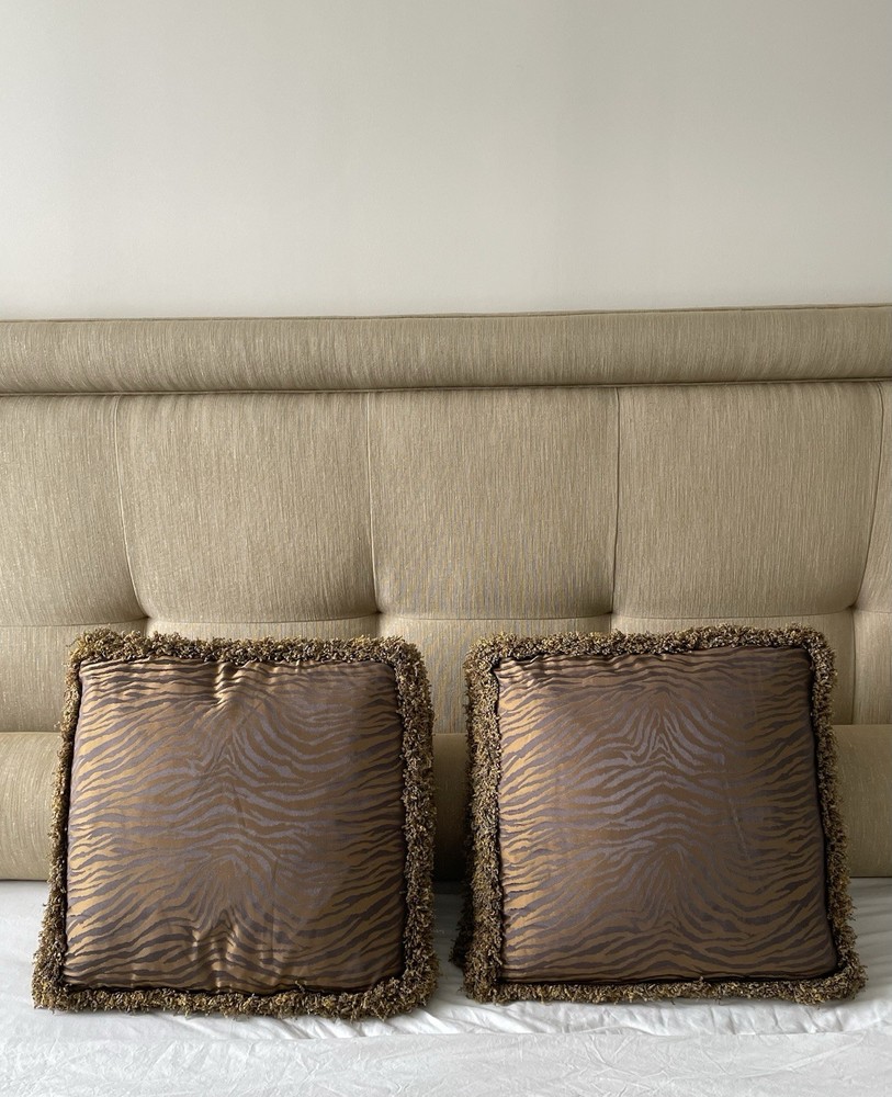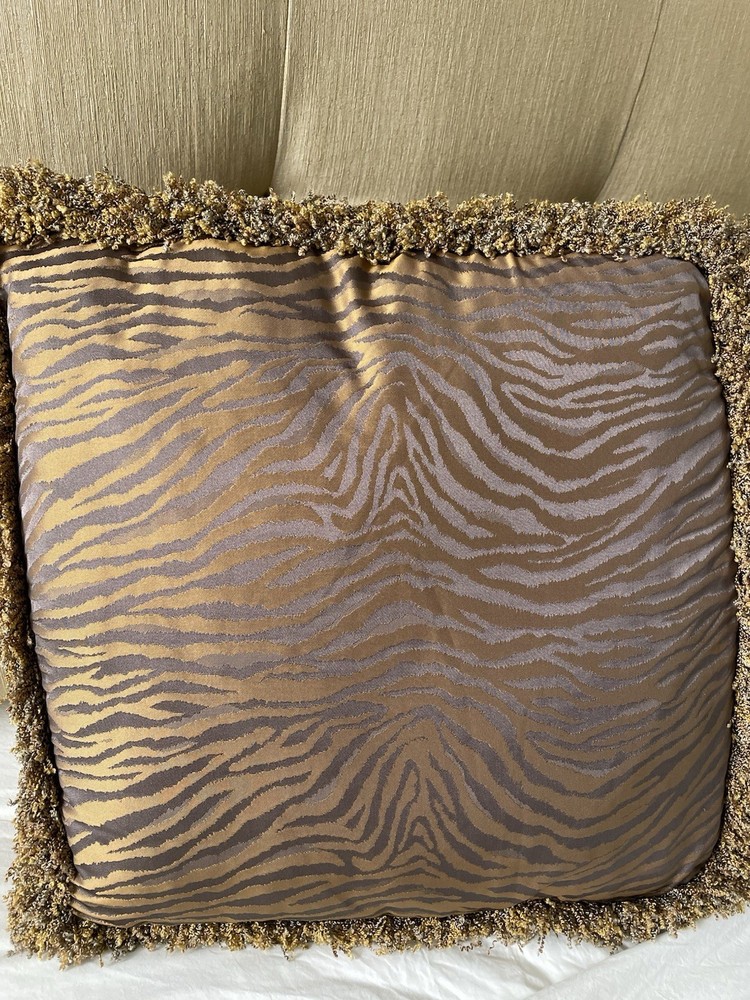 A rare find by the International designer Barbara Barry for Henredon! I’m offering a pair of 20” box pillows in luxe silk sheen Kravet couture fabric that mimics a tiger pattern with a multi gold and grey fringe. The pillows are gold bronze with grey lavender undertones in the pattern. Beautiful in the sunlight! They are gorgeous and will turn any sofa or bed into a high end work of art! In excellent condition from a smoke and pet free home. Only used for staging. 20x20x4