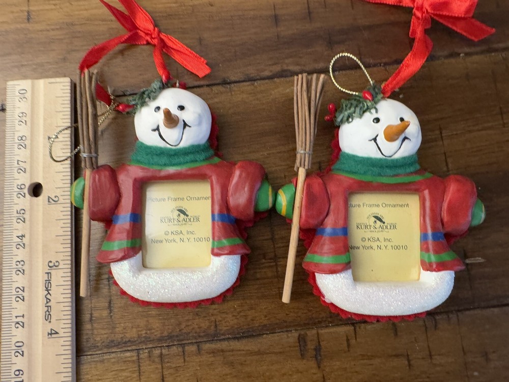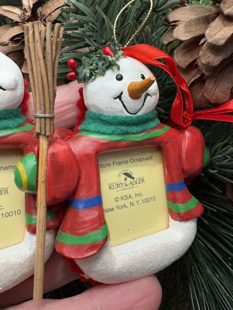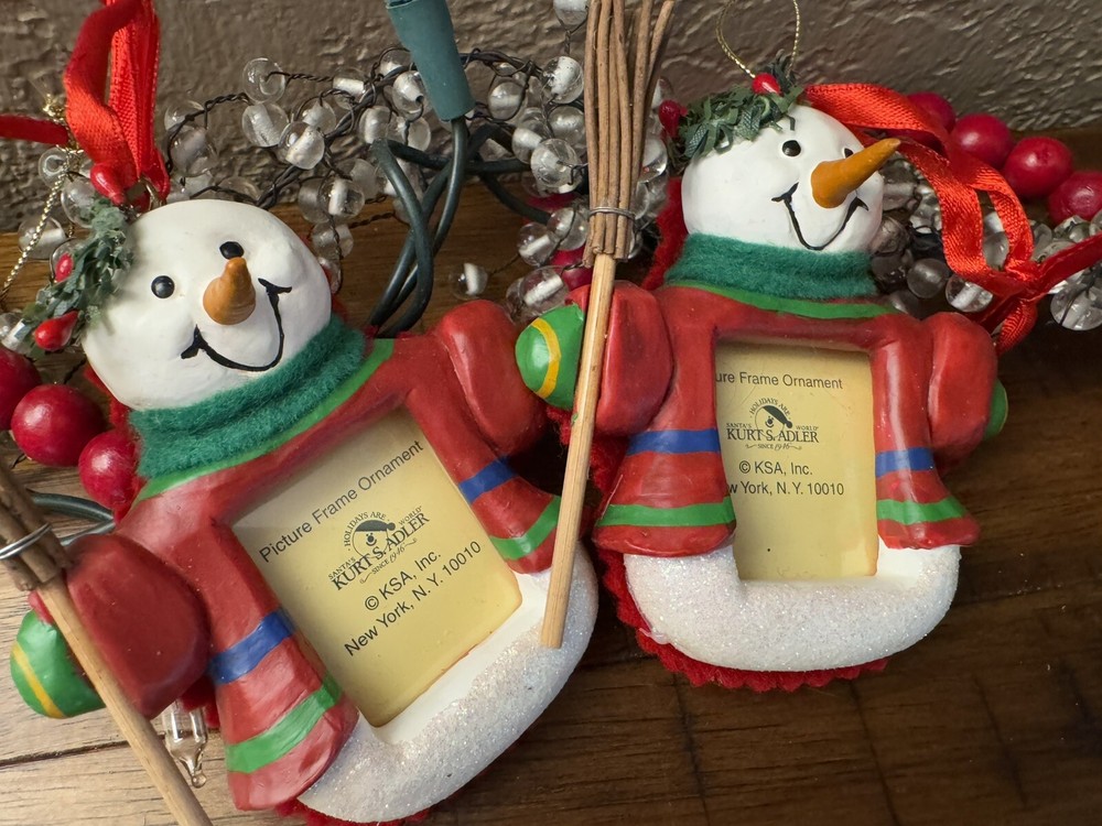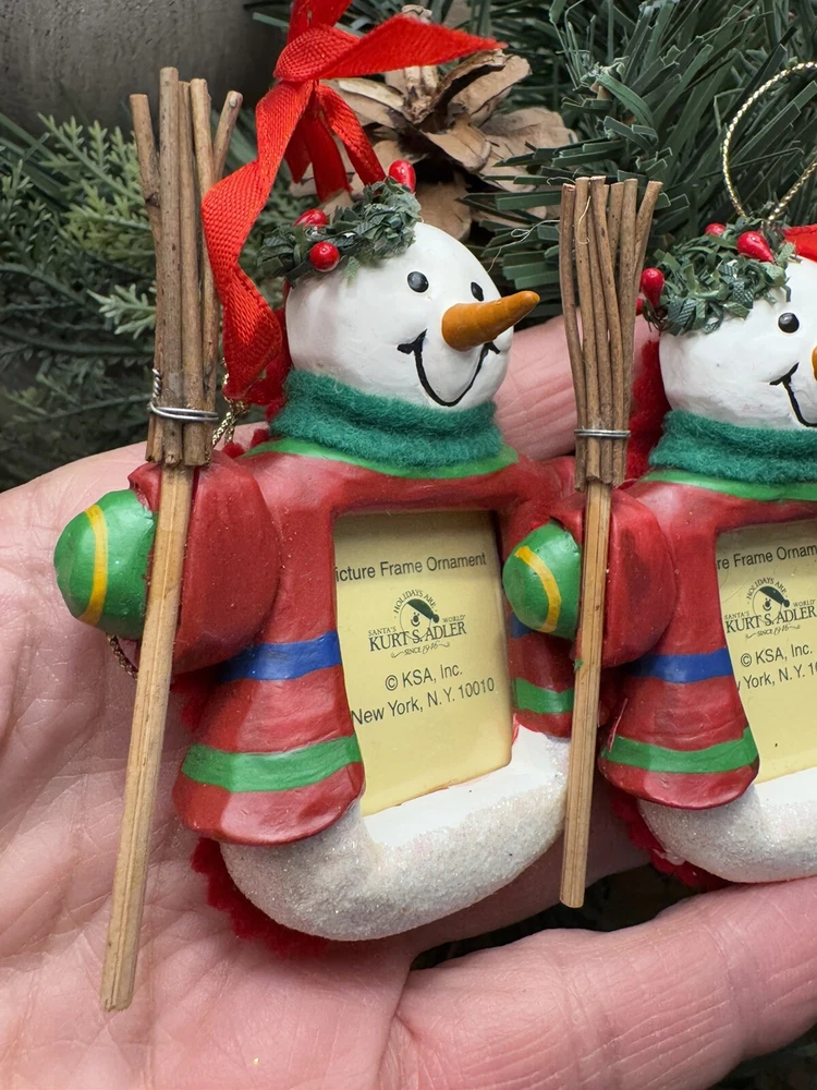 TWO ORNAMENTS This product is a set of two vintage Kurt Adler snowman photo frame ornaments. Each ornament features a snowman holding a broom and adorned with holly and glitter details. The ornaments are made of resin and have a photo holder feature, making them perfect for displaying cherished memories during the Christmas season. These ornaments are part of the Christmas theme collection by Kurt Adler and would make a festive addition to any holiday decor. Please see all photos SMOKE FREE HOME Always happy to combine for shipping savings Please buy through your cart on multiple items and request a combined shipping invoice If you pay separately, no worries, I just send the refund when I create the label