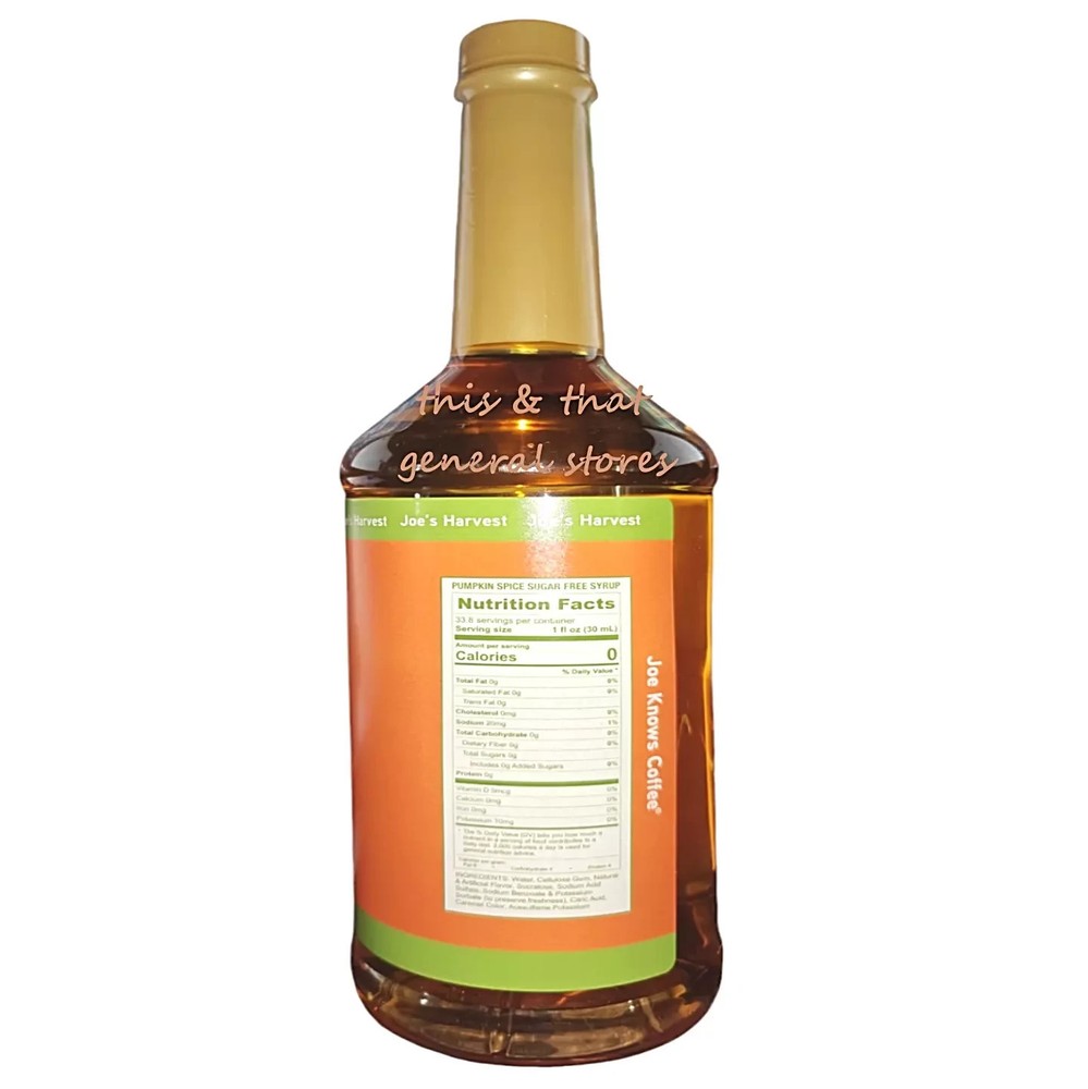 JOES 1 LITER BOTTLES Coffee / Baking Flavouring Syrup - 2X 1 LITER BOTTLES PUMPKIN SPICE ***GET A FREE SYRUP PUMP WITH EVERY 2 PACK BUNDLE Add a splash to desserts, tea, espresso, coffee, soft drinks and smoothies . Add a delightful twist to your coffee with Joes Pumpkin Spice syrup. Made in the United States, this 1-liter bottle of liquid syrup is perfect for coffee lovers who want a sugar-free option. Each serving of 1 fl oz contains 0 calories, making it a guilt-free indulgence. This coffee flavoring syrup is not just limited to coffee, experiment with adding it to your favorite desserts for a burst of Pumpkin Spice flavor. The bottle contains 34 servings, Joes syrup is a perfect addition to your pantry and a great way to elevate the taste of your beverages and desserts. Comparable to Jordan's Skinny Syrups and Torani Syrups ENJOY FAST AND FREE SHIPPING SAME DAY AS ORDERED! Click Here For Other Deals You Might Like!