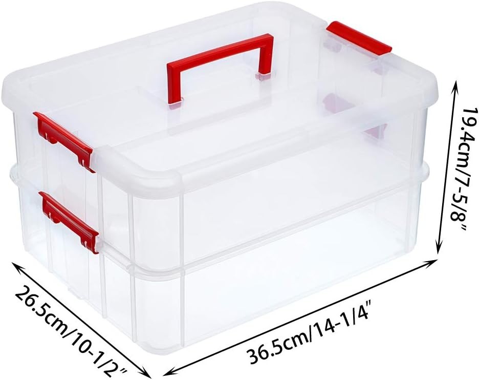 2 Layer Stack & Carry Box, Plastic Multipurpose Portable Storage Container Box Handled Organizer Storage Box for Organizing Stationery, Sewing, Art Craft, Jewelry and Beauty SuppliesRed Durable Material: The storage box made of durable high quality PP, light weight and long service life, easy to classify, easy to find, easy to store. 2 Stackable Tiers: This storage box features 2 stackable tiers of storage with 1 transparent lid, lock your supplies firmly for safe storage and transportation, and see-through latched layers allow easy access to items enclosed. Kindly Note: 2 Stackable Tiers storage box with only 1 lid. Approximate Total Dimensions: """(LxWxH), each layer container height: 9cm / inch. Large capacity and clear visible case perfect for art and craft supplies, stationery, tools, medicine, sewing kit, cosmetics or fishing supplies. Perfect to organize: The multi-layer separation design provide good sealing performance, dustproof, moisture-proof, diversified functions, powerful storage function, completely solve the disorder of items. Versatile Use: handy storage box with handle on lid for easy transporting, suitable for family, car, school, gym, workplace, travel, camping, office, health clinics, hospitals. 16 Inch Foldable Dividing Storage Box 16 Inch Foldable Dividing Storage Box 16 Inch Foldable Dividing Storage Box Clear Plastic Dividing Storage Box 2 Layer Clear Plastic Dividing Storage Box 2-Tier Cute Bear Storage Box Add to Cart Add to Cart Add to Cart Add to Cart Add to Cart Add to Cart Customer Reviews out of 5 stars 13 out of 5 stars 13 out of 5 stars 13 out of 5 stars 257 out of 5 stars 59 out of 5 stars 177 Price $$ $$ $$ $$ $$ $$ Overall Size 16""" 16""" 16""" " x " x " " x " x " " x " x " Key Features 3 Layer Foldable Design, 8 Adjustable Compartments 3 Layer Foldable Design, 8 Adjustable Compartments 8 Deep Compartments, Removable Inserts 8 Deep Compartments, Removable Inserts With Flap Lid & Snap-closure, 4 Compartments Tray Cute Bear Design, 6 Compartments Tray Portable ✓ ✓ ✓ ✓ ✓ ✓ See More