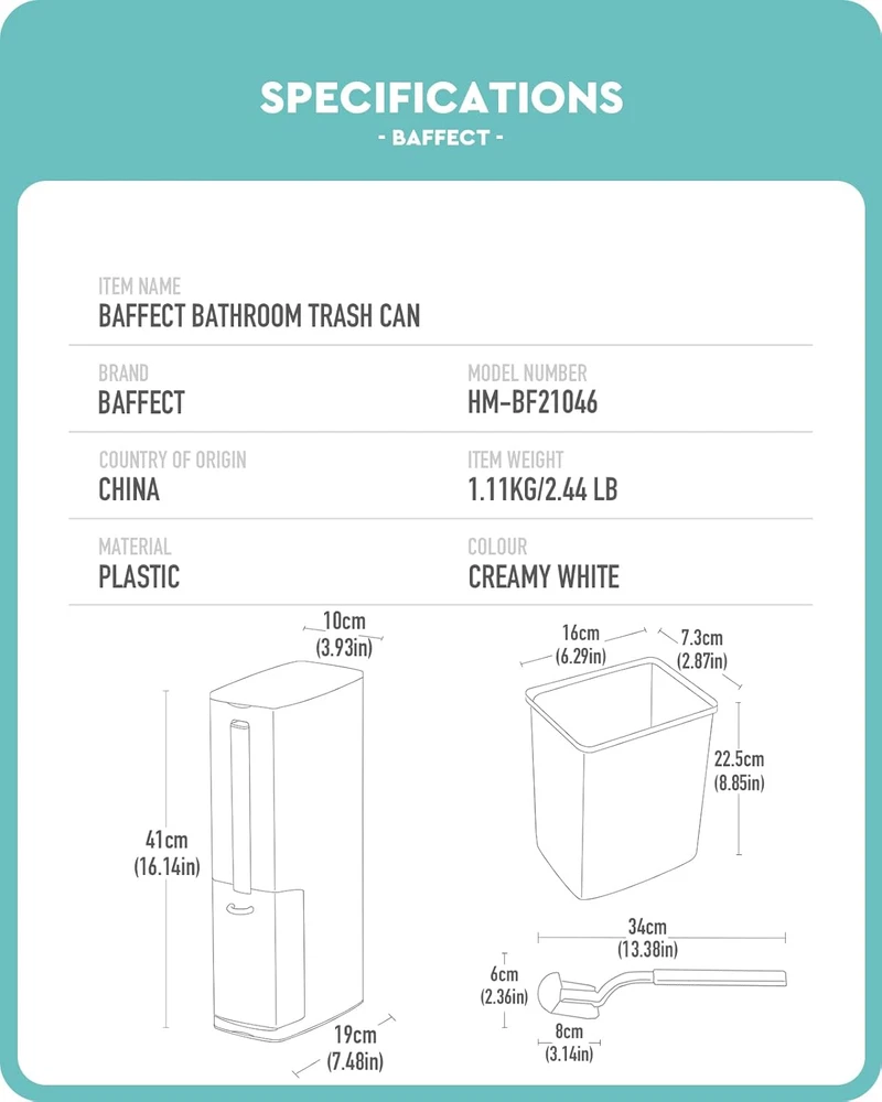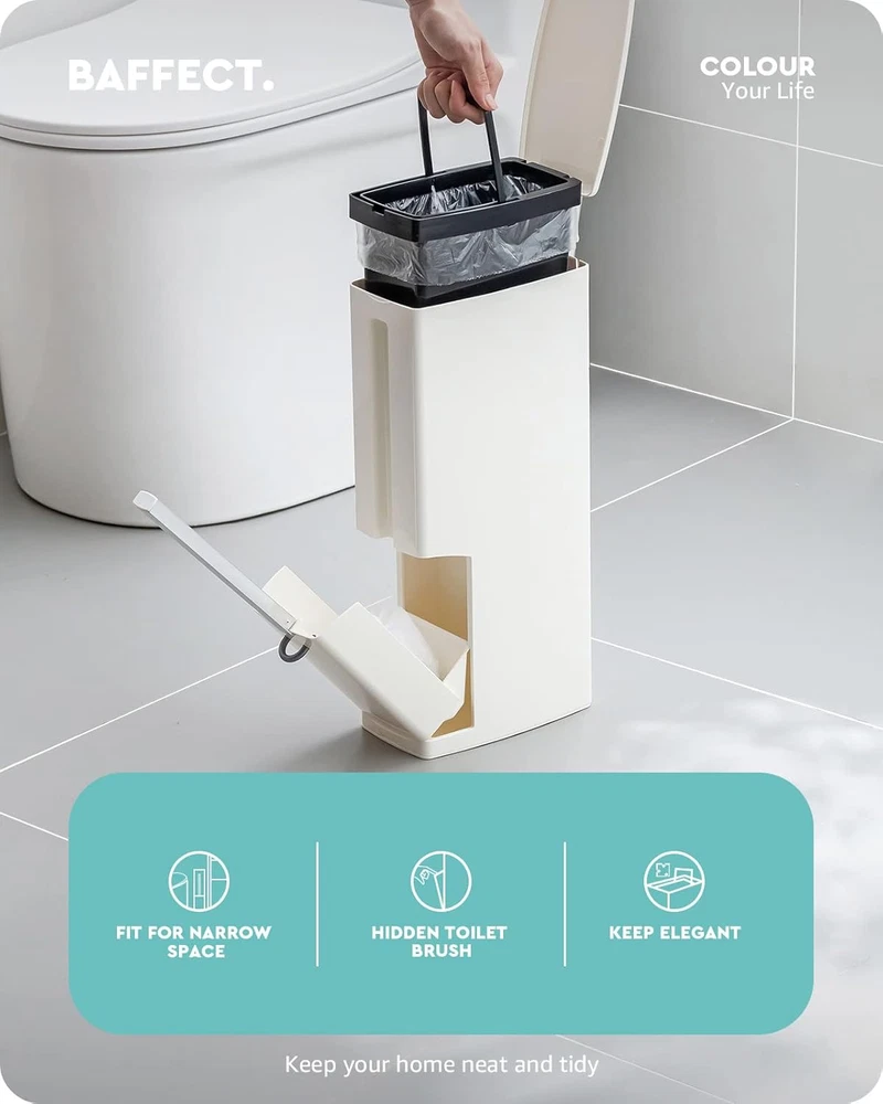Store New Arrivals Add to Favorite View Feedback Contact 2 Liter White Slim Bathroom Trash Can with Lid and Toilet Brush Holder Description Item model number HM-BF21046 Warranty Description For a better shopping experience, brand would guarantee a one-year warranty. If there is any problem with product within a year, please contact brand any time. We are practicing the concept of ‘color your life' in your home and kitchen life with baffact brand. Number of Items 1 Assembly required No Country of Origin China Unit Count 1.0 Count Batteries required No Product Dimensions 6.2"L x 2.8"W x 8.8"H Material Acrylonitrile Butadiene Styrene (ABS) Shape Rectangular Volume 2 Liters Is Discontinued By Manufacturer No Specific Uses For Product Toilet Included Components Holder Item Weight 2.45 pounds Special Feature Removable Color White Global Trade Identification Number 19083597908100 Handle Material Acrylonitrile Butadiene Styrene Finish types Polished Number of pieces 1 4 in 1 function: 1 removable bathroom trash can, 1 toilet brush and toilet brush holder, 1 tissue box and garbage bag holder. The integrated design meets the daily needs in small bathroom. It saves space. Please note that this slim trash can is only 0.6 Gallons and is specifically designed for narrow bathroom spaces. If you need larger capacity, you can choose other sizes of trash cans in our store. Removable trash can: The removable inner trash can is designed with a handle, easy to empty and clean. The garbage bag can be hidden in the inner trash can, which will decorate your bathroom. Hidden toilet brush with holder: The pull ring is convenient to place or take the toilet brush. After closing the holder, the toilet brush is hidden to keep the bathroom clean, tidy and orderly. The holder of the toilet brush can be easily removed and cleaned. Material: The trash can is made of ABS and PP material. High quality PP brush head is a bend design for cleaning the edge and corner easily and thoroughly. It is not easy to shed off. When you receive the trash can, if any components are missing or damaged, please and we will provide you with a solution. Size: The inner trash can is 0.6 Gallons/2 Liters (8.8 x 6.2 x 2.8in). The brush is 13.4 x 2.4 x 2.4in. The total toilet brush and trash bin set is 3.5 x 7.5 x 16.1in(2.5 lbs). Product Description With its slim styling, Baffect Bathroom Trash Can makes full use of the narrow space in bathrooms. Baffect Garbage Can 4-in-1 trash can With integrated functions, this 4-in-1 trash container can meets multiple needs at the same time. Baffect Garbage Can Slim profile Baffect Bathroom Trash Can is designed with a slim profile that does not take up extra space. Baffect Garbage Can Concealed storage space This Baffect trash bin features hidden storage space for easy access and a tidier bathroom. Baffect Garbage Can Fixed ring to hide garbage bags The fixed ring keeps this bin neat in appearance by preventing garbage bags from being exposed. Baffect Garbage Can Easy to clean This plastic trash bin features a smooth surface that allows you to clean it with water easily. 1 INTEGRATED FUNCTIONS 2 SLIM SHAPE 3 HIDDEN STORAGE 4 BUILT-IN FIXED RING 5 EASY CLEANING Brand Baffect Complete Set Trash Can with Toilet Brush Overall Size 19cm x 10cm x 41cm Overall Size 7.48 in x 3.93 in x 16.14 in Item Weight 1.11kg/2.44 lb. Item Capacity 2L/0.6 gal. Item Material Plastic Item Color Creamy White Lid Type Flip Lid Integrated Functions Trash Can, Toilet Brush, Toilet Brush Holder, Trash Bag Box Item Shape Slim Placement Narrow Gaps in Bathroom Applicable Scenarios Bathrooms in Apartments, Toilets in RVs What is the capacity of this trash can? With an internal capacity of 2L/0.6 gallons, this trash can with lid is specifically designed for small bathrooms with limited space. Can I buy a toilet brush separately? Yes, you can buy the exclusive toilet brush of this garbage can with lid separately in the Baffect store. Does the toilet brush head can be replaced? No, the brush head cannot be removed for . Is the space for garbage bags also suitable for paper towels? What size paper towels will fit in this trash bin? Yes, the place for garbage bags also fits for paper towels, measured 3.54 x 3.54 x 6.69. As long as the paper towels are smaller than this size, they will fit in this trash can. Is this waste bin pure white? No, the color of this trash can with lid is close to creamy white, which makes the bathroom looks homier. ABOUT US We offer the best prices around on high quality products. Our E-store includes media such as books, movies, music and games while offering electronics, toys, sporting apparel, clothing, tools, general home, garden items and more. SHIPPING We are always working hard to ensure your package arrives as soon as possible. Please understand that some factors like weather, high postal traffic, and the performance of shipping companies are outside of our control. We offer free shipping to the lower 48 states and ship within 2 business days of payment, usually sooner. We do not accept P.O. Boxes. Please provide a physical address. For shipping outside of the continental USA, we only use eBay's Global Shipping Program.The item is shipped to KY and then sent to the rest of the world. International customers are responsible for all duties and taxes. Continue to check out in order to calculate costs for shipping the item to your country. Messages regarding eBay's Global Shipping Program MUST be directed at eBay EXCLUSIVELY. RETURNS We offer a 30-Day Return Policy on items which you are not completely satisfied with. You have the option for a full-refund or an exchange of the item. No returns are available on items shipped outside of the USA. PAYMENT We accept PayPal. CONTACT US This page content is yet to come Please ad us to your favorite seller and visit again later Thank You CUSTOMER SATISFACTION We try our very best to make sure every customer is completely satisfied. If there's a problem, message us! We