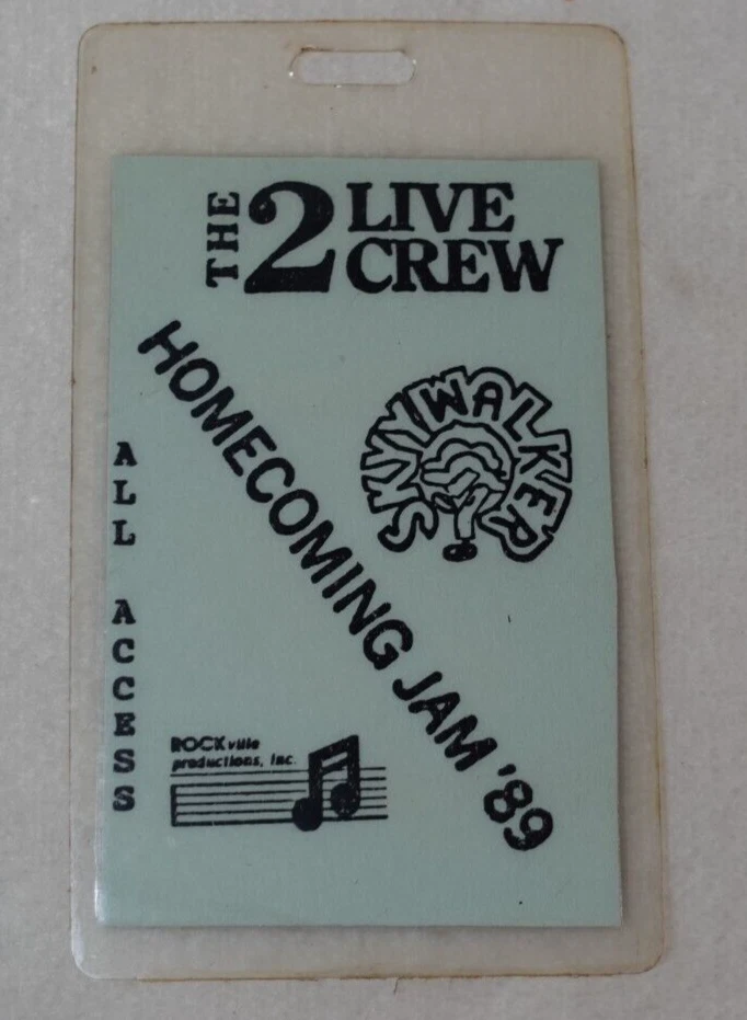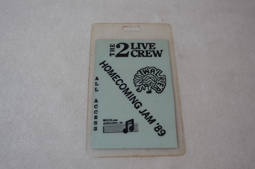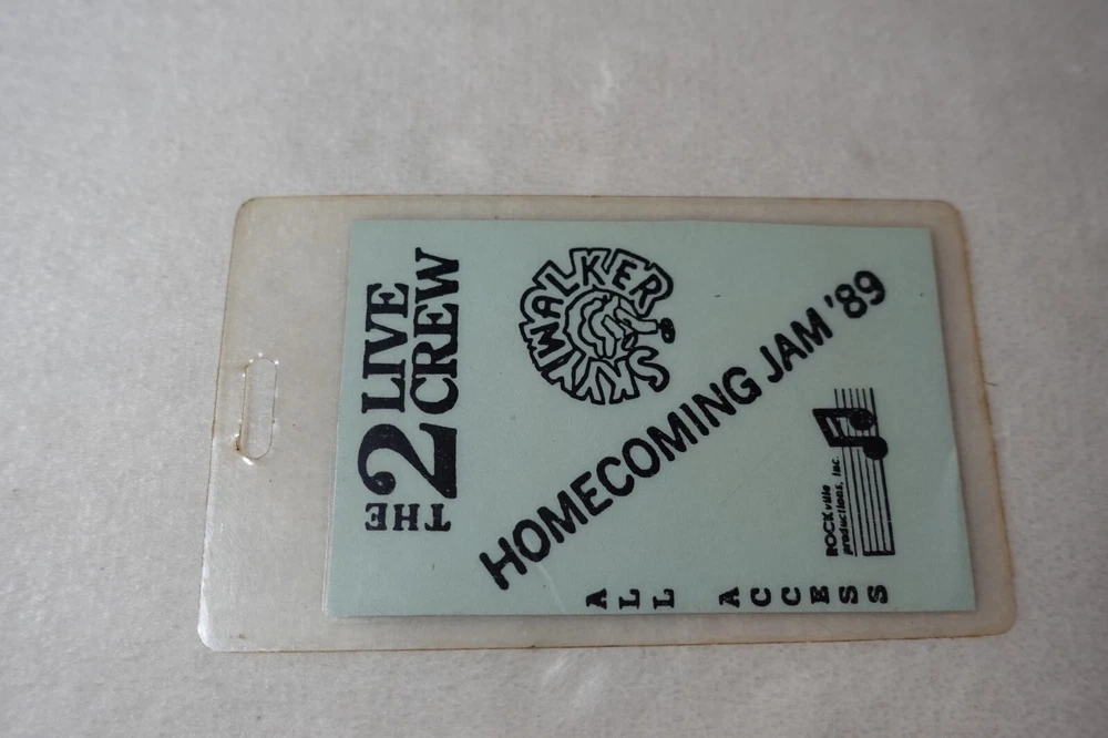 2 Live Crew Homecoming Jam 1989 Miami Baseball Stadium 12/26/89 All Access Pass - Rare Homecoming Jam '89 was 2 Live Crew's first concert in Miami in more than a year. This is an original Crew All Access Laminated Pass from the concert. Measures approximately 2 1/2" x 4 1/4". Item has wear to the laminate to include surface scratches, marks, discoloration, dings to the edges and around the hole at the top center, and creasing. Please see photos for more information on condition and ask any questions you may have.