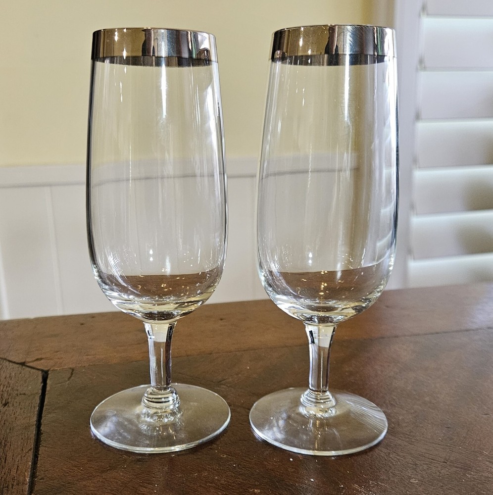 2 MCM Dorothy Thorpe Silver Rim Champagne Flutes 6" Short Stem Tapered Wine Glasses