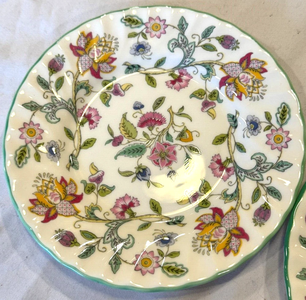 This item for sale is a pair of 2 bread plates in perfect gently used condition by Minton of England in the Haddon Hall pattern. approx 6.25 inches across with a green trim edge. Please enjoy 3 pounds free insured shipping to your USA address Please check out our other items, we probably have what you need