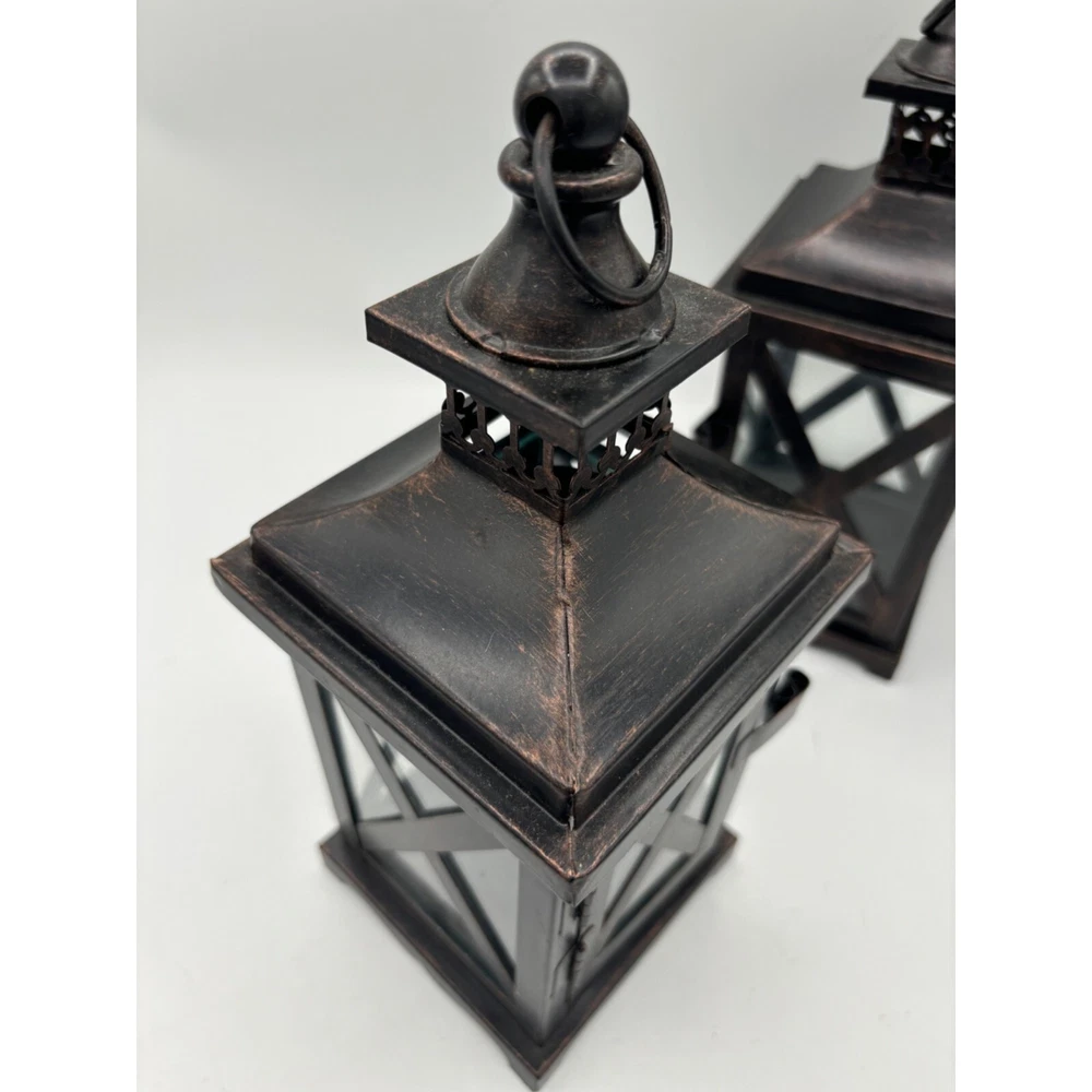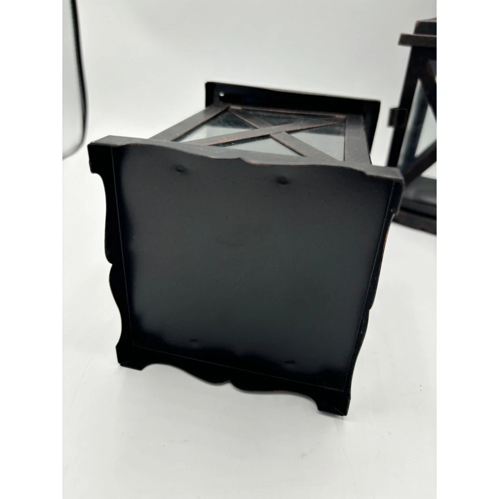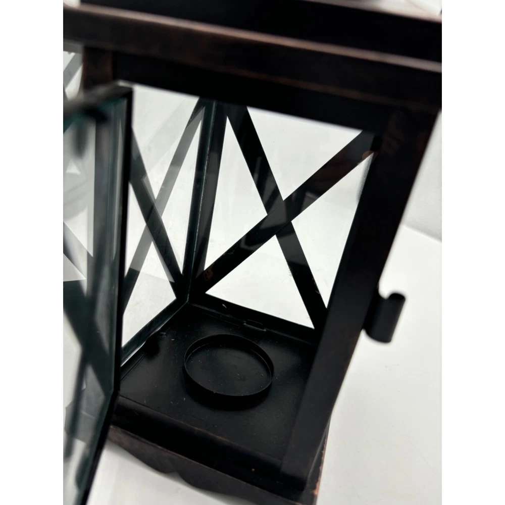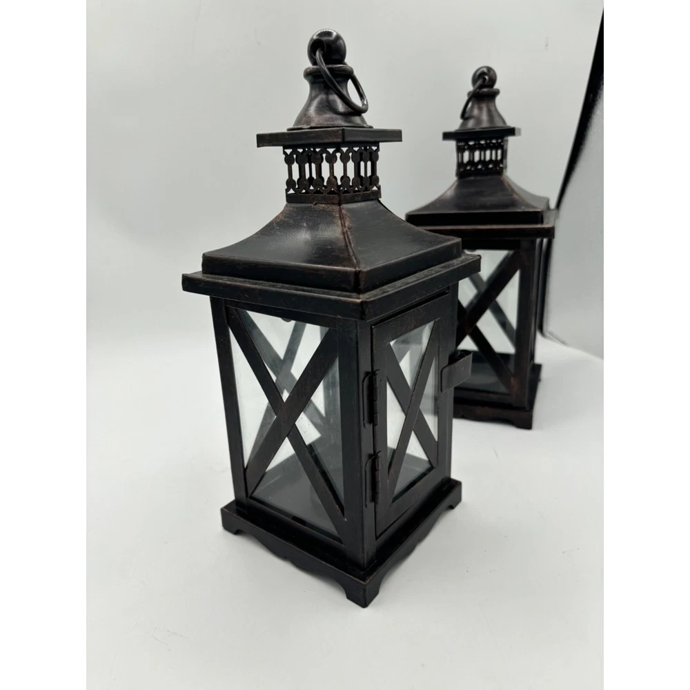 2 Metal and Glass Candle Lanterns Oil Rubbed Bronze New 10" x 4" Both are in excellent condition unused Votive candle holders
