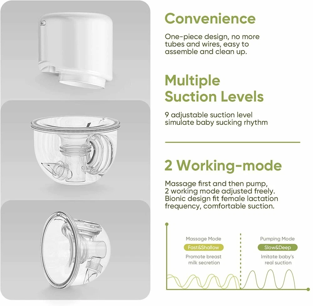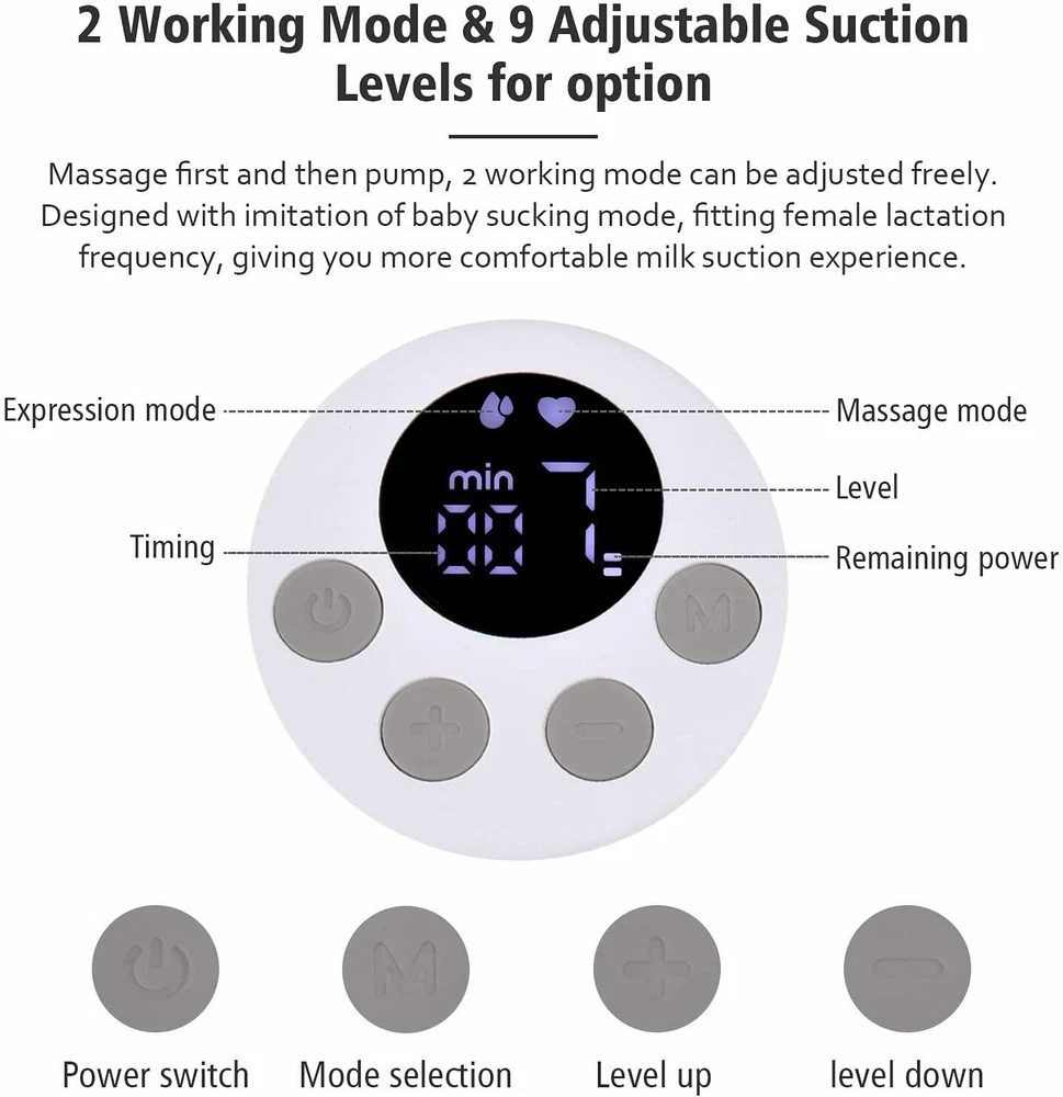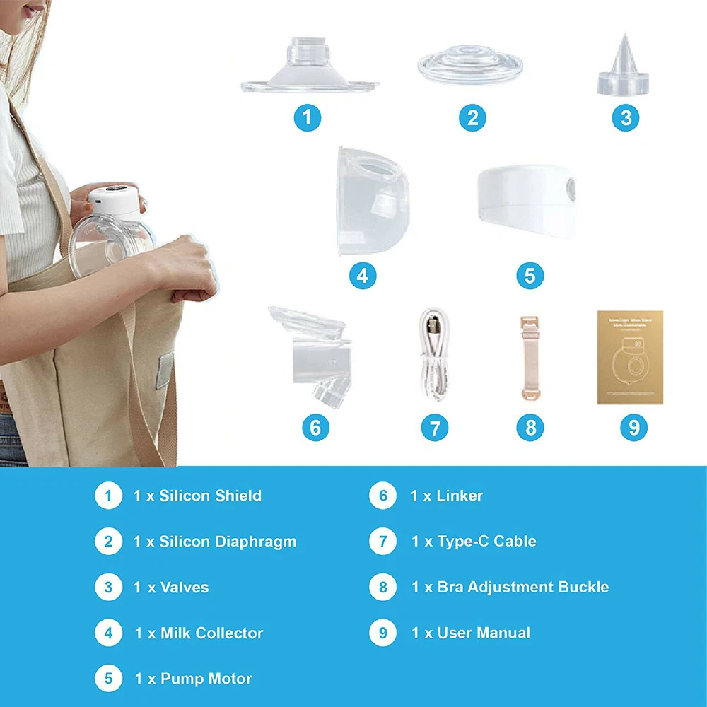Welcome to Suntrarn , I f you hav e any questions please feel free to contact us.Thanks! Pay A t tention 1) Come with 5 Food-grade milk bag,1 Silicon Diaphragm,2 Valves extra are Free. 2)24mm Flange are sent by default. If you need 2 7mm Flan ge , you can contact us. Product Description Model S12 Silicone flange 24mm Bottle Capacity >120ml(4 fl.oz) Vacum max. 280~300mmHg Models Massage / Expression Levels 9 levels adjustment Salient features wearable breast pum Rated power 4W Usage time about 80 min Shut off 30 min auto shut off Power input DC5V/1A Charger port USB Type-C Charging time 2 to 2.5 hours Lithium battery voltage 3.7V Battery capacity 1000mAh, 3.7Wh Box size/Gross weight 180*145*80mm(7.19*5.7*3.15inch)/400g(0.88lbs) Body Item size/ Net weight 136*111*70mm(5.35*4.37*2.76inch)/218g(0.48lbs)
