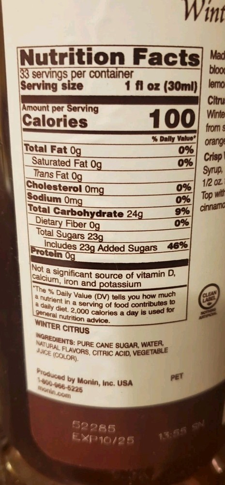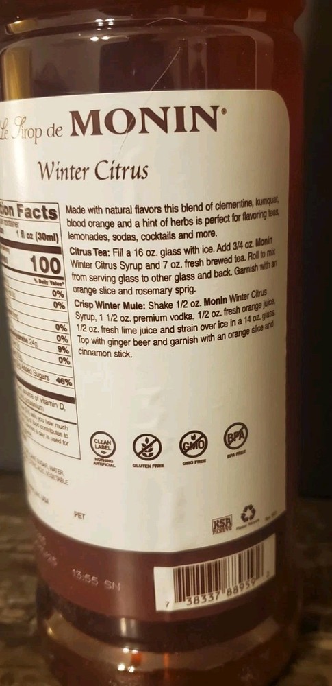 NOW ( 2 ) BOTTLES. The Monin 1 Liter Winter Citrus Flavoring Syrup is a premium syrup that is perfect for enhancing your winter beverages. Made in America, this syrup is GMO-free, vegetarian, BPA-free, dairy-free, and vegan. With an expiration date of 10/25. This liquid syrup is specifically designed for coffee flavoring, or others, adding a delightful winter citrus taste to your favorite drinks. Free shipping makes it even more appealing for all your holiday celebrations or everyday use. NOW 2 LITERS , 2 BOTTLES INCLUDED Free Shipping