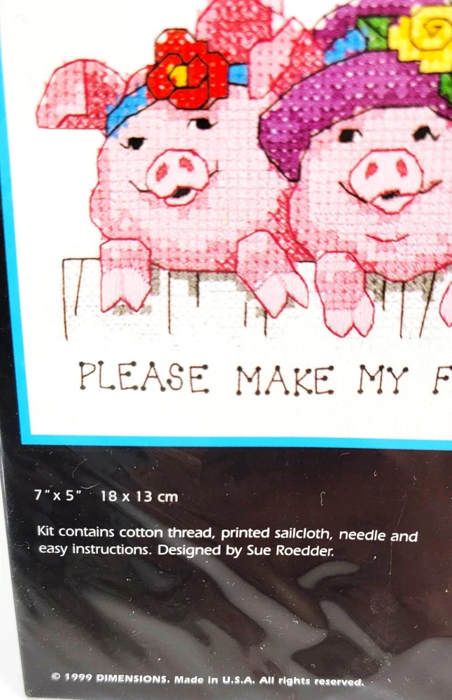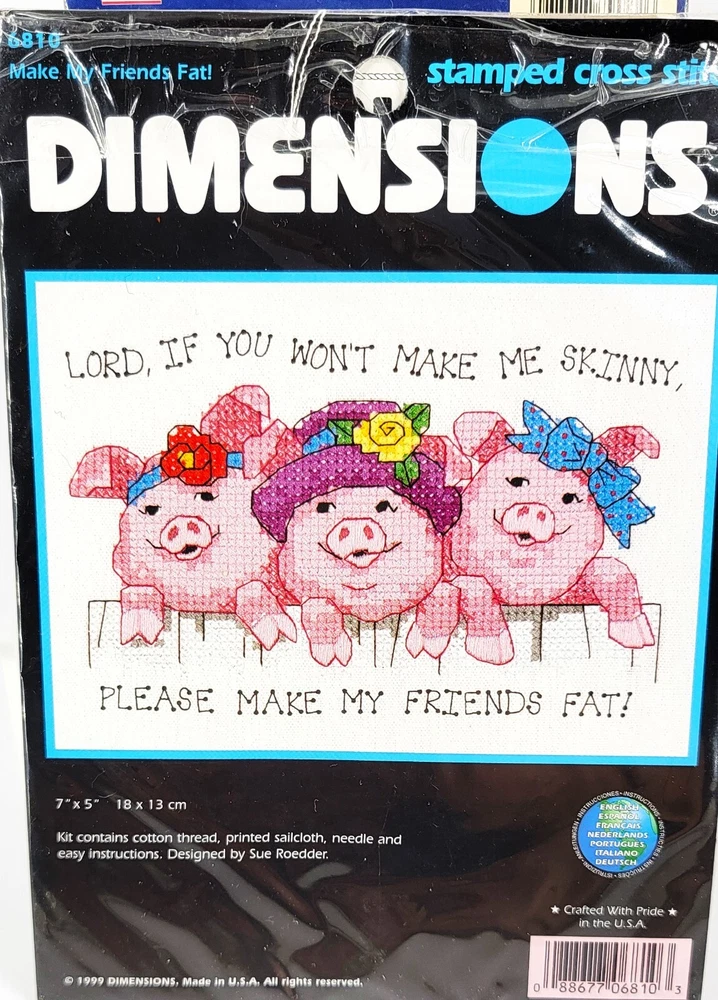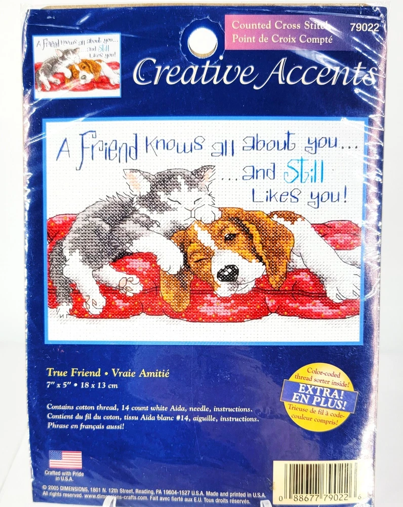 TWO BRANDS: NOS, 1999 Dimensions, 3 Little Pigs - Diet, Made in the USA. Complete Kit. Second Kit - 2005 NOS Creative Accents, Counted Cross Stitch. Cat and Dog. Complete Kit. 1999 Dimensions Kit Contains - Stamped Cross Stitch, Cotton Threads, Printed Sail Cloth, Needle, Instructions, 7" X 5". Sentiment is "Lord If You Won't Make Me Skinny, Please Make My Friends Fat!". Complete Kit. 2005 Creative Accents Kit Contains - Counted Cross Stitch, Cotton Thread, 14 Count White Aida, Needle, Instructions, Thread Sorter. 7" X 5". Sentiment is, " A Friend Knows All About You.....,And Still Likes You!" Complete Kit. Please see my Photos for Exact Detail. The kits are vintage but in lovely condition. Thank you for shopping my store and please enjoy looking at my other listings!