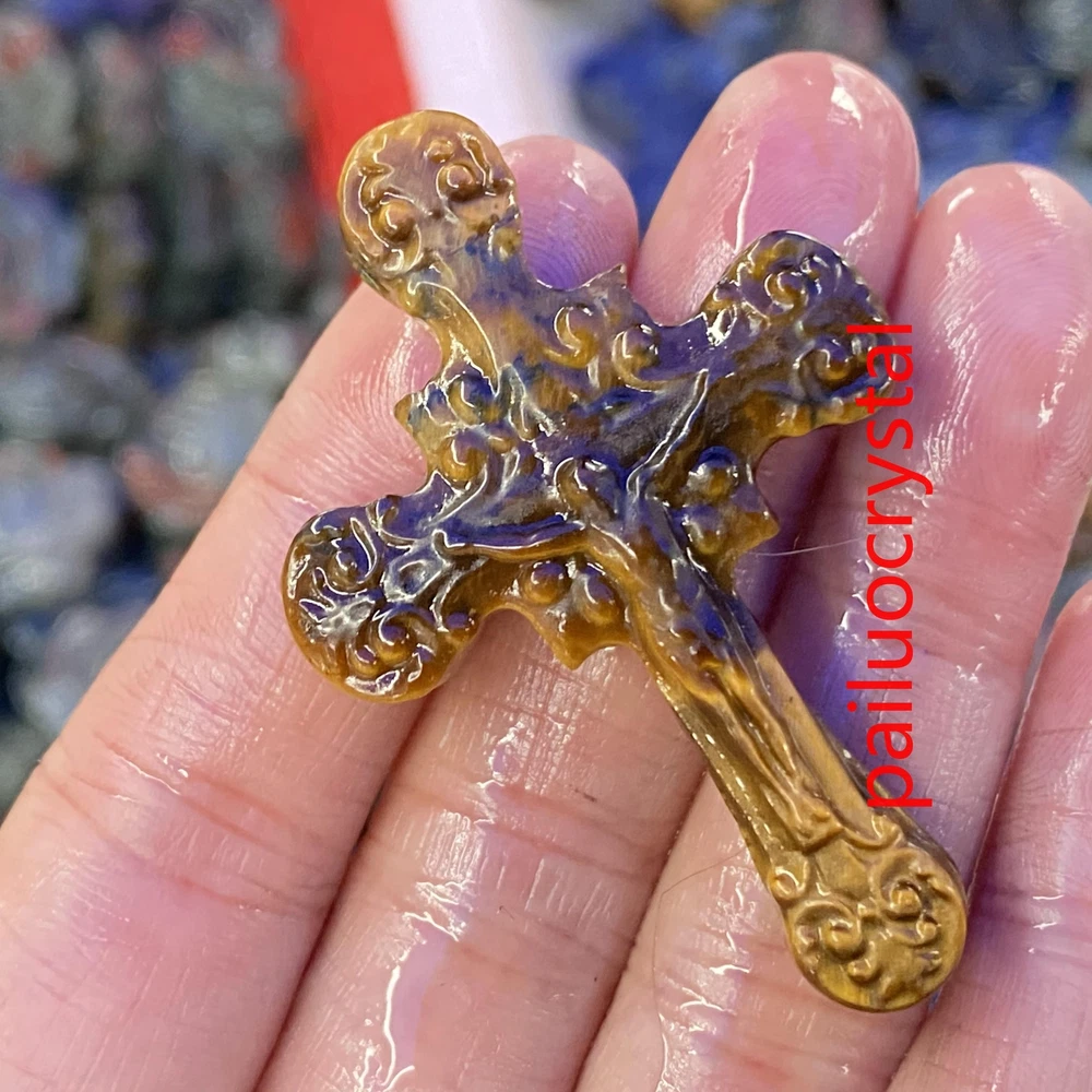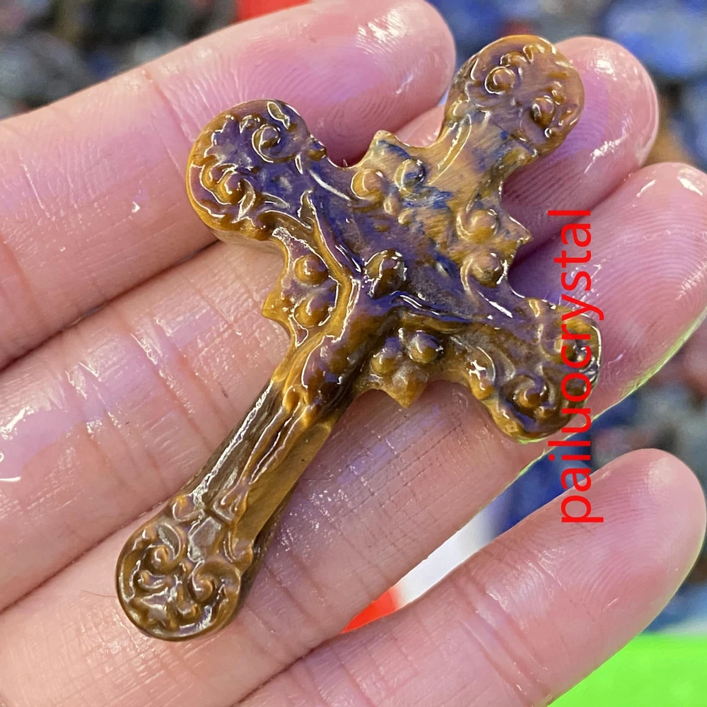 2" Natural Tiger's eye jasper Cross Quartz Crystal Skull Carved Pendant 1pc