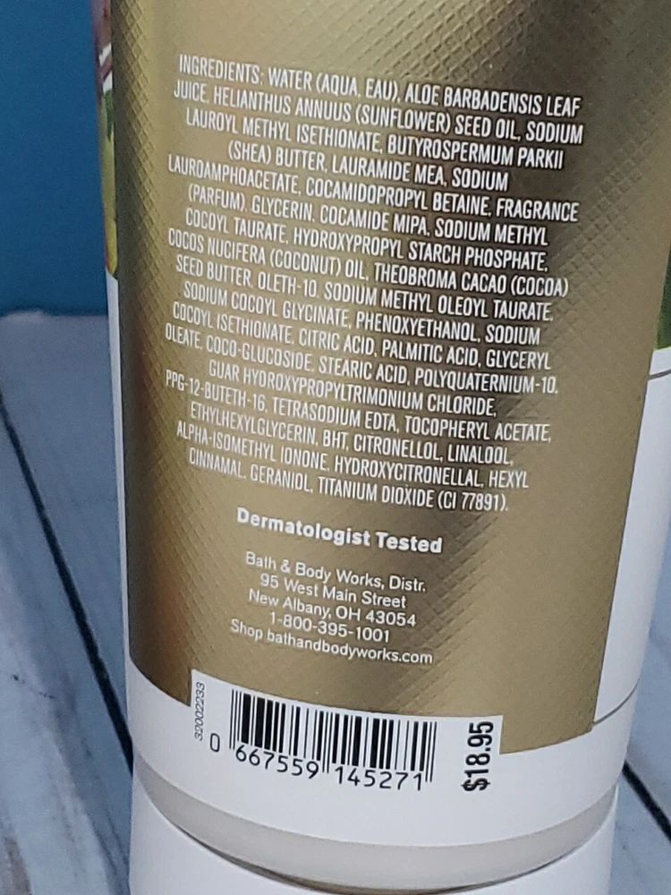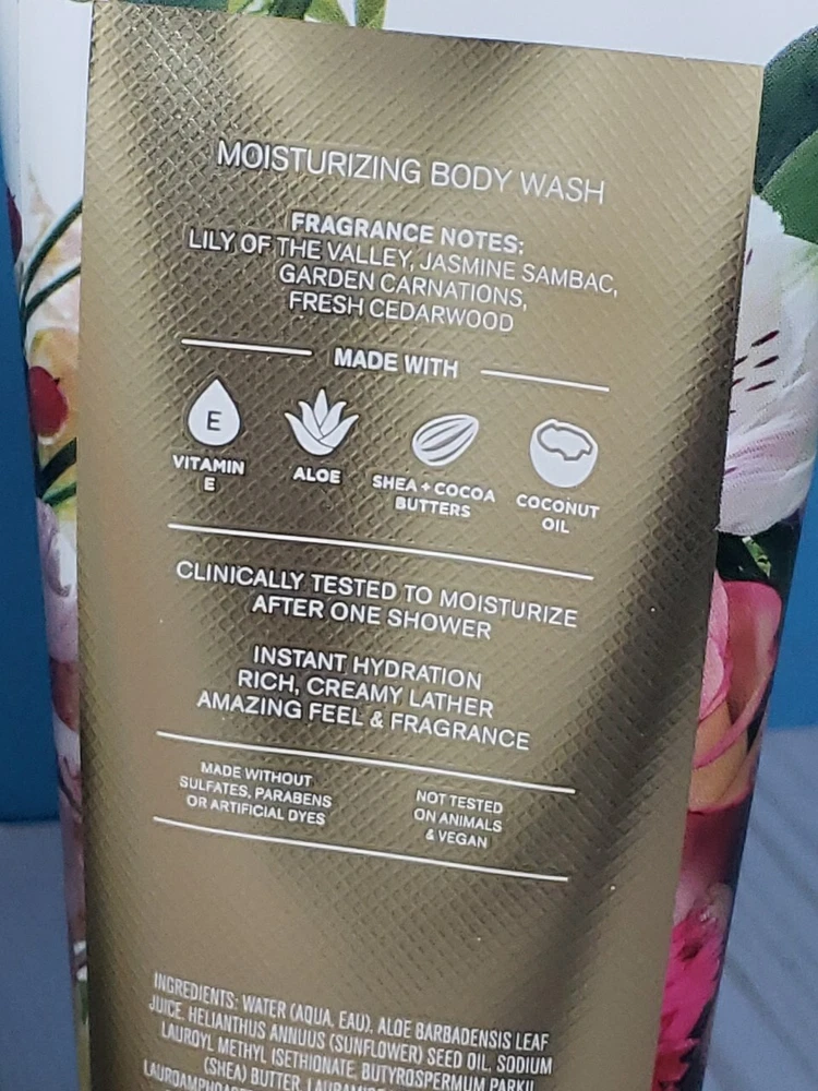 Size:RegularDepartment:WomenFormulation:CreamProduct Line:Bath & Body Works Moisturizing Body WashBrand:Bath & Body WorksVolume:10 fl ozFeatures:Cruelty-FreeUPC:667559145271Body Area:Bodygtin13:667559145271Ingredients:Coconut Oil, Shea Butter, Cocoa ButterType:Body WashSkin Type:AllScent:Lily of the Valley, Jasmine Sambac, Carnations, CedarwoodFragrance Name::Brightest BloomSize Type:Regular