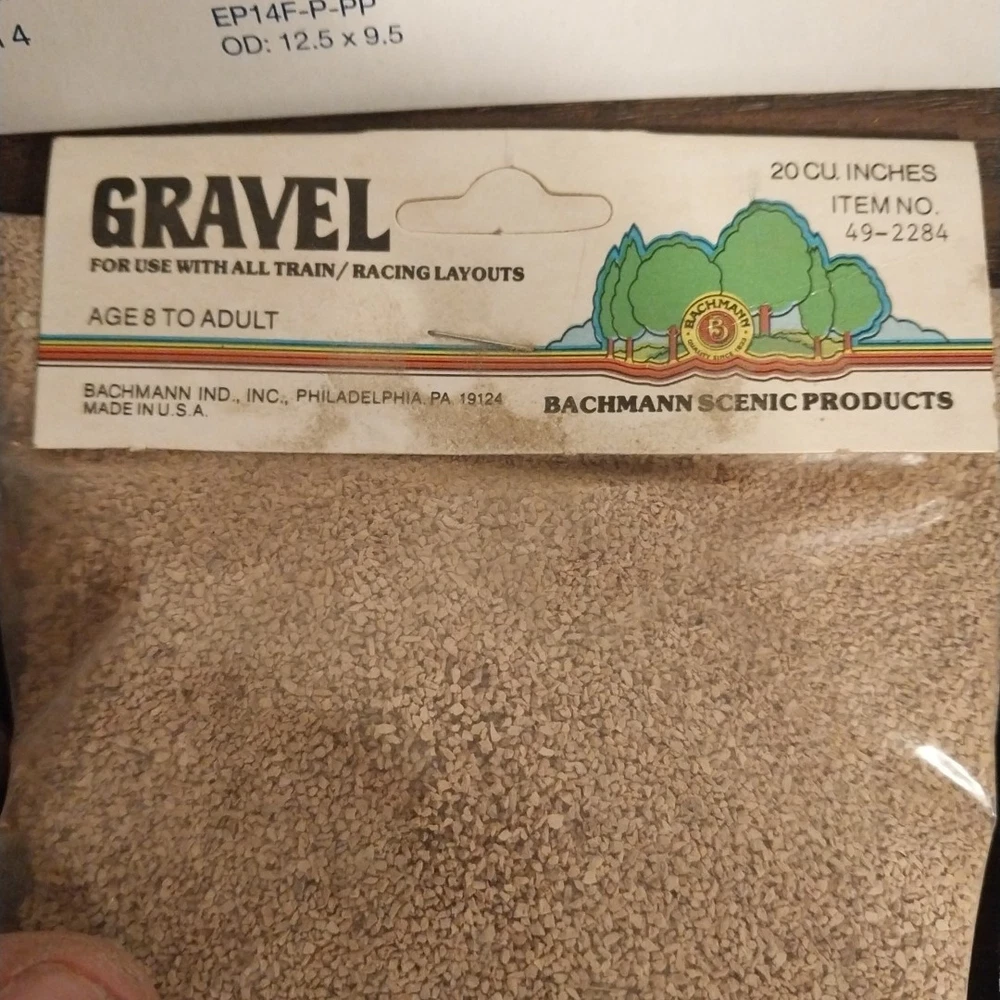 The product is a set of two new sealed Bachmann Bros Scenic Products, each containing 20 cubic inches of gravel. These items are vintage HO scale basic scenery pieces in a beige color, perfect for enhancing model railroad layouts or dioramas. Made in the United States, these gravel sets provide realistic detail for adding texture and depth to your miniature landscapes.