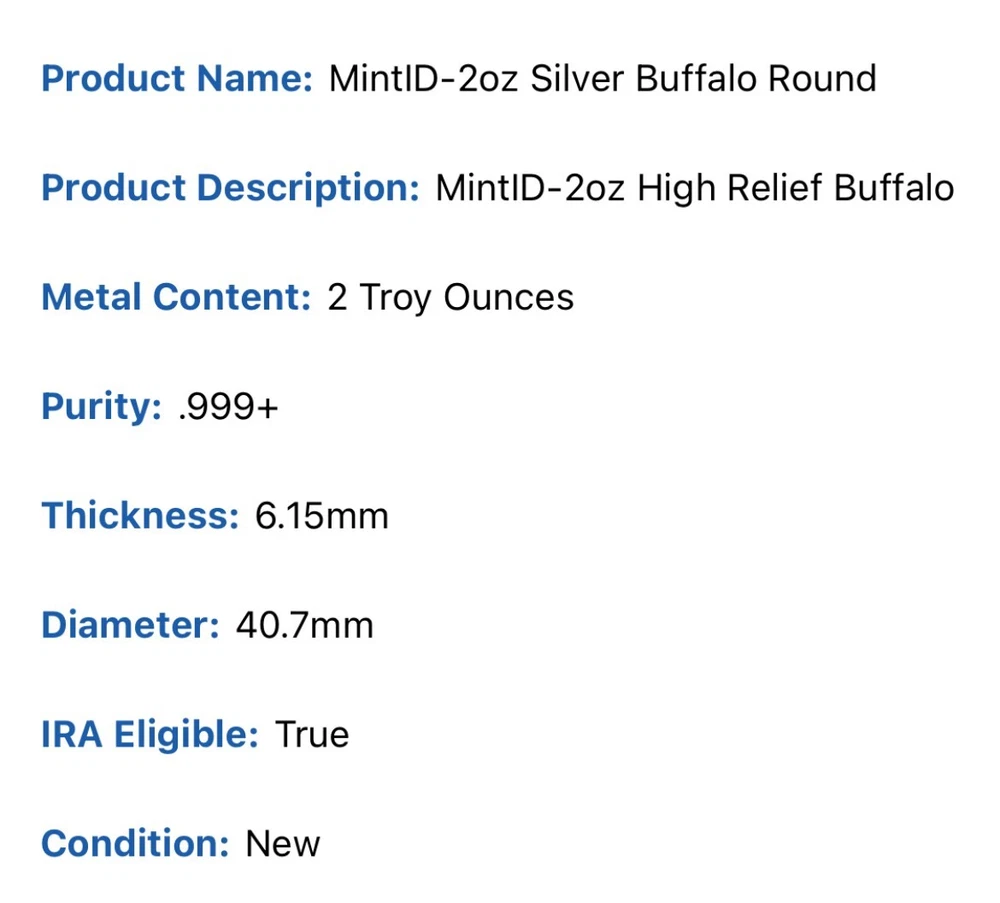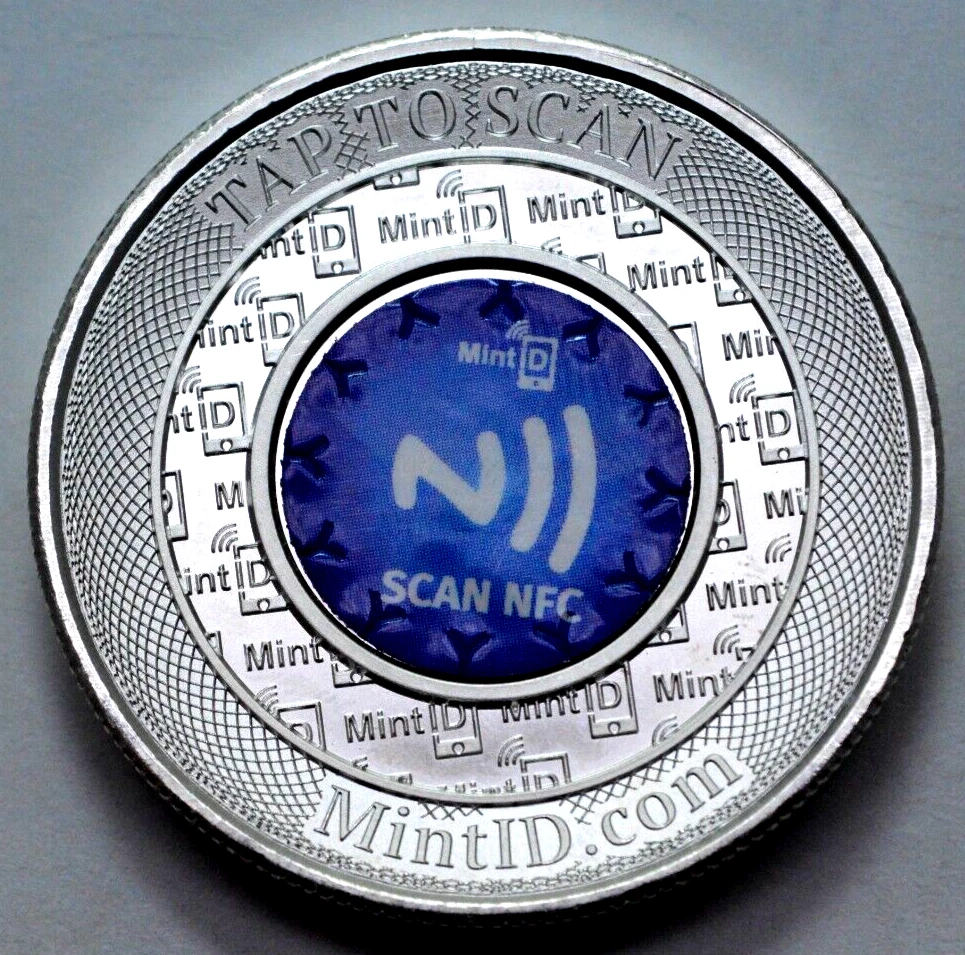 22 OZ 999 SILVER ROUND HIGH RELIEF BUFFALO BIZON HUGE COIN MintID.com TAP TO SCAN , No Reserve. This 2 oz MintID Buffalo Silver Round .999+ Fine with NFC Scan Authentication. Made with 2 troy ounces of .999+ fine silver, this is a MintID product that comes with a special, tamperproof NFC microchip. This special microchip is able to be scanned with your iOS or Android cellphone because it is linked to a cloud-based digital ID. This ID allows you to trace the scanning history of your silver rounds. When you buy silver rounds, take control of the security of your product. MintID is a company that holds the honor of manufacturing some of the world’s most secure bullion products. Each Buffalo silver round carries an AES-128 bit encryption microchip, which is completely attached to the round. This microchip meets the “Advanced Encryption Standard” (AES), which is US government-approved technology. The silver round’s microchip gives you access to authenticate your silver round at home for free with the MintID phone application. This can easily be found in your iOS or Android cellphone’s app store. After you scan your item through the application, you can access your product’s digital identity in the MintID Cloud. This allows you to trace the history of when and where your silver was scanned. And also, you do not have to worry about the microchip being removed because they are tamperproof, and the chip self-destructs if there has ever been any attempt to remove it. The obverse of the silver round showcases the American “buffalo” bison with the MintID logo beneath its head. Surrounding the buffalo is a crosshatch-style border. Inscriptions include the silver round’s weight and purity. The reverse of the MintID Buffalo silver round features the NFC microchip in the center. Behind that is a repeating pattern of the MintID logo and the same border found on the obverse. Inscriptions note the “TAP TO SCAN” instruction MintID website. You will NOT receive the exact item or with the same certificate number. This photograph is for reference purpose only. The actual item you will receive is guaranteed to be similar to that shown and exactly as described. Happy Bidding !!
