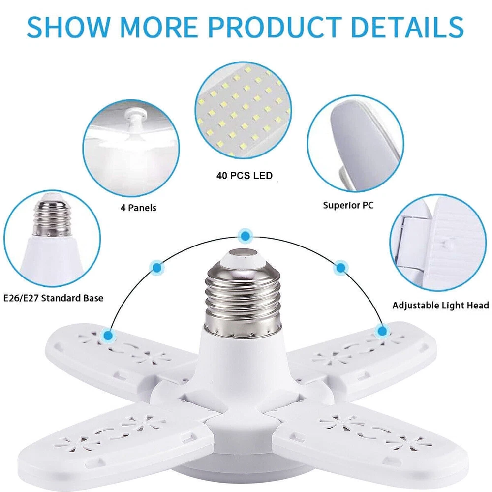 2 PACK E27 LED Garage Light Bulb Deformable Ceiling Fixture Lights Workshop Lamp Features: 【Mini Led Garage Lights 】It features LED technology top quality,28W, 6500K daylight for your garage, warehouse,providing the best indoor lighting experience. With 4 ultra-bright adjustable LED heads for your convenience to adjust the angle of light to focus the area your work. 【360°Illumination】The led garage lights. With 4+1 ultra-bright flexible LED leaves,The maximum coverage Angle of the light is 360 degrees. The garage lights provides 4000 lumens brightness for the best lighting experience. The Led garage ceiling lights for garage bathe your room in a natural glow that is vision-friendly and without glare. 【85% Energy Saving & Longlife】Equipped with SMD high quality LED chips, bigger emitting area, more brightness, efficient and energy saving, ensure the flex led panel bulb last up to 50,000 hours! Mind: When the adjustable garage lights are working, please DO NOT touch panels by hands directly, the panels are dissipating heat. 【 Easy To Install 】Just screw into E26/E27 socket base, you can install it easily just like screwing a traditional light bulb, no need for extra tools, no more wiring, and professional electricians. Note: Please turn off the power before installation. Specification: Combined size: 9cm * 6.5cm * 6.5cm Unfolded size: 19cm * 19cm * 8cm Net weight 80g (can be merged and expanded) Material: PP Product color: White Luminous color: Cold white 6500k Lamp holder clip: E27 Luminous: around 900 Lamp bead model: 2835 Total number of LED beads: 40 (8 per leaf) Adjustable angle: 180 ° Applicable to: rooms, hotels, restaurants, gardens, garages, factories, shopping malls, schools, restaurants, garages, kitchens, workshops Input wide voltage: AC85-268V 50/60Hz Power: 28W Usage: Install the E27 lamp holder and use the control switch directly Packaeg Includes: 2 Pack Deformable Lamp Shipping Payment Return & Refund policy Feedback Customer Support - Contact Shipping FREE SAME BUSINESS DAY MONDAY- FRIDAY SHIPPING FROM USA. All orders and payments received before 4PM EST (1PM PST) will be shipped the same business day. All other orders within 1 business day. No shipping on Weekends or US Public Holidays. No responsibility for any custom duty Shipping information will be updated when available. Payment We accept payment via PayPal. Use PayPal at checkout to pay with credit or debit. Immediate payment is required. Shipping will be arranged within 1 business day once payment is cleared. Return & Refund policy 1.We stand behind our items and offer 60 days warranty. All items are in new and working condition unless specified otherwise elsewhere in the description. 2.All Returns - defective or otherwise - MUST BE PREAUTHORIZED to guarantee refund or exchange. Please contact us to get an authorization and return address. 3.Buyer agrees to pay for the cost of re-shipment for undeliverable or wrong addresses. 4.Buyer is responsible for Return Postage as well as a 20% restocking fee if return/replacement is not a result of our mistake such as wrong item. 5.Replacement or Refund will be made upon receipt of the returned item. Please include tracking number so we can process ASAP. If you do not wish to wait for a replacement, please repurchase the item. 6.ALL REFUNDS will be processed via PayPal. Please double check via PayPal history and transaction for confirmation. PayPal will send it back to whatever you used to pay within 3-5 days. Feedback We strive to provide the best products and services. If anything about your transaction did not meet expectations, please CONTACT US and give us the opportunity to make things right. We are always here to help. Customer Support - Contact Please do not hesitate to CONTACT US. You can message 24/7 on eBay for all questions and inquiries. We will get back to you within 1-2 business days at the latest.