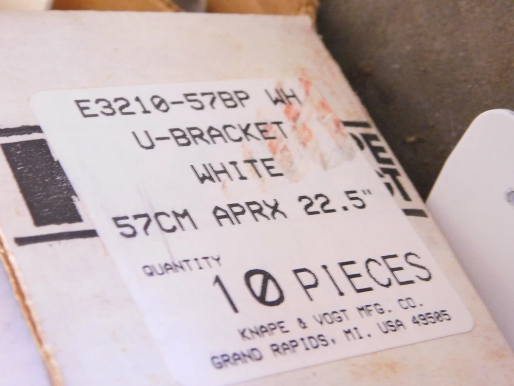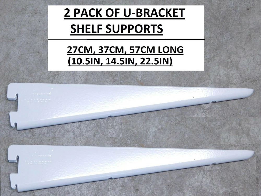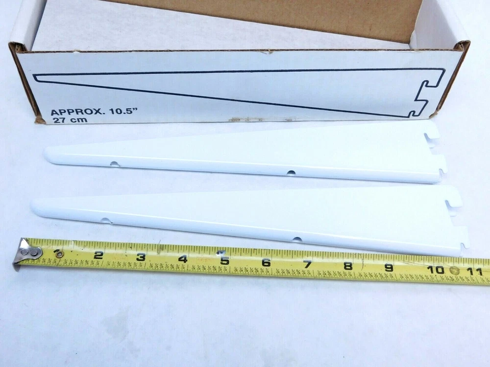 2 PACK OF SHELF BRACKETS! YOU CHOOSE THE SIZE WITH THE DROP BOX Knape Vogt Element 27cm (10.5"in) Model # - E3210-27BP WH 37cm (14.5"in) Model # - E3210-37BP WH 57cm (22.5"in) Model # - E3210-57BP WH WHITE Double Slot Shelf U-Brackets SEE PHOTOS FOR MORE DETIALS! FAST - FREE SHIPPING! WE SHIP WITHIN 24 HRS- MON-FRI. (USUALLY SAME DAY IF PAID BEFORE 3 PM. EST) UPS OVERNIGHT AND 2ND DAY AIR SHIPPING AVAILABLE. PLEASE MESSAGE US FOR PRICING AND OPTIONS! (EXPIDITED SHIPPING AT BUYERS EXPENSE) IF YOUR ITEM WEIGHS LESS THAN 16 OUNCES PACKAGED, IT WILL GO FIRST CLASS. BE AWARE! GUARANTEED DELIVERY DATES ARE CREATED BY EBAY AND MAY NOT BE ACCURATE. IF YOU NEED AN ITEM BY A CERTAIN DATE, CONTACT US AND WE WILL WORK WITH YOU. AN ADDITIONAL FEE MAY BE NECESSARY. ALL ITEMS GUARANTEED. NO QUESTIONS ASKED RETURN POLICY. FREE U.S. SHIPPING.. NOTE: IF WE ACCEPT AN OFFER LESS THAN THE ORIGINAL ASKING PRICE, WE WILL SHIP THE CHEAPEST WAY. 9 TIMES OUT OF 10, IF YOU PAY BEFORE 3:30 PM EST., MON-FRI, WE WILL SHIP THAT DAY ....WE HOPE THAT YOU ARE HAPPY WITH YOUR PURCHASE, BUT IF YOU ARE NOT, EMAIL US AND WE WILL DO WHATEVER WE CAN TO MAKE IT RIGHT...IF YOU ARE STILL NOT HAPPY, SEND IT BACK... BUT PLEASE GIVE US THE CHANCE TO SATISFY YOU! RETURN POLICY...FIRST EMAIL THAT YOU ARE MAKING A RETURN...SECOND IT MUST BE BACK IN THE MAIL WITHIN 30 DAYS FROM THE TIME YOU RECEIVE THE ITEM.ITEM MUST BE IN THE EXACT SAME CONDITION AS WHEN WE SHIPPED IT. THANK YOU FOR SHOPPING AT ALLEGHENY LIQUIDATORS ALLEGHENYLIQUIDATORS2012