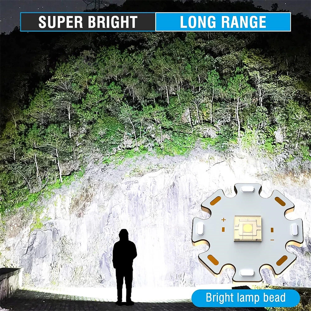 ☀ Super Bright Flashlight ✔ uses a super bright high power wick to drive away the darkness, with a maximum lumen value of 9900000 and a super long range of 1000 meters. Perfect for work, outdoor, camping, adventure and emergency. ☀ Rechargeable LED Flashlights ✔ with built-in rechargeable battery, equipped with USB-C charging port, charging time is only about 4 hours, in the brightest mode, usage time up to about 8 hours. And has a smart power indicator light 25%-50%-75%-100%, always know the power situation. ☀ 7 lighting modes ✔ The main light 3 modes, click the switch to enter (super bright - medium bright - flashing), side lights 4 modes, long press the switch to enter (super bright - medium bright - red - red and blue flashing), the flashlight can be turned off directly after 10 seconds of operation in each mode without having to cycle through all the modes. ☀ Tactical flashlight, adjustable focus. Many people say that the flashlight is too heavy, we solved this problem by using a high-quality ABS flashlight body and aluminum head. Combines quality with weight reduction. The flashlight weighs less than 150 grams and is much easier to use. ☀ Package includes: 2 x Flashlight, 2 x Build in Battery, 2 x Charging Cable, 2 x Rope. We have carefully checked all items before shipping to ensure that the product works properly. If you have any questions, please feel free to contact us to get the best solution within 12 hours. Note: 1. Due to the high working power of the super bright flashlight, the LED light position will generate more heat, please do not touch the light-emitting position (ie the head of the flashlight) with hands; 2. Do not use the flashlight in water, do not immerse; 3. Do not irradiate the human eye; 4. Do not give it to children to use.