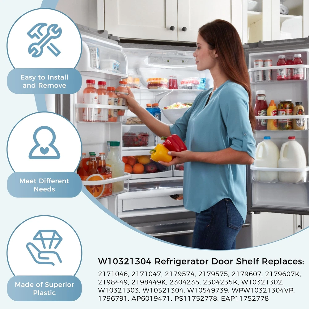 [Upgraded - Premium] W10321304 refrigerator door shelf are upgraded to food-material, safer and stronger, W10321304 whirl-pool shelf help you and keep your fridge neat [Product Size]: W10321304 refrigerator door shelf bin Length: 16.3 inches, Width: 7.2 inches, Height: 3.4 inches,Before purchasing, please check the part number or measure the original size to make sure that the shape and size are the same!If you are not sure if it is the right machine for you, please feel free to us and we will be happy to answer your questions [Replace Part]: WPW10321304 whirl-pool fridge door shelf replace part: 2171046, 2171047, 2179574, 2179575, 2179607, 2179607K, 2198449, 2198449K, 2304235, 2304235K, W10321302, W10321303, W10321304, W10549739, WPW10321304VP, 1796791, AP6019471, PS11752778, EAP11752778 [W10321304 Door Shelf Bin]: W10321304 Ken-more door bin/Ken-more refrigerator door shelf fit for Ken-more, Whirl-pool, May-tag, Ama-na, Es-tate, Kitchen-Aid refrigerator WRS322FDAB00 WRS322FDAW04 WRS325FDAB02 WRS325FDAB06 WRS325FDAM02 WRS325FDAM04 WRS325FDAM01 WRS325FDAD02 RS325FDAT04 WSF26C3EXF01 WSF26C2EXY02 ED5FHEXVS00 ED5LHAXWB02 ED5LVAXWQ02 ED5FVGXWS00 ED5FVGXWS07 [Buy With Confidence]: The WPW10321304 ken-more door shelf supports 365 days return and exchange,We have a professional after-sales service team, if you have any question about this whirl-pool wrs325fdam04 door shelf , please feel free to us through or question and answers, we will solve your problem within 24 hours. Don’t hesitate to solve the refrigerator problem easily