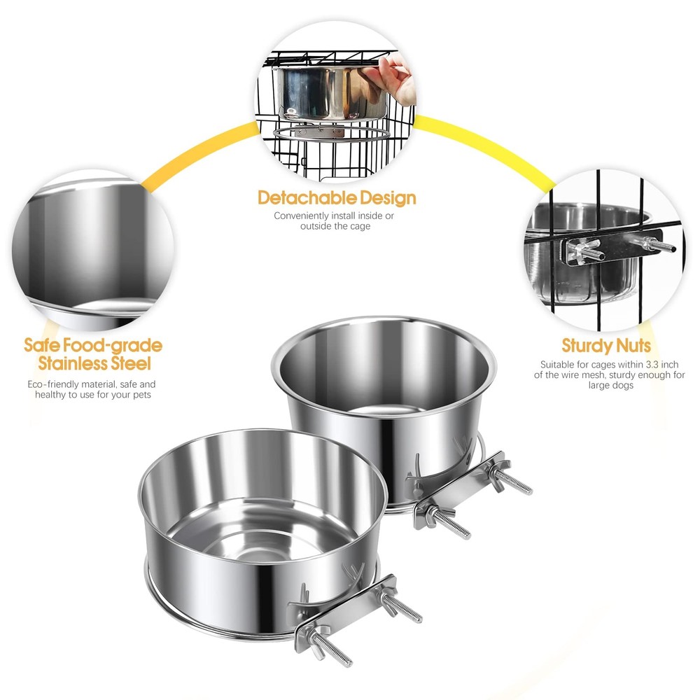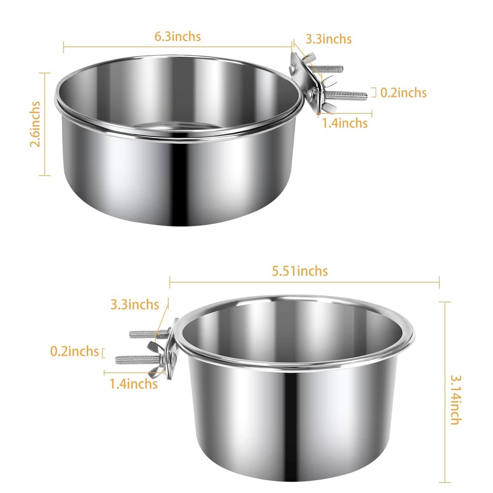 2 Pack Dog Food Water Bowls for Cage Stainless Steel Removable Pet Kennel Bowls with Clamp Holder Hanging Feeder for Large Dogs Huge Pets Features: 1. Premium Material Made of durable and sturdy stainless steel, dishwasher safe, no worry about your pets will chew it. 2. Large Enough The pet bowls are large enough to hold enough food and water for larger dogs. It will satisfy their hydration needs when you are out of the house. 3. Easy to Install The bowls are separate from the holders, you can easy to put on or take out the bowls for you to fill and wash them conveniently. You can attach the food feeder inside or outside of your pet's cage. 4. Comfortable for Eating Attach them to the proper height on the back of the crate allowing your pets to use them easily and without having to bend excessively. 5. Keep the Kennel Clean Fixed with a clamp holder, the wing nut attachments make the bowl super sturdy, your lovely pets can not dump the bowls, no spill of food or water and less wasted. 6. Perfect for Playful Pets Our pet bowls for the cage is a must-have for clumsy puppies and large dogs who love knocking over bowls on purpose, suits most kennels crates and cages Package Includes: 2x pet bowls 2x clamp holder 【Anti-spill】: The bowl and holder attach easily and securely to the cage, so your pets can freely get a drink or food without making a mess. You don't need to worry the bowl will tip over resulting in your pets being wet. ( Note: Suit for medium and large-breed pets. ) 【Durable & Easy to Clean】: Made of food-grade stainless steel, rust-resistant and safe to use, does not leave any smelly odors. Easy quick cleaning for stainless steel bowls, the bowls are removable for easy clean-up and support washing by dishwasher. 【Save Space & Keep Neat 】: By having the bowls raised off the kennel floor, there is more sleeping area and space for a litter pan. It won't wobble or spill, you don't have to clean up dumped water dishes every day. 【Easy to Install 】: The mounts are easy to maneuver and are very sturdy to keep the food and water where they should be. Our dog bowls can securely attach to pet crates, cages, or kennels. 【What You Will Get】: Including 2 size bowls. The smaller one you can use as food bowls. The larger one you can use it as a water bowl. Buy with confidence! If you have any problem with our products, please freely.