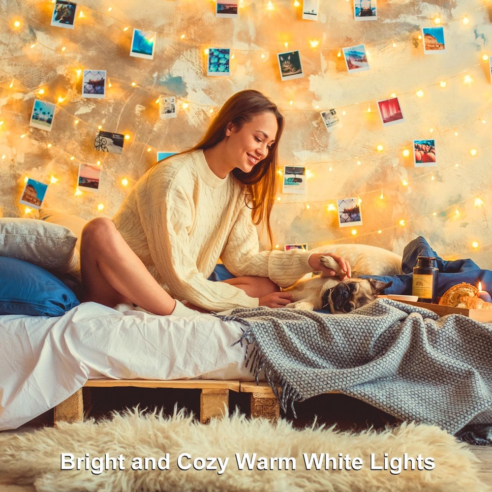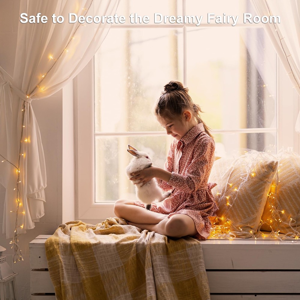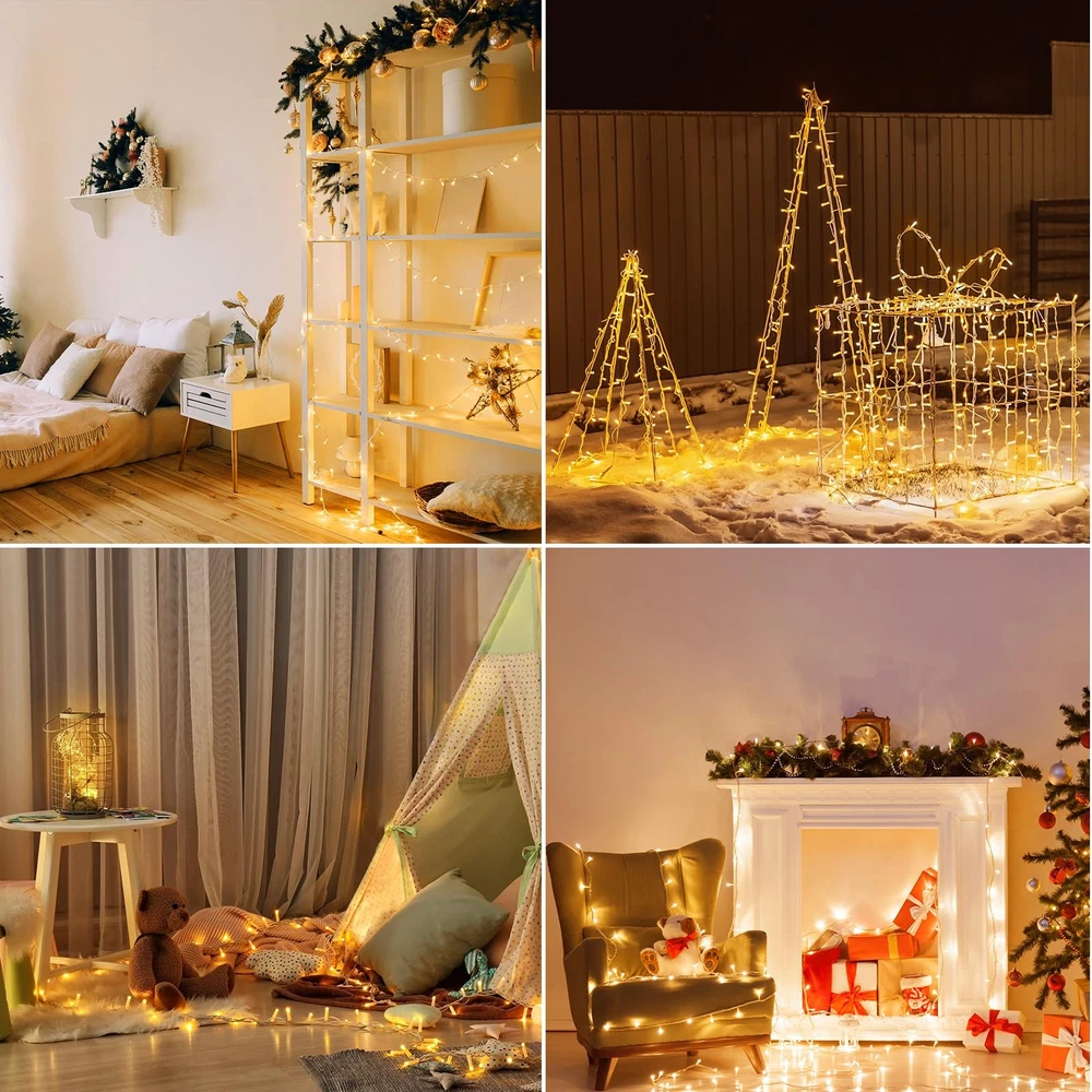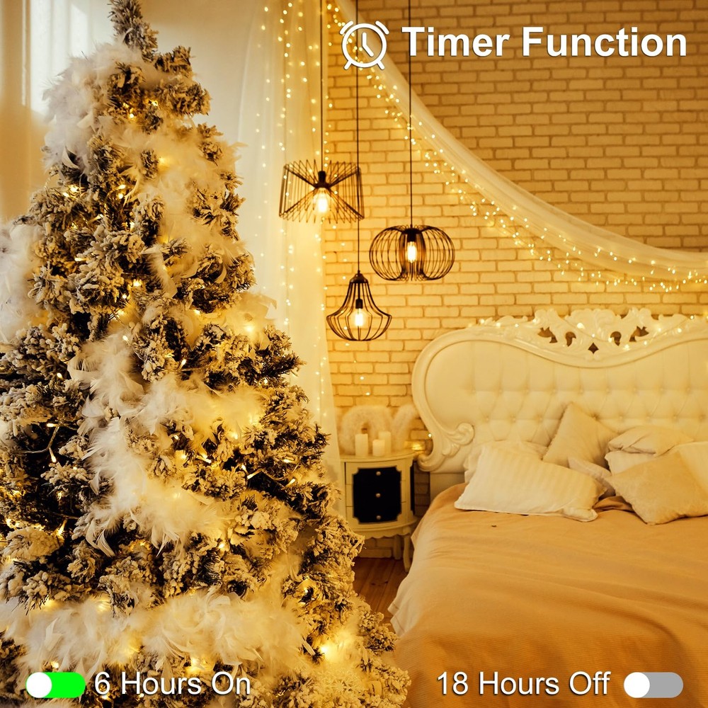 2 Pack Battery String Lights 33Ft 100LED Fairy String Lights with Timer Remote 8 Modes Twinkle Lights for Valentine, Easter, Wedding, Christmas, Girls Bedroom, Patio, Indoor Outdoor Decoration Specification: Light Color: Warm White LED Quantity: 2*100 Strip Length: 2*33ft Lead Length: 50cm Waterproof Rate: IP54 Power Source: 3 AA batteries (not supplied) 8 Modes: Combination/ Wave/ Sequence/ Slow/ Chase/ Flashing/ Slow fade/ Flashing/ Flickering/ Steady on Package Content: 2 x 100 LED waterproof battery fairy lights string Longer String Lights: 2 pack 33ft led battery string lights with 100 led lights, which are providing enough length to surround and decorated the objects,like the Christmas tree, curtain,staircase, terrace, trees. Illuminate your outdoor and indoor spaces with these cozy bright fairy light Timer & 8 Lighting Modes: Warm white string lights battery operated come with a remote to set timer function for 6 hours on and 18 hours off and adjust the 8 Lighting modes and brightness to suit your mood or occasions Outdoor Waterproof String Lights: Our twinkle string lights are designed with IP54 waterproof rating to withstand various weather conditions. You can place the battery string lights outdoor and indoor Safety and Energy Saving: LED string lights are powered by 3 x AA batteries (not included),lower output won't overheat after long time use. High safety for pet and kids. Low consumption also can provide a bright and consistent light Widely Appication: Fairy string lights is perfect decoration for outdoor and indoor, adding the wonderland charm for bedroom, wedding, Christmas tree, terrace, patio, lawn, balcony, porch, garden, commercial building, shopping center etc