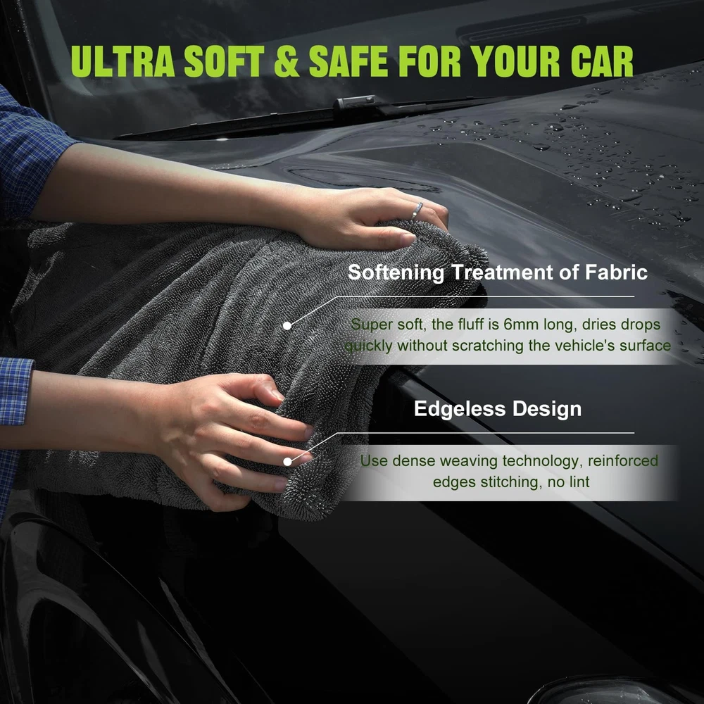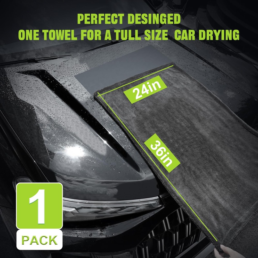 1 COMPLETE CAR WASH KIT - This car cleaning kit includes a 24" x 36" microfiber towel for the entire car body and a 16"x16" microfiber cleaning cloth perfect for windows, mirrors. The car wash mitt for wheel, rim, wing mirrors and many other awkward angles around the car. The car detailing brush perfect for car interior, the comprehensive car detailing kit ensures effective and thorough car cleaning for both exterior and interior without any scratches, lints, and streaks leaving behind PREMIUM TWISTED LOOP MICROFIBER - Made with ultra-soft 1300GSM microfiber, our drying towels car detailing provides superior water absorption, dry your entire car or truck in just one stroke with this microfiber drying towel. Ensuring a streak-free finish and ultimate drying performance for all vehicles SUPER ABSORBENT & VERSATILE - This car towels drying are designed to be soft yet highly effective. The edgeless design and premium microfiber ensure a smooth, scratch-free clean on all paint finishes. The 1300 GSM microfiber towels for cars has ultra-absorbent, absorbs over 6 times more than other towels. The large size and advanced microfiber design make it ideal for drying large vehicles like SUVs and cars DURABLE & EASY TO CLEAN - Machine washable and built to last, these microfiber cleaning cloth are perfect for regular use. They’re suitable for low-temperature drying, ensuring they remain in top condition for hundreds of washes. These durable microfiber towels for cars simplify your cleaning routine and quickly dry for repeated use, making them an excellent choice for busy households and auto enthusiasts GENTLE YET EFFECTIVE HAND CAR WASH MITT - The car cleaning mitt with double sided high density & soft microfiber chenille noodles holds 7x its weight in soapy water, allowing you to softly yet quickly cover large surfaces. They mould well to the shape of the hands, enabling easier reach to every little spot like rims, air vents. Elastic wrist cuff helps keep mitt in place on hand
