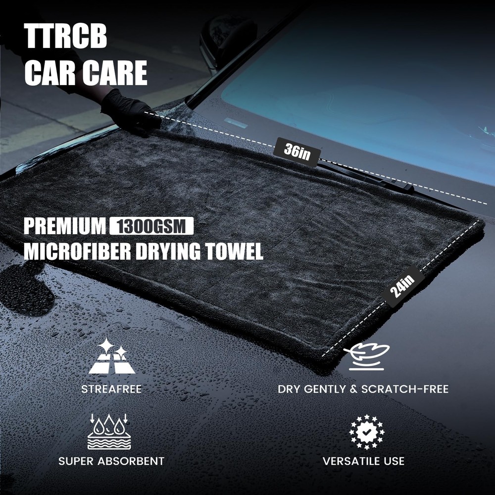 1 COMPLETE CAR WASH KIT - This car cleaning kit includes a 24" x 36" microfiber towel for the entire car body and a 16"x16" microfiber cleaning cloth perfect for windows, mirrors. The car wash mitt for wheel, rim, wing mirrors and many other awkward angles around the car. The car detailing brush perfect for car interior, the comprehensive car detailing kit ensures effective and thorough car cleaning for both exterior and interior without any scratches, lints, and streaks leaving behind PREMIUM TWISTED LOOP MICROFIBER - Made with ultra-soft 1300GSM microfiber, our drying towels car detailing provides superior water absorption, dry your entire car or truck in just one stroke with this microfiber drying towel. Ensuring a streak-free finish and ultimate drying performance for all vehicles SUPER ABSORBENT & VERSATILE - This car towels drying are designed to be soft yet highly effective. The edgeless design and premium microfiber ensure a smooth, scratch-free clean on all paint finishes. The 1300 GSM microfiber towels for cars has ultra-absorbent, absorbs over 6 times more than other towels. The large size and advanced microfiber design make it ideal for drying large vehicles like SUVs and cars DURABLE & EASY TO CLEAN - Machine washable and built to last, these microfiber cleaning cloth are perfect for regular use. They’re suitable for low-temperature drying, ensuring they remain in top condition for hundreds of washes. These durable microfiber towels for cars simplify your cleaning routine and quickly dry for repeated use, making them an excellent choice for busy households and auto enthusiasts GENTLE YET EFFECTIVE HAND CAR WASH MITT - The car cleaning mitt with double sided high density & soft microfiber chenille noodles holds 7x its weight in soapy water, allowing you to softly yet quickly cover large surfaces. They mould well to the shape of the hands, enabling easier reach to every little spot like rims, air vents. Elastic wrist cuff helps keep mitt in place on hand
