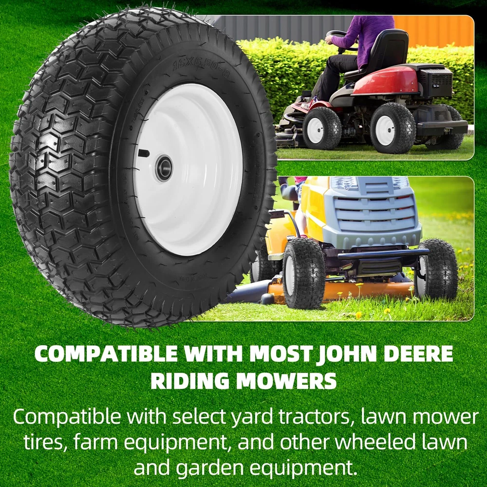 EXACT 16 X 6.50-8 TUBELESS TIRE AND WHEEL ASSEMBLIES - They're an exact for 16x6.5-8" tubeless mower tire and wheels, with John Deere Riding Mowers and most Mowers. 16 inches outer diameter, 6.6 inches section width, and 8 inches rim size. WITH MOST JOHN DEERE RIDING MOWERS: with select yard tractors, lawn mower tires, farm equipment, and other wheeled lawn and garden equipment. These are NHS tires not for use at highway speeds. Check the sidewall of your riding mower's existing front tires for information on the exact size of the tire and wheel. 3" OFFSET HUB AND 3/4" BEARINGS - This 2-pack tire and wheel assembly are also with other brands and models of riding mowers and lawn tractors. Aside from having the exact wheel size, you should also ensure that your existing riding mower's wheel assembly has a 3-inch offset hub and a 3/4-inch diameter Bearings. (Extra 5/8" Bearings x 4pcs; metal washers x 12pcs) 600 LBS MAXIMUM LOAD RATING - These tires were made for hauling and carrying relatively heavy loads. Not for highway service (NHS) tires like these are 4-PLY with a maximum PSI of 30. Made from premium quality rubber compounds that remain reliable and durable throughout all seasons. And with a maximum load capacity of 600 pounds for each tire and wheel assembly, you can do more for less. TURF TIRE TREAD FOR MINIMAL SURFACE DISTURBANCE - Mainly designed for turf, the treads on these tires have shallower depths and a wider footprint to minimize disturbance and damage on turf, natural grass, and other sensitive surfaces. These treads also offer stability on gravel and sand. There's also a noticeable improvement in both traction and maneuverability compared to regular tires.