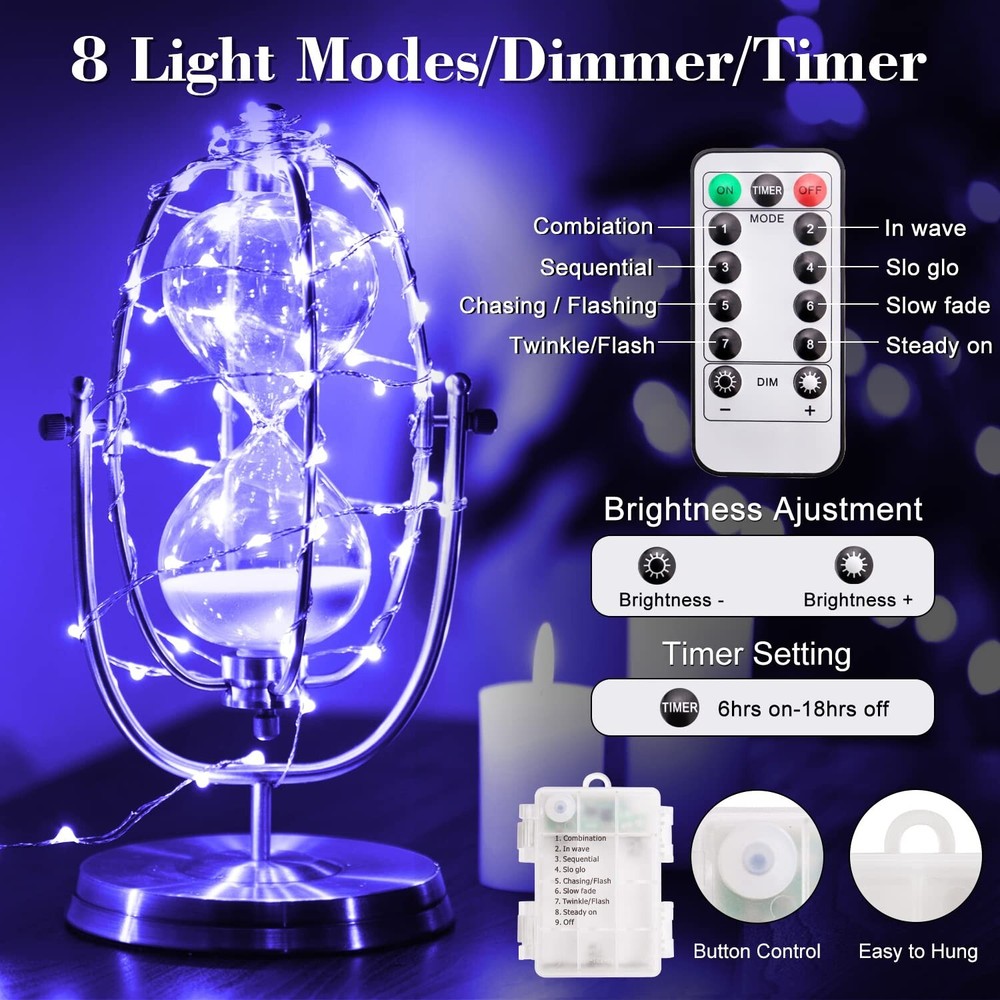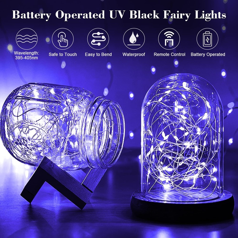 2 Pack 16.4 Ft 50 Led Black Light Fairy Lights, UV Fairy Lights Battery Operated with Remote & Timer, 8 Modes UV Black String Lights for Glow Party Body Paint Halloween Décor Product Details Size: 16.4Ft Brand: Smacen MPN: UA10001 UPC: 766381576205 EAN: 0766381576205 Color: Purple Brand: Smacen Indoor/Outdoor Usage: Indoor Special Feature: Timer Light Source Type: LED, Fluorescent Power Source: Battery Powered Light Color: Purple Theme: Halloween Occasion: Wedding, Christmas, Halloween Style: Modern Package Dimensions : 4.17 x 3.23 x 3.15 inches; 5.61 ounces Item model number : UA10001 Date First Available : March 21, 2023 Manufacturer : Smacen Customer Reviews: 4.6 4.6 out of 5 stars 47 ratings Color: Purple Brand: Smacen Indoor/Outdoor Usage: Indoor Special Feature: Timer Light Source Type: LED, Fluorescent Power Source: Battery Powered Light Color: Purple Theme: Halloween Occasion: Wedding, Christmas, Halloween Style: Modern Material: Copper Controller Type: button Number of Light Sources: 50 Voltage: 3.5 Volts (DC) Wattage: 5 watts Included Components: 2 fairy lights Number of Items: 2 Control Method: Remote Water Resistance Level: Waterproof Seasons: Halloween UPC: 766381576205 Manufacturer: Smacen Item Weight: 5.6 ounces Package Dimensions: 4.17 x 3.23 x 3.15 inches Item model number: UA10001 Special Features: Timer Batteries Included?: No Batteries Required?: Yes Date First Available: March 21, 2023 High quality Black Lights 16.4 feet long silver copper thin wire with 50 high quality LED lights(Wavelength: 395-405nm), 4 inches distance between LED bulbs. With steady 360 degree viewing angle they illuminate in every direction. Battery Operated The uv String Lights with a waterproof battery box is portable and flexible.Powered by 3pcs AA batteries (battery not included),and it could be easily controlled by a button on the battery compartment. The copper wire used by the LED fairy lights is also waterproof and can be used indoors and outdoors. Remote Control It enables you to switch eight flashing modes, and adjust the brightness quickly. Additionally, the timer function allows us to set up on/off time for 6hrs on/ 18hrs off. The blacklight fairy lights will turn on automatically by settings, helping you to create a magic light show in the future. Easy to Shape and MoldThe premium quality copper enhance the toughness of the UV black lights. It can be bent, twisted, wrapped and shaped into any styles you want. Not easy to break.perfect LED string lights for home party ,wedding,festival decorations. Safety and applicationCopper wire UV fairy light, low power, energy saving, can be touched, almost no heat when in use, It perfect for room decorations,black light posters, bedroom, stage lighting, Bodypaint, fluorescent painting, gallery, special effects, wedding, balcklight glow party, Halloween, Christmas. Magic UV Fairy Lights The UV black light can produce special lighting effects, Make fluorescent materials glow in the dark, and Create an amazing atmosphere at a show or party. Perfect for any of your stage lights, UV Bodypaint, fluorescent poster, birthdays, black lights glow party and Halloween celebrations. Any place including gym, studio, club, bar, church, gallery, disco, KTV and house decoration. How to get better led blacklight effect? 1. Make sure the room is completely dark. 2. The more UV black light is applied, the brighter it emits. 3. The more sensitive the fluorescent material, the brighter the light. 4. The closer the light source is to the fluorescent material, the brighter the light will be. Warm Tips: 1.Please note this black light isn't supposed to light up your whole room with purple glow or provide ambient lighting. 2. The wavelength of uv fairy lights is 395-405nm, our naked eyes may see their light as blue or blue-violet, please feel free to use. 3.The fairy lights can be immersed in water, but battery box is not waterproof and can't be immersed in water. 4.It is recommended that you buy some replacement batteries and replace them with new ones if necessary, so that the product can work normally. 5. Please install high quality batteries in the battery case, bad battery will cause leakage and break the metal part inside the battery case. Specifications: Length: 16.4FT/5M LED Quantity: 50 LEDs Color: UV black light Wavelength: 395 ~ 405 nm Battery: 3AA Batteries (Not including) Function Mode: 8 flashing modes Wire Material: Copper Wire(Silver Color) Waterproof Grade: IP65 Package includes: 2 x Fairy Lights