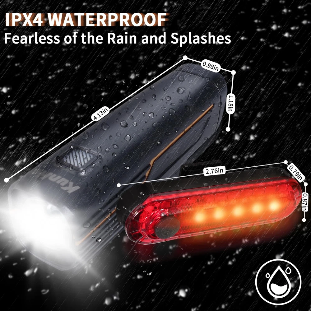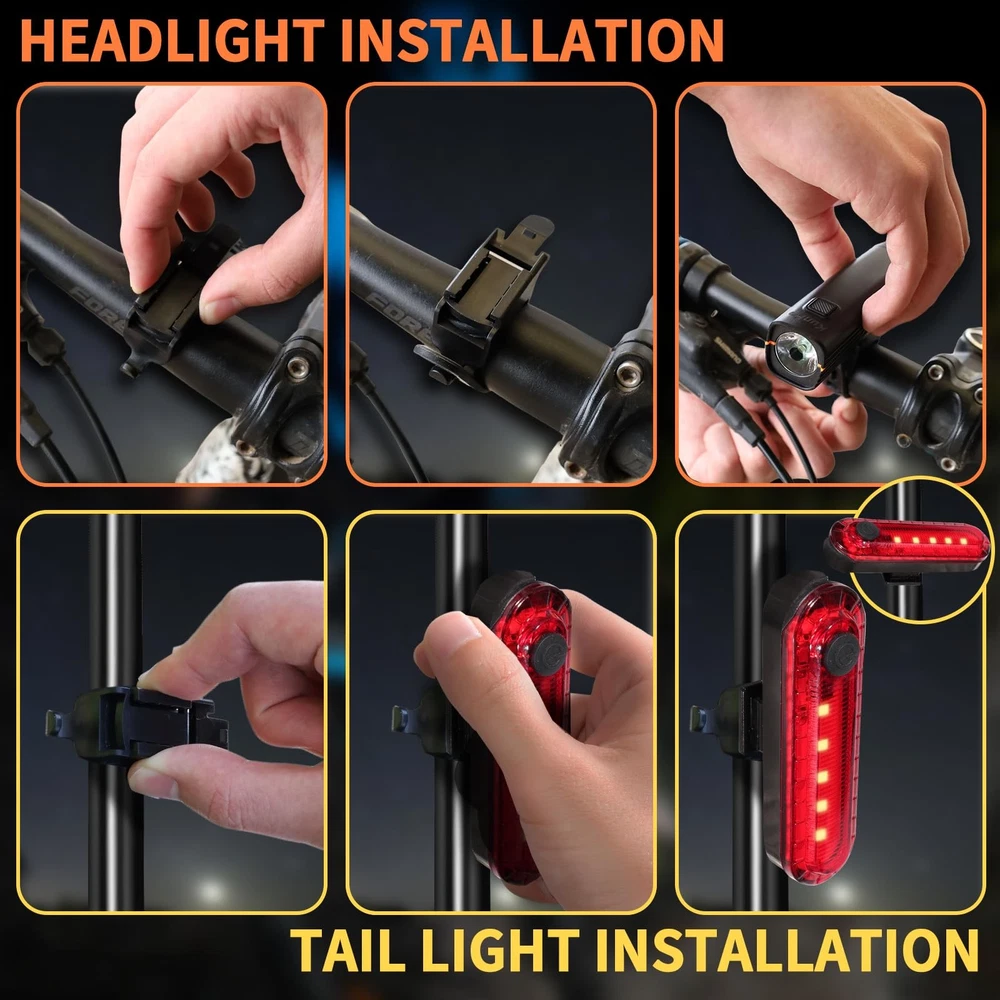 Luminate your nighttime cycling adventures with our top-of-the-line bike lights designed for optimal visibility and safety. These powerful LED lights ensure you remain visible to motorists and pedestrians, allowing you to ride confidently even in the darkest conditions. The front and rear lights provide a bright, focused beam that illuminates the road ahead while alerting those behind you. Lightweight and durable, these bike lights are easy to install and remove, making them a must-have accessory for any serious cyclist. With long-lasting battery life and multiple lighting modes, you can customize your setup based on your riding needs. Stay visible, stay safe, and enjoy the freedom of night riding with our top-quality bike lights. Ultra-Bright Headlight & Safe Taillight: This bicycle light set includes 4 high-brightness 227-lumen front lights and 4 warning tail lights to ensure better visibility and safety when riding at night. The front light has a battery life of 4 hours and the rear light has a battery life of 5 hours. Advanced Design: Our bicycle bike light adopts miniaturized design, the volume is only the size of the palm, and the weight is less than 3.53 oz. ABS+PC material is strong and durable, with waterproof protection function, it can withstand light rain and splashing water, ensuring reliable performance in different weather conditions. Large Battery Capacity & Long-Lasting Performance: Equipped with a 1600mAh high-capacity battery, this bike light provides extended illumination for city commuting, outdoor cycling, and more. Enjoy a longer, more reliable ride! Multiple lighting modes and easy operation: one-touch start, single-click to cycle through 100%/75%/25% three-level brightness and flash mode. Single-handed blind operation completes mode switching, no complicated operation process, always keep your sight focused while riding, taking into account both efficient lighting and driving safety. Easy to install: Our bicycle light comes with a mounting bracket and elastic band, which is tool-free and easy to install. It can be easily installed on the bicycle handlebar and rear seat post without any tools. The easy disassembly function can be switched in multiple scenes.