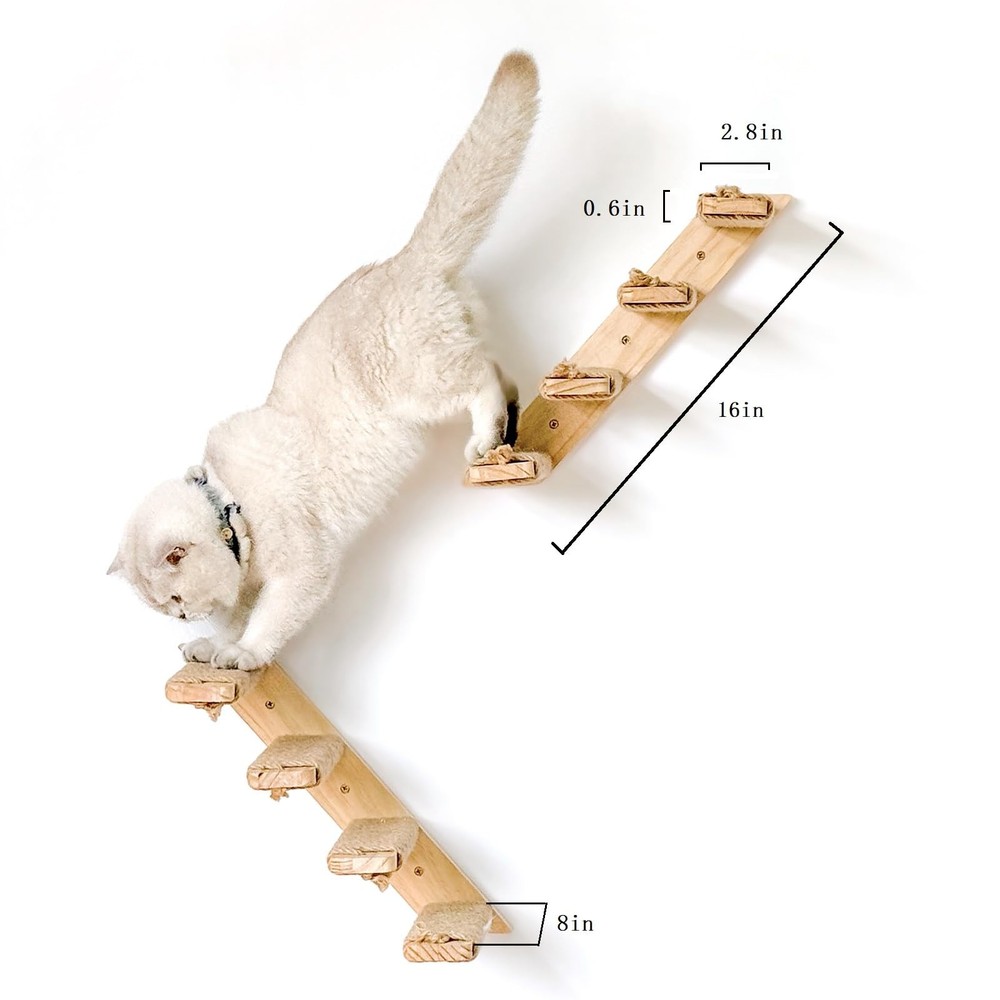 Cats naturally enjoy climbing, jumping, and playing high up. 's wall mounted 4-step cat staircase has a width of 2.8 inches and a length of 8 inches, providing a pleasant playground for your cat to play in. Paired with a cat wall mounted bed, the effect is even better. The cat stair have 2.8 inch steps and a larger rope winding area, which is beneficial for improving climbing adhesion. Both large and small cats can climb. You can also pair it with a cat bed to allow your cat to climb, sleep, and exercise. Flexible design, this cat stair adopts a more flexible design that allows installation from left to right or right to left on any wall. Simply drill holes and secure the shelf with screws. Before installation, please ensure that your wall is suitable for wall mounted products. Durable and sturdy, our cat stair has 3 installation holes made of natural pine wood and sword rope. Cats can scratch freely, pine wood does not slide, hemp rope does not loosen, and your cat can still climb safely. Kind reminder: The appearance of natural wood may vary slightly due to the impact of storage environment. Perfectly integrated, pine and hemp rope adopt the original wood color, which can perfectly blend into the family environment. cat stairs can help you DIY your house into a paradise for you and your cat. The design is lightweight, using the lightest wood as the raw material while meeting the requirements of the first four points. The total weight of the 2pack 4steps is only about 3.5 pounds, greatly reducing the load on the wall and providing some protection for the wall. More sturdy than the old style, our new cat step has been replaced with larger screws with a diameter of 5 millimeters, which makes the step more sturdy and can withstand weights of over 30 pounds