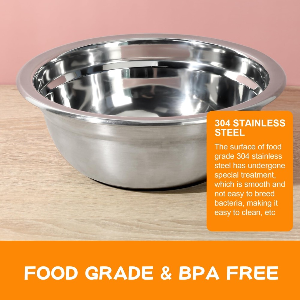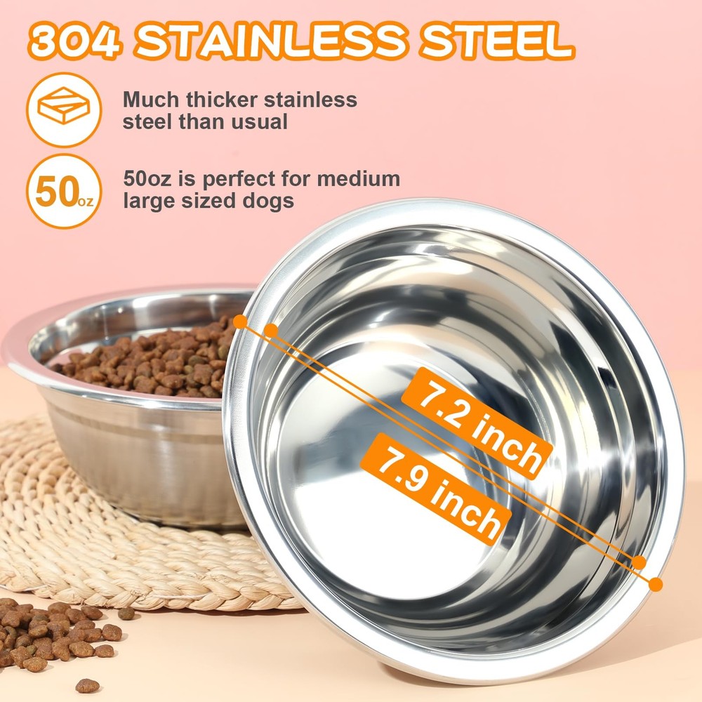 50oz stainless steel dog bowl, polished to a mirror sheen. The flat bottom design prevents your pet from turning the bowl over, giving your dog a better dining experience. 304 Stainless Steel: This thickened dog bowl is made of 304 stainless steel, food grade material, will never rust or warp. Suitable for medium and large dogs, bowl is safe and durable. Large Capacity: Single dog food bowl 50oz (8" wide) is perfect for medium to large pets. No need to add food and water frequently, making your dog happier to eat. Easy To Clean: Dog water bowl can be rinsed directly under running water and also supports dishwasher cleaning. Reduce the burden of cleaning. Widely Used: The 2-pack of dog bowls can be used individually or in combination with the elevated dog bowl stand (fits all dog bowl stands in shops). Lightweight and portable for travelling. Dog bowl inner diameter: 7.2inch, outer diameter: 7.9inch. Fit for all of elevated dog bowl stands DB-G01/DB-LBG01/DB-B01/DB-SB01/DB-SG01/DB-G03/DB-B03/DB-02. Premium Stainless Steel Material: dog bowl is made of thickened steel plates which can extend service life and never rust. The standard 8-inch bowl is widely used and is suitable for almost dog bowl stand. Bowl edge is flat to protect your dog from eating safely. Large Capacity: 50oz Thickened dog bowls are made of 304 stainless steel, impossible to deform. It can hold enough food and water, ideal for medium and large dogs. Easy To Clean: The dog food bowl is dishwasher safe and very easy to clean by water rinse. Dog water bowls won't spill or slip when use them. Stackable & Easy storage: The bowls are designed to stack easily for storage or travelling. Durable, non-toxic and healthy.