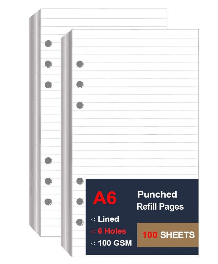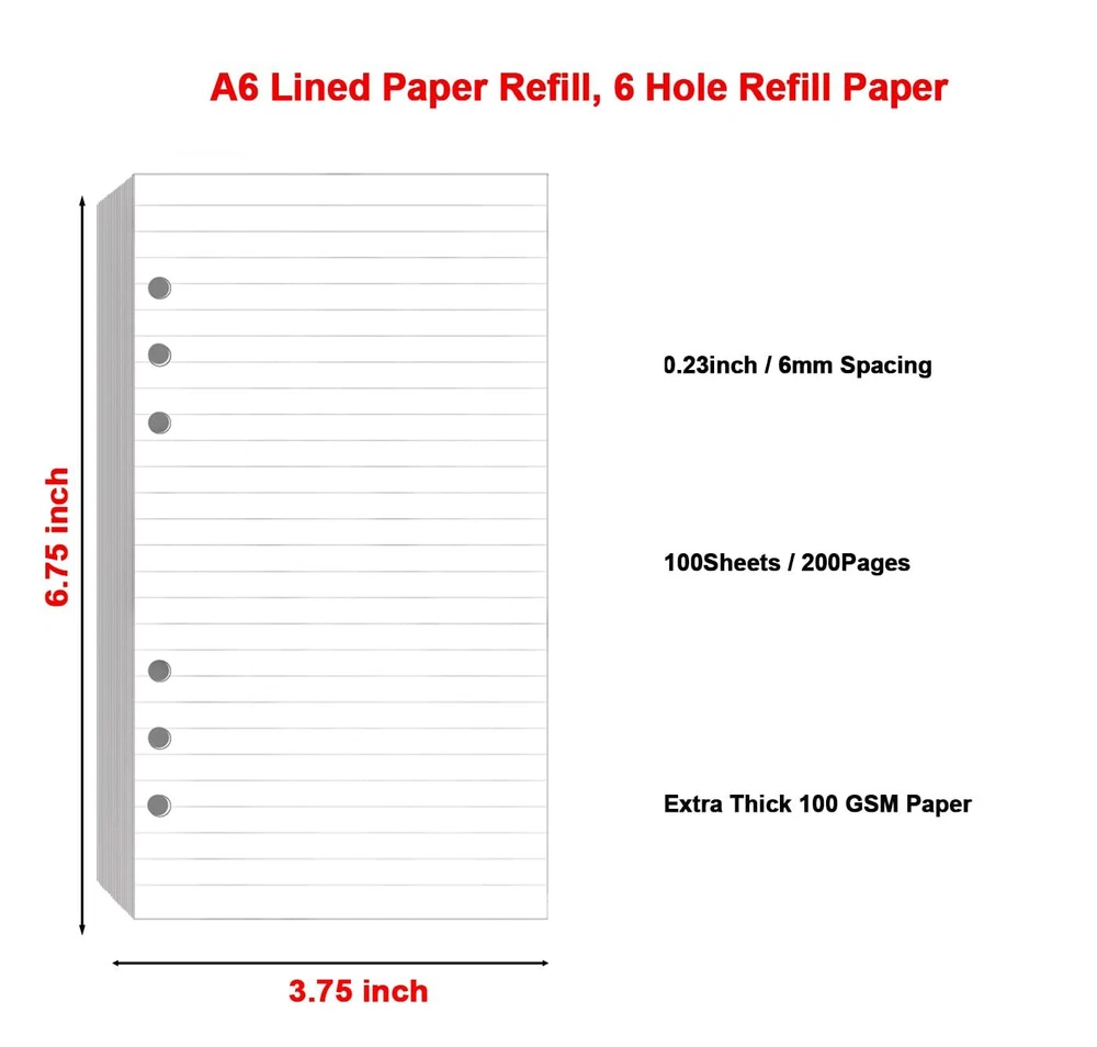 STANDARD 6 HOLE - Personal refills with standard 6 hole design refill paper works perfectly for 6-ring Filofax Personal Binder, LV Agenda MM etc. Prepunched filler paper, no hole punch required. LINED REFILL PAPER - 3.75" x 6.75" refill line paper, With the line spacing of 0.23 inches/6mm, double side clear black lines, Conveniently record your work and study. PREMIUM PAPER - Filler paper is made of 100gsm premium white paper for smooth writing, and heavy-weight, acid-free paper to avoid ink bleed through. Suitable for fountain pen, gel pen, roller pen, ballpoint pen, highlighter, pencil, neutrals and etc. All pens write smoothly on the lined paper refill. STANDARD 6 HOLE - Personal refills with standard 6 hole design refill paper works perfectly for 6-ring Filofax Personal Binder, LV Agenda MM etc. Prepunched filler paper, no hole punch required. LINED REFILL PAPER - 3.75" x 6.75" refill line paper, With the line spacing of 0.23 inches/6mm, double side clear black lines, Conveniently record your work and study. PREMIUM PAPER - Filler paper is made of 100gsm premium white paper for smooth writing, and heavy-weight, acid-free paper to avoid ink bleed through. Suitable for fountain pen, gel pen, roller pen, ballpoint pen, highlighter, pencil, neutrals and etc. All pens write smoothly on the lined paper refill. PERFECT FOR - Discbound refill lined pages is suitable for bullet journaling, creative writing, work records, meeting record, class notes, travel diary, poem writing, doodles, project notebook, calculus, engineering classes, and more! GUARANTED - As an integrity and reliable seller, we promise to provide good quality products as well as excellent service to our customers. If you have any questions, please us first, we will solve your problem quickly and effectively.