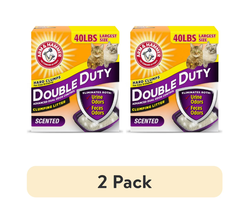 ARM & HAMMER Double Duty Clumping Litter eliminates both types of odors for Advanced Odor Control. Its breakthrough cat litter formula destroys urine and feces odors on contact, and helps keep your home smelling fresh and clean with a fresh scent. ARM & HAMMER cat litter is made with odor absorbing clay and ARM & HAMMER Baking Soda in every scoop to neutralize litter box odor. Rock-solid clumps let you remove the source of odors easily and fresh scent refreshed litter every time your cat uses the kitty litter box. And that’s why an odor-free home starts with ARM & HAMMER clumping cat litter. Plus, with low tracking and 99.9% dust-free formula pour ARM & HAMMER kitty litter from this 40 lb box with confidence. Double Duty Cat Litter destroys urine and feces odors instantly Odor control with powerful moisture activated baking soda crystals, eliminates odors on contact The Double Duty formula is 99.9% dust free and low tracking Kitty litter featuring an easy pour and no-spill spout for less mess Fresh scent refreshes litter every time your cat uses the litter box ARM & HAMMER Double Duty scented clumping litter 40 lb box Features Clumping, Scoopable Scent Scented Animal Type Cat Animal Lifestage All Lifestages Container Type Box Form Crystals Color Gray Brand ARM & HAMMER Count Per Pack 1 Assembled Product Weight 40 lbs Product Line Double Duty Manufacturer Church & Dwight Co., Inc. Manufacturer Part Number 033200024088 Model 033200024088 Size 40 lbs