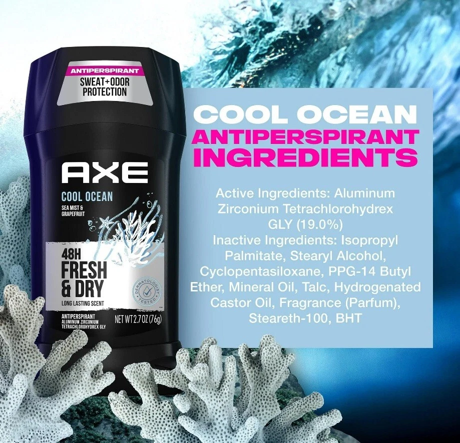 2 Pack Axe Cool Ocean 48H Antiperspirant Deodorant, Sea Mist & Grapefruit, 2.7oz. Axe Cool Ocean Long Lasting Antiperspirant Deodorant Stick, Sea Mist and Grapefruit, Dive into freshness. A scent that feels like endless summer. When opportunity is around every corner, you need a stick deodorant that is going to keep you fresh. With It's 48h High Definition scent and upgraded fragrances, AXE Cool Ocean Deodorant for men has got you covered. An ocean-inspired men's fragrance with light, uplifting essential oils, so you can relax from sunup to sundown. All new AXE Cool Ocean Dual Action Deodorant Stick now features our longest lasting scents ever! Bust odor and smell fresh for 48 hours. Plus. Take care of yourself and the planet. Our video Stick packaging is already made with 66% recycled materials, and by 2025 AXE aims for all our packaging to be recyclable or to include recycled materials. At AXE, we believe that one of the keys to attraction is an irresistible fragrance. We are dedicated to giving you all the tools to ensure that whenever opportunity arises, you smell your absolute best. From our body spray to our shower gels, our Antiperspirants to our deodorants, we are doing everything we can to make sure no one gets left out of the attraction game. All new AXE. The future smells amazing. Smell irresistible all day with all NEW and upgraded AXE Cool Ocean Dual Action Antiperspirant Deodorant for men Anti-sweat, smell fresh with our first Dual Action Antiperspirant for men with enhanced sweat fighters An irresistible smelling Antiperspirant. Let the iconic combo of Cool Ocean scent with Essential oils keep you dry and odor free all day with every swipe Cream deodorant goes on invisible, leaving no white marks or yellow stains Apply AXE Antiperspirant deodorant to clean, dry underarms and feel fresher for longer with every swipe