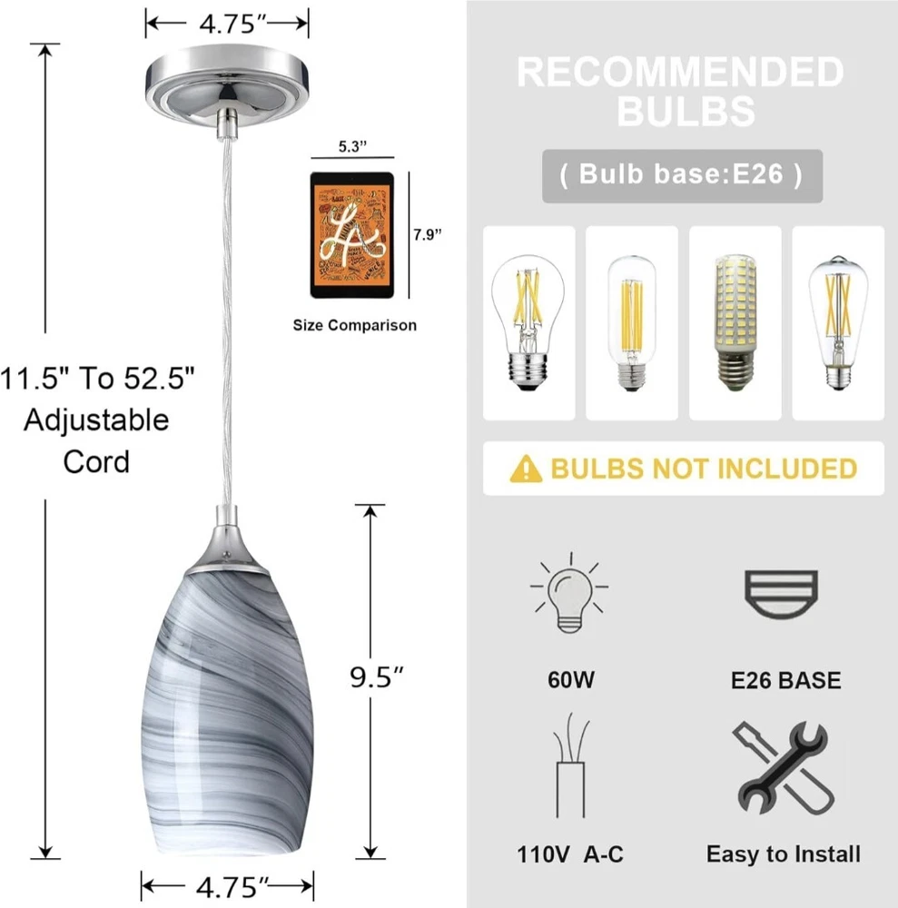 【Easy to Install】 Our hanging light fixtures come with a convenient installation pack (included mounting screws and wire connectors) to make it very safe and easy to mounts to the ceiling. 【Bulb Requirements】 The light socket is standard medium E26 model, suit for Incandescent Bulb (60W)/LED Bulb (12W)/CFL Bulb (13 W)/Halogen Bulb (43 W), bulb is not included. 【Wide Application】 This Pendant light fixture with simple and modern design perfect for a variety of decors style ranging from vintage industrial to modern transitional, especially bedroom, living room, dining room, kitchen, hallway, loft and any living areas.