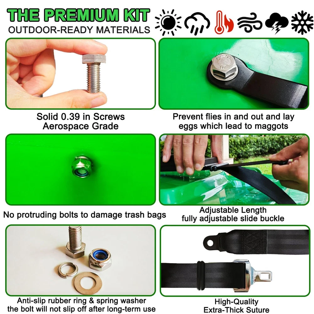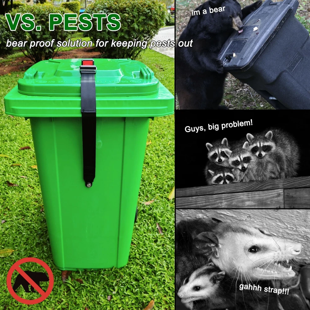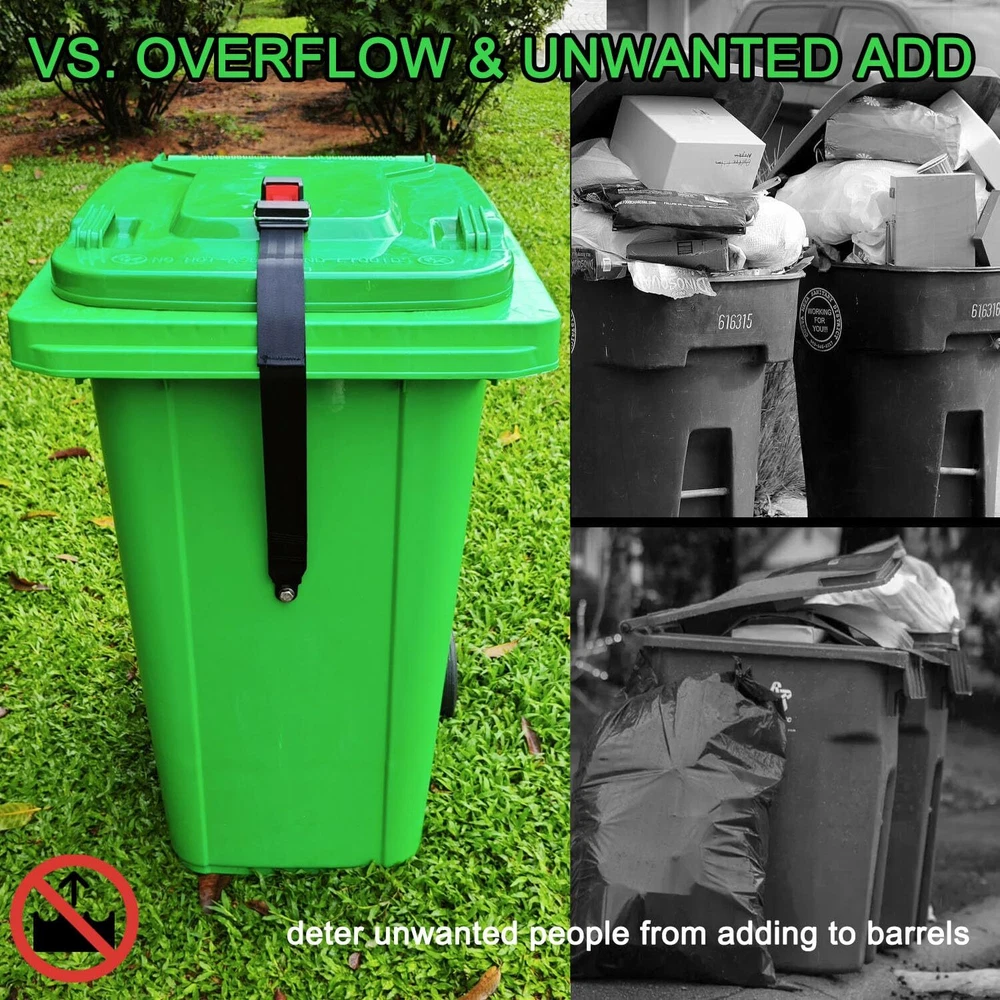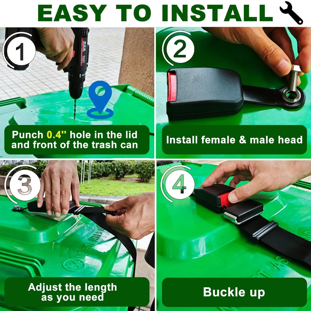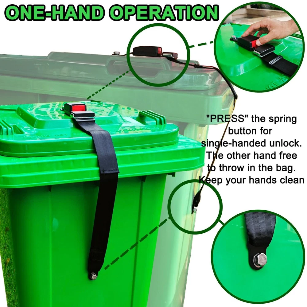 TRASH CAN LOCK BELT: Your unlocked bin may not meet the modern neat standard. Prevent animals from accessing trash with our advanced animals deterrent for garbage cans. The trash can lock is made of high-strength polyester and metal lock for trash can, which can keep trash secure and wildlife out. UNIVERSAL GARBAGE LID LOCK: Bear trash can locks are suitable for 30 to 95-gallon bins. Keep the waste container's lid shut using this trash bin lock. Our bear locks for garbage cans perfectly fits into curbside rubbish & recycling bins or carts of various sizes, with/without handles, containing any waste stream. This trash can lid lock can withstand up to -76°F to + 140°F, providing an optimal locking mechanism! ONE-HAND OPERATION: 'PRESS' the spring-loaded button of the Semi-Automatic trash can locks for single-handed use. The other hand free to throw in the bag. Keep your hands clean! This garbage can lid lock is convenient and quick for daily use with with its bear straps for garbage can. NO SWEAT INSTALLATION: (1)Just punch 0.4'' hole in the lid and front of the trash can. (2)Install the male and female straps with screws and nuts respectively. (3)Buckle up! Don't worry about your yard being filled with trash the next morning. WITHSTAND SEVERE WEATHER: Experience the advantages of wind, storm, sun and animal resistant trash bin lock guard without having to unlatch your trash can. Leave the trash can lock for animals latched on your bins when put out for collection. SMART DESIGN: Enhance the inherent utility of your waste containers with our trash can locks in one-piece design with no moving parts. With proper installation, Semi-Automatic trash lock helps solve the lost trash problem at the source, resulting in significantly better environmental and commercial outcomes.